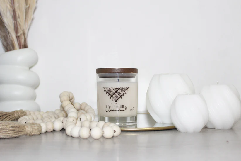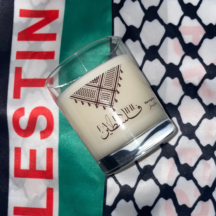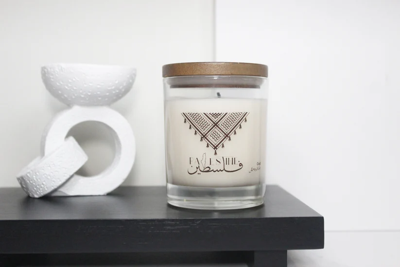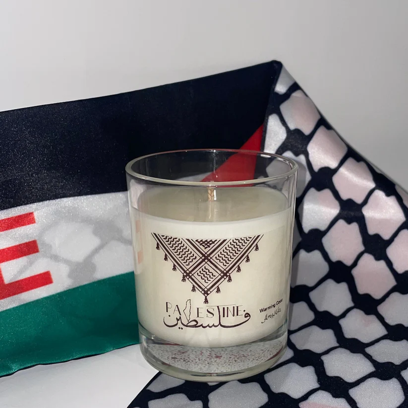 Experience a unique scent with our Keffiyah design candle. Not only will you enjoy the fragrant aroma, but 25% of profits will go towards supporting Palestine. The reusable jar also promotes sustainability. Show your support and add a touch of culture to any space with our Keffiyah Candle. Support a good cause while indulging in the finest of scents