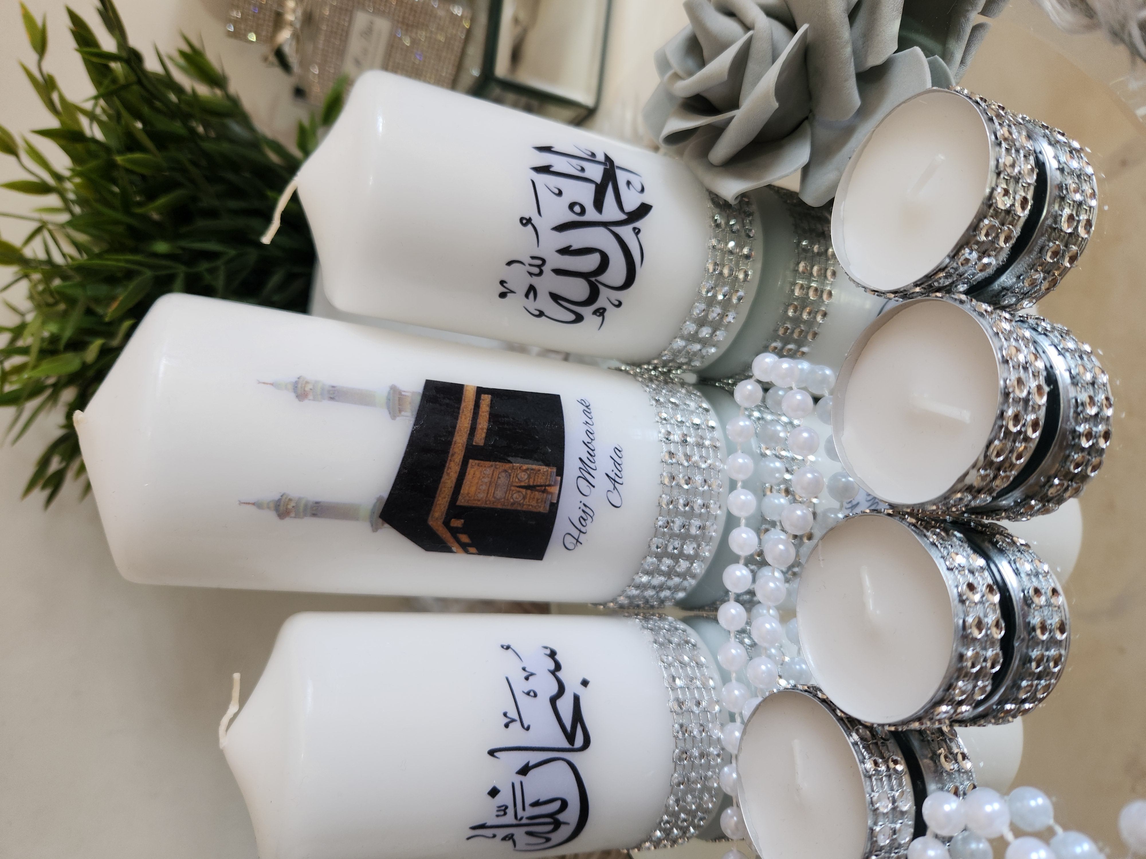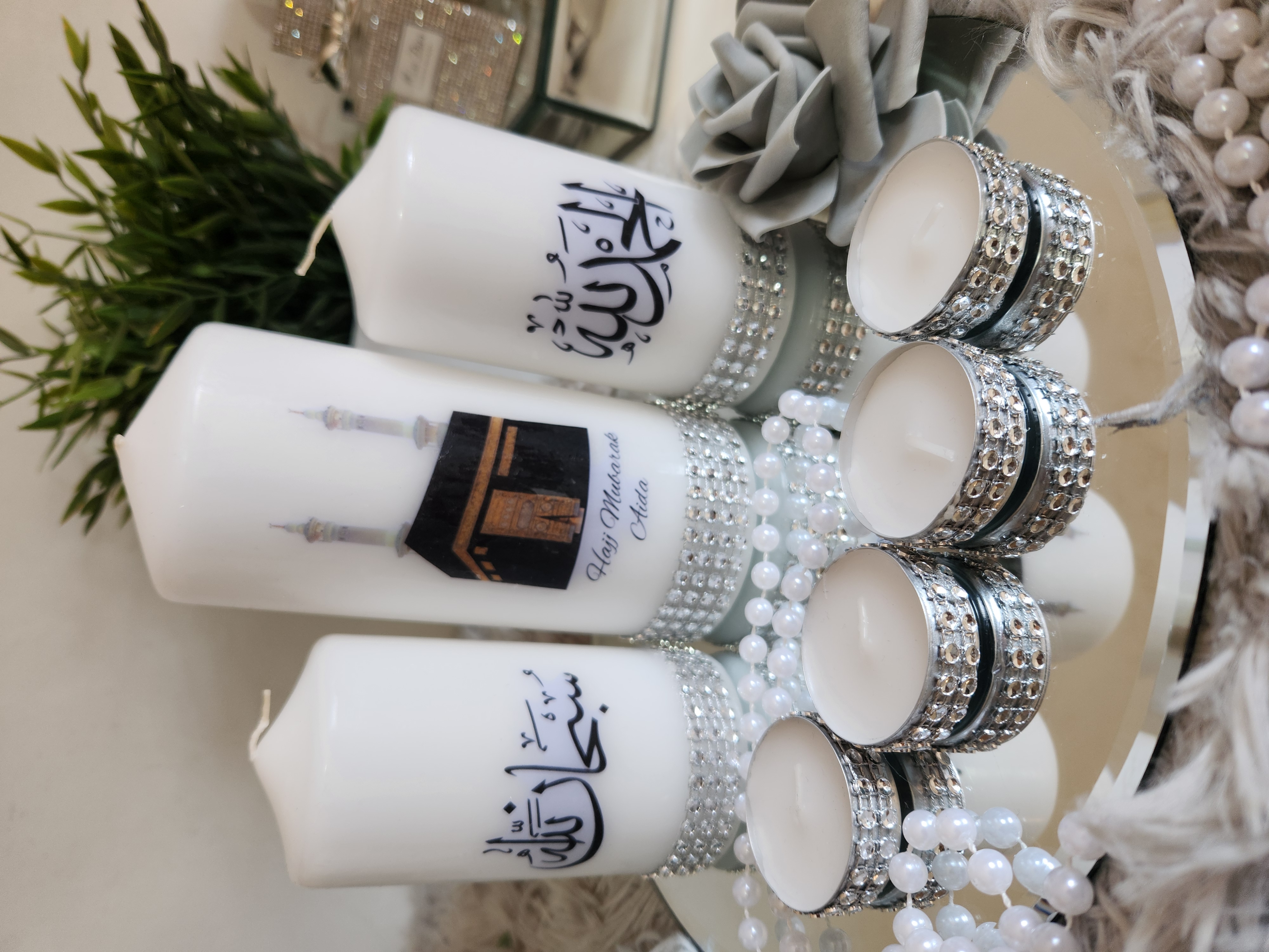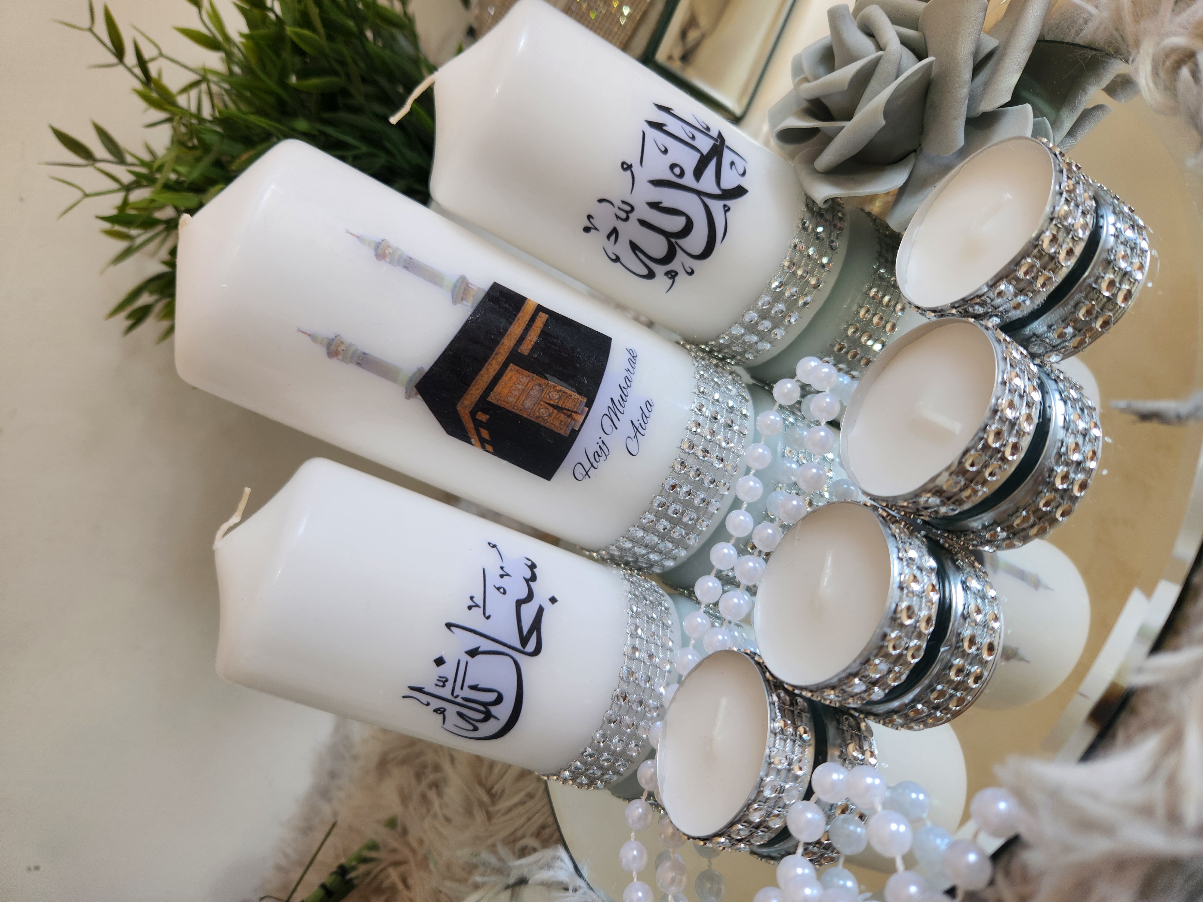 Islamic Candle Gift Set, Khana Kabah Candle with text Umrah Mubarak or Hajj Mubarak .Please leave a Note whattext do you want. Package Included: 1 Large Candle 2Medium Candles 4Tealights 1 mirror Plate Can be make with other words and Surah . Contact us for Customized Candles. Instagram: BespokeBlingCandles |