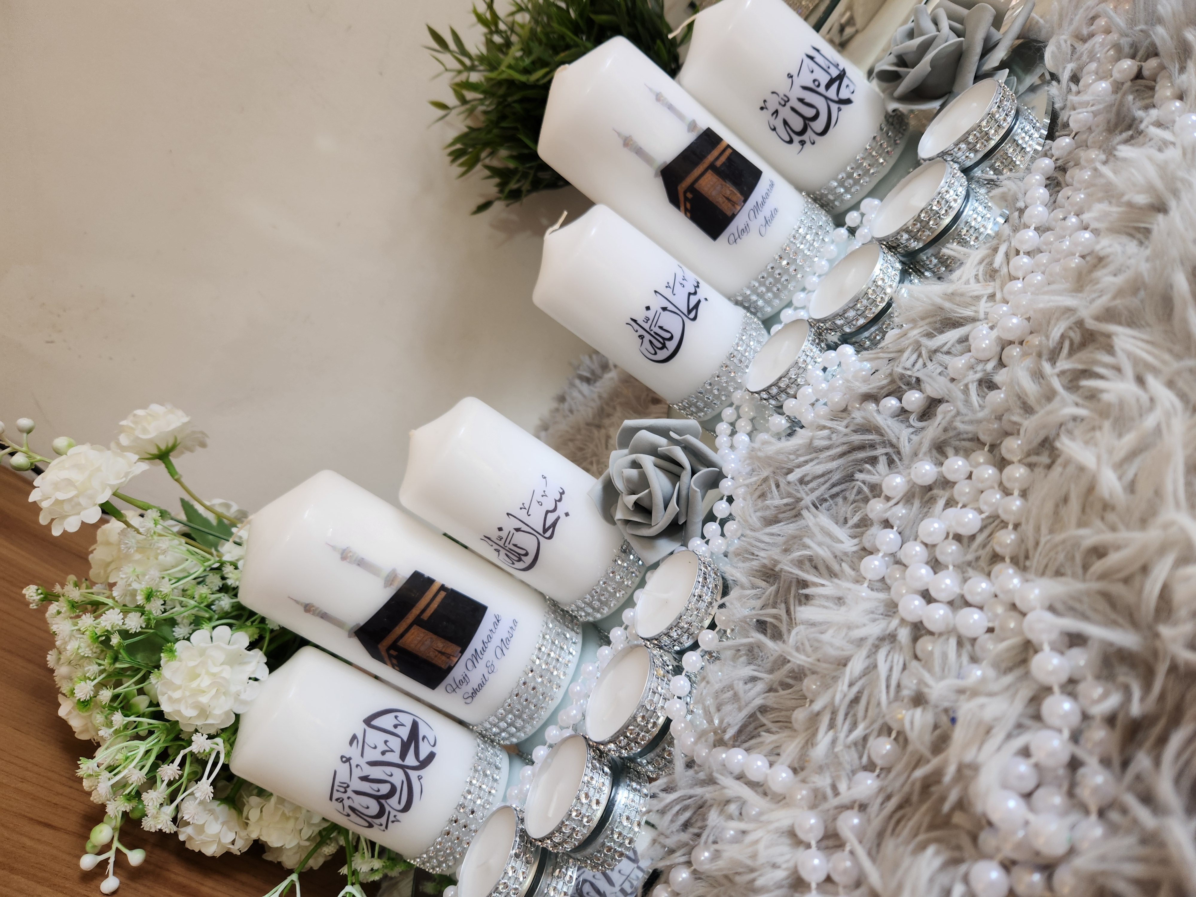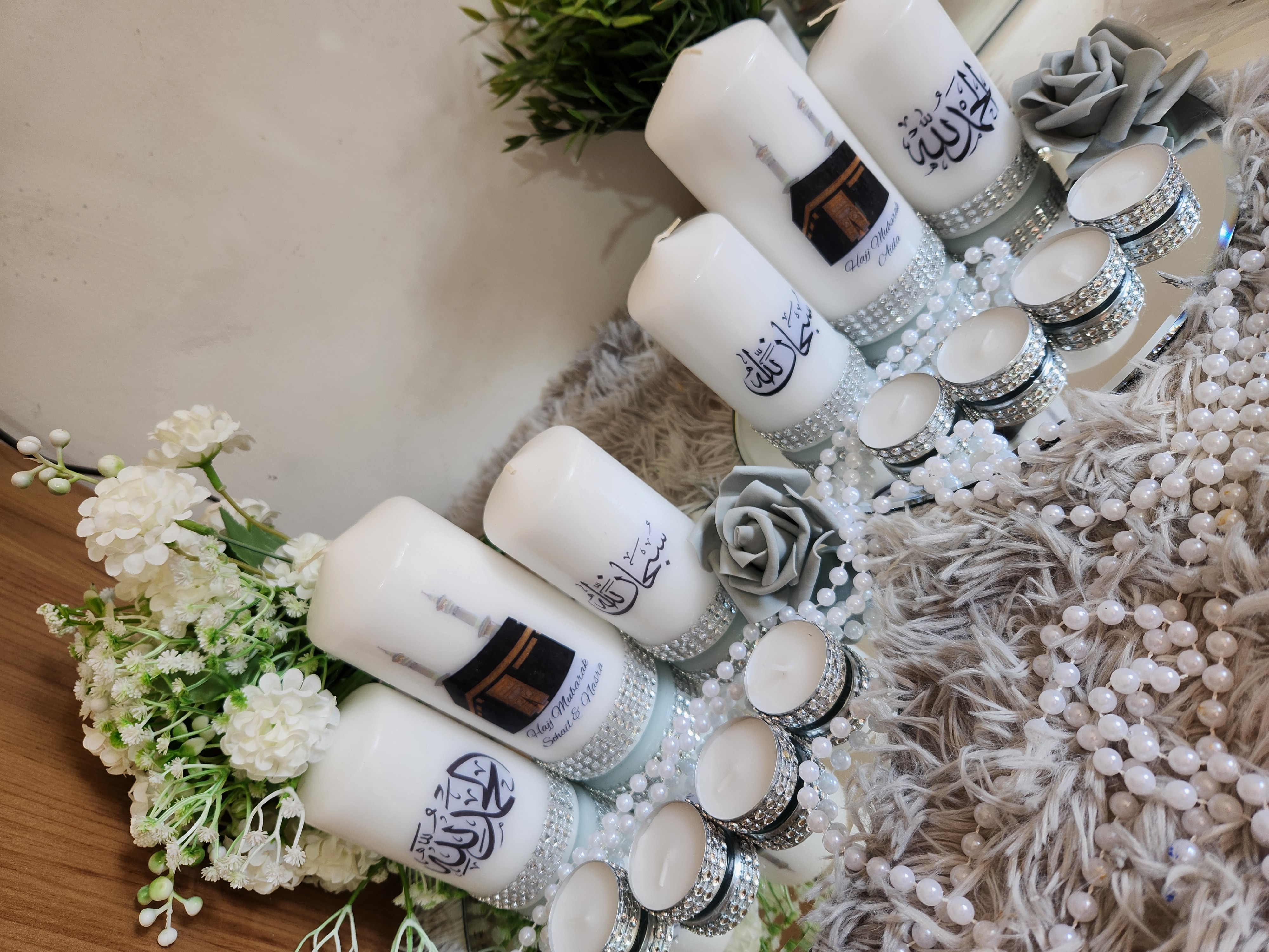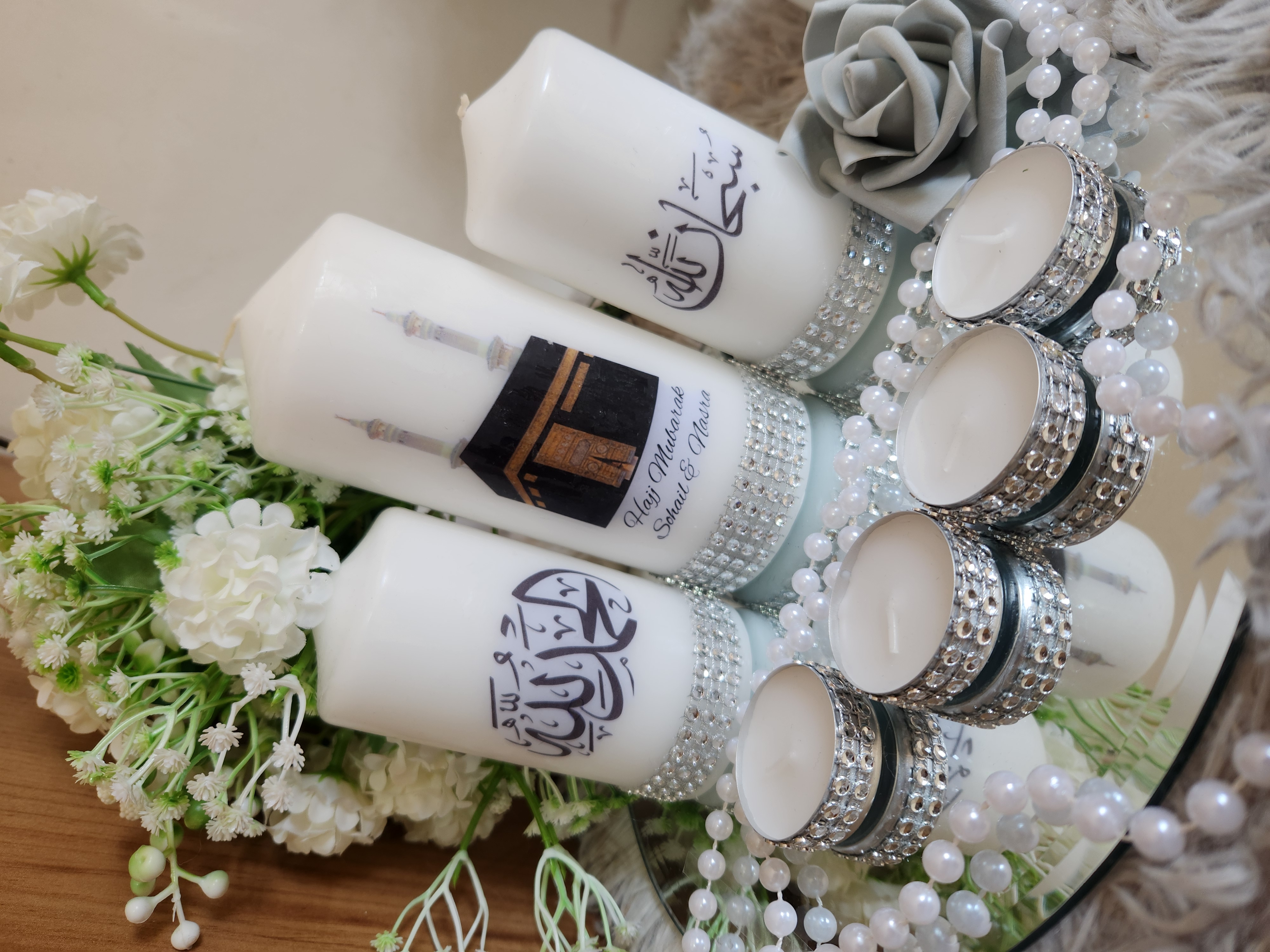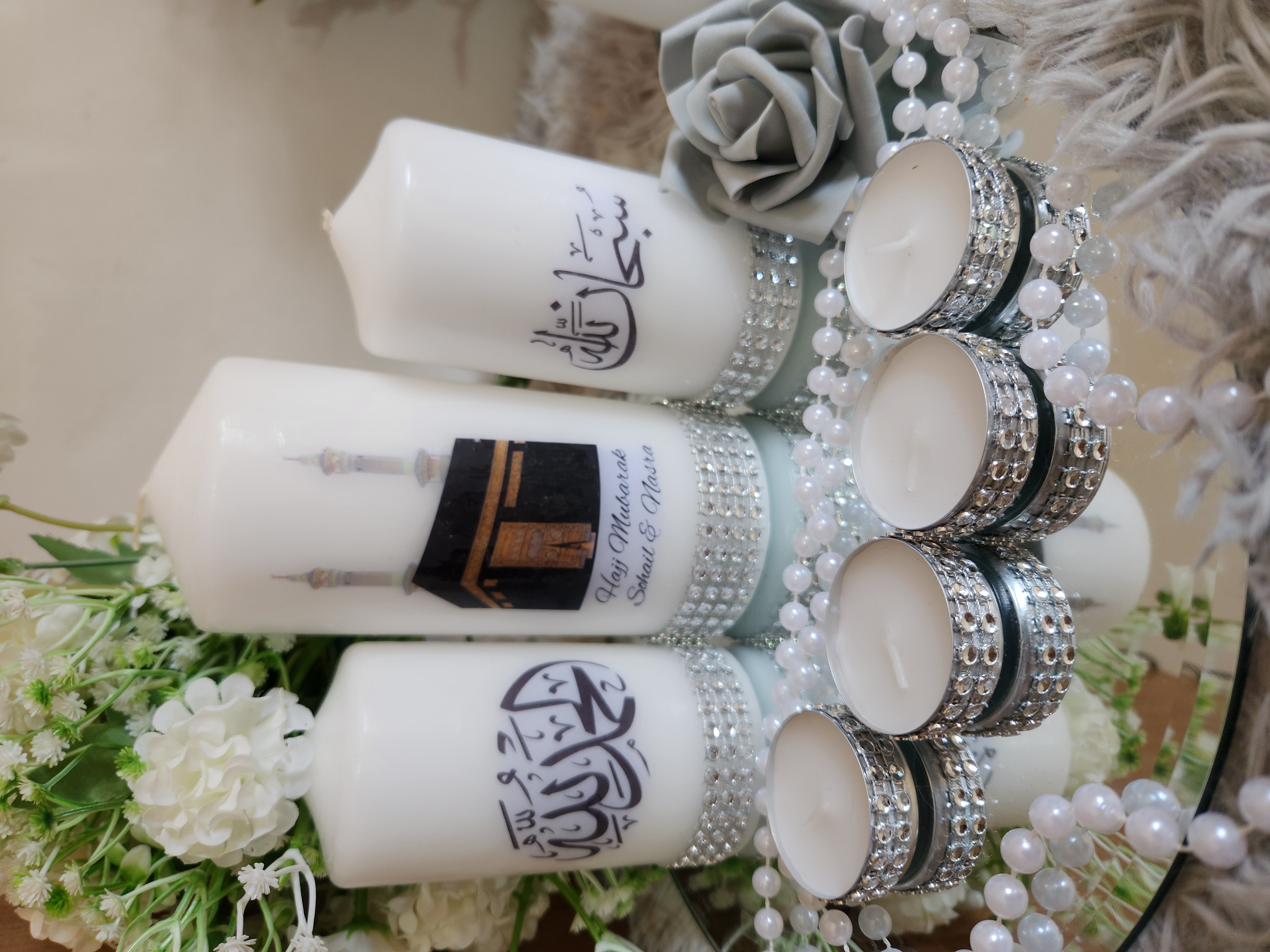 Islamic Candle Gift Set, Khana Kabah Candle with text Umrah Mubarak or Hajj Mubarak .Please leave a Note whattext do you want. Package Included: 1 Large Candle 2Medium Candles 4Tealights 1 mirror Plate Can be make with other words and Surah . Contact us for Customized Candles. Instagram: BespokeBlingCandles |