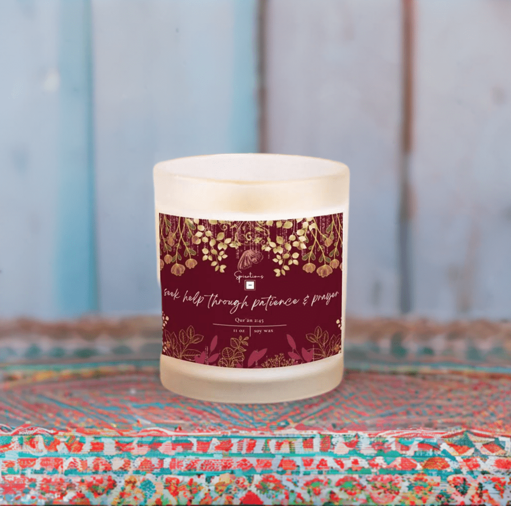 Stunning floral design candle features Quran verse 2:45 - {Surah Al-Baqarah} "seek help through patience & prayer."