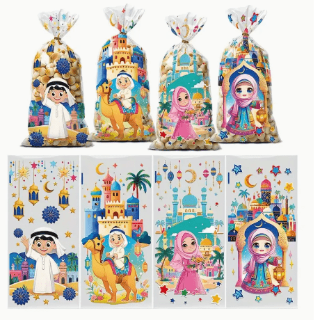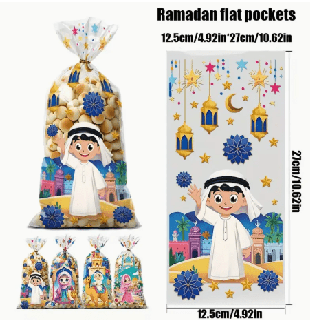 50pcs Moon Castle Semi-Transparent Flat Gift Bags - Ramadan & Eid al-Fitr Party Favors - Waterproof, Reusable Islamic Holiday Present Wraps with Colorful Islamic Designs - Hand Wash Only, Gift Bags for Ramadan.