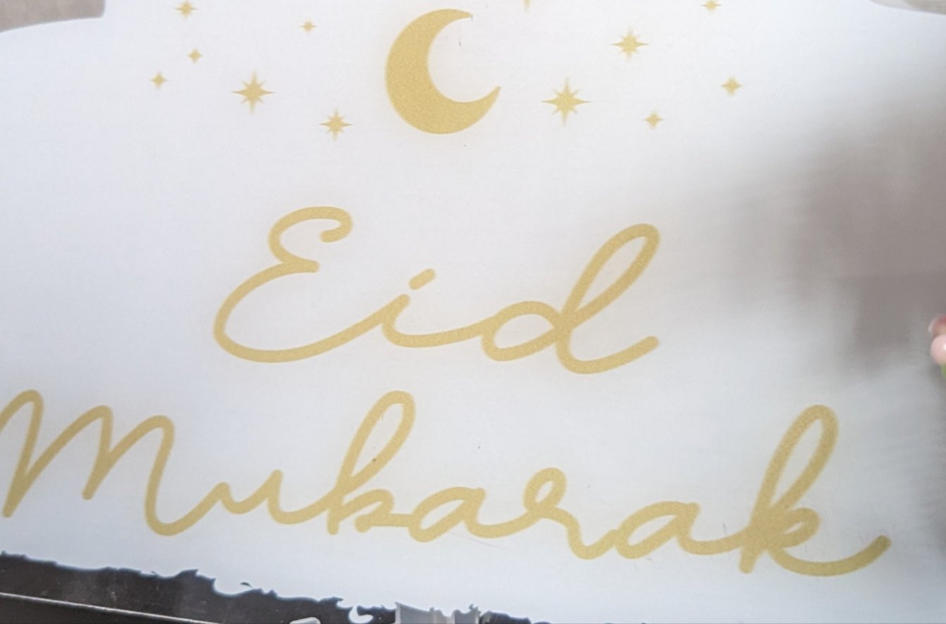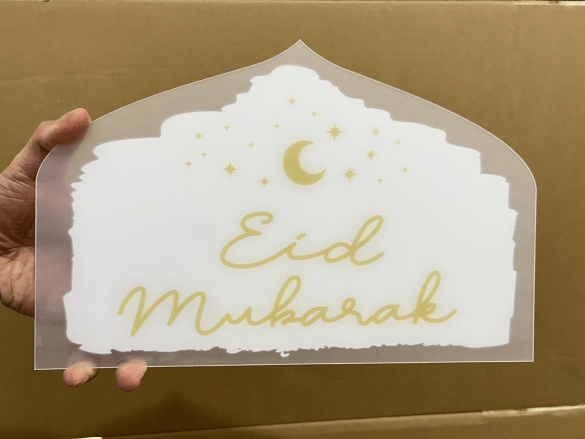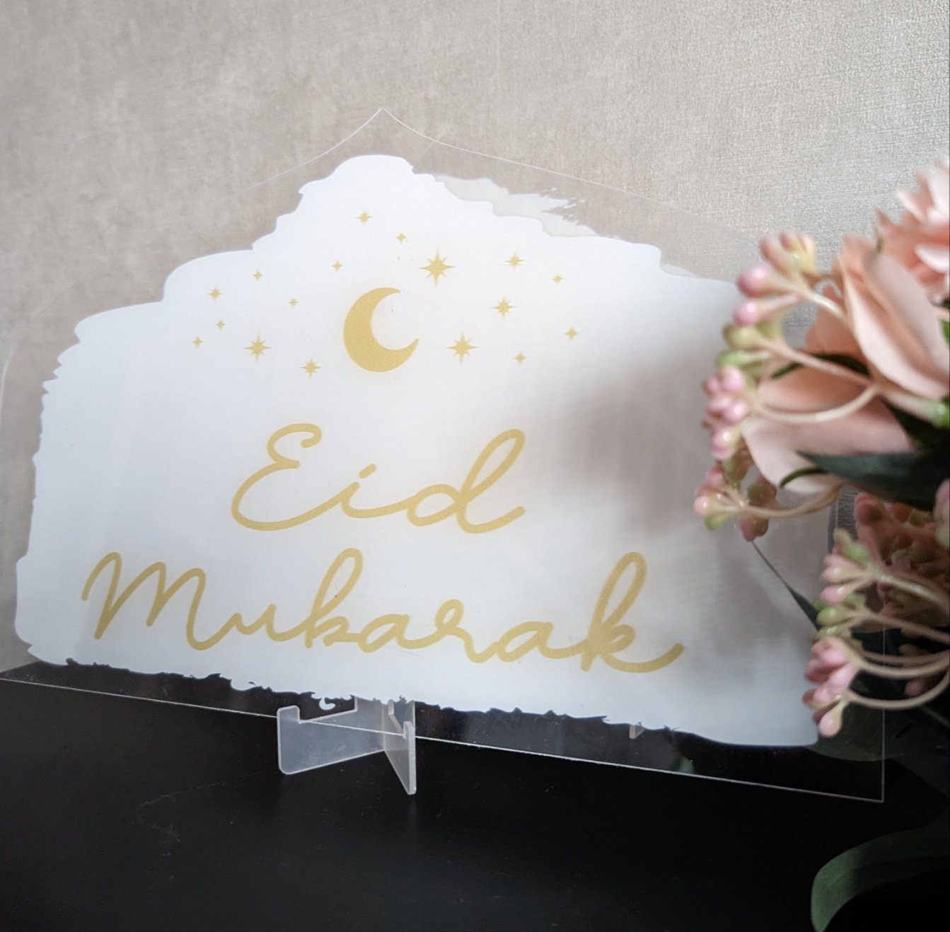 Create the perfect centrepiece with this Eid Mubarak Acrylic White & Gold Table Sign.