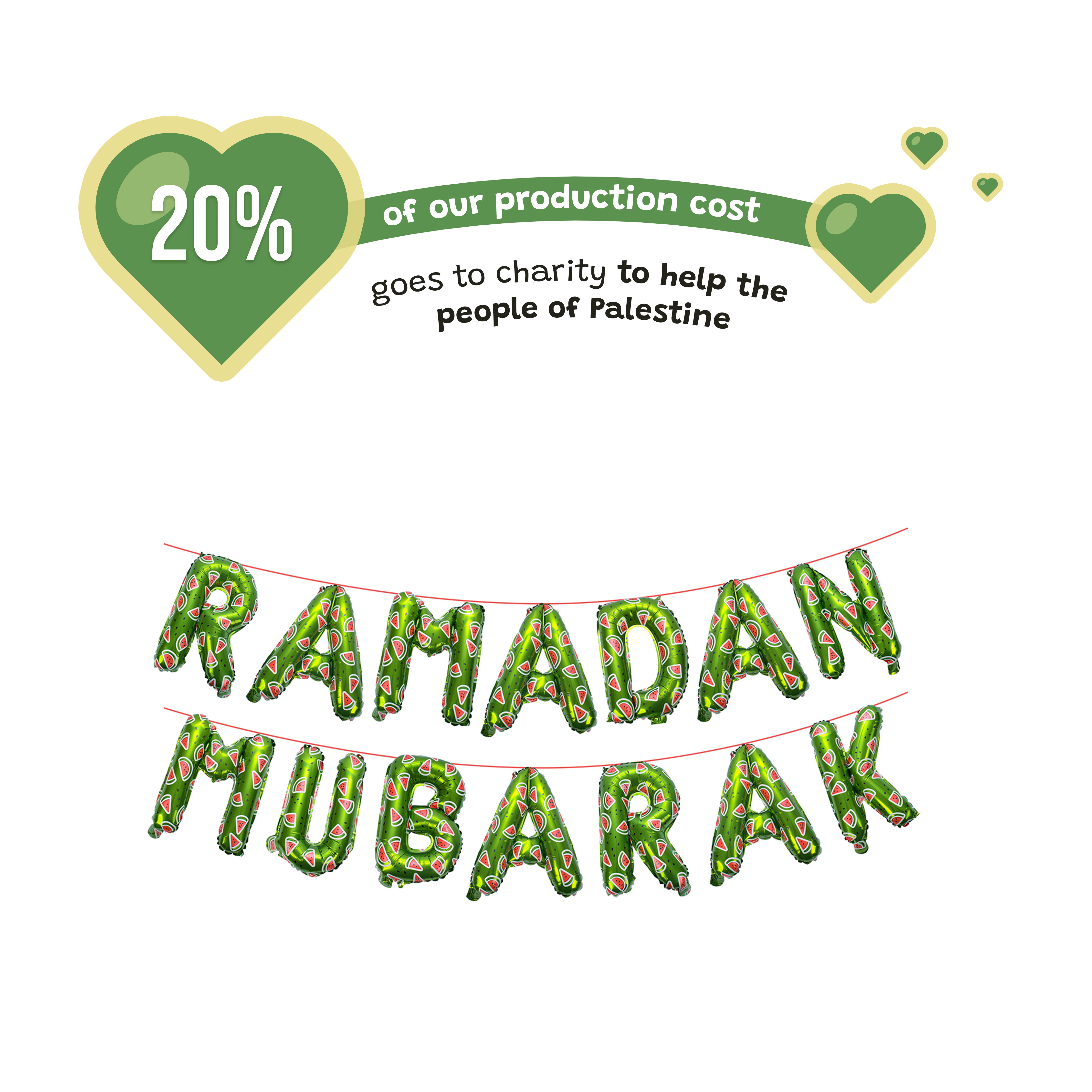 This set is more than just décor—it’s a way to celebrate with purpose. Inspired by the watermelon’s symbolism of resilience and solidarity, 20% of the production costs for this set are donated to charities that provide aid to Palestine. Your purchase not only creates a joyful Ramadan atmosphere in your home but also contributes to a meaningful cause, reflecting the true spirit of this sacred month.