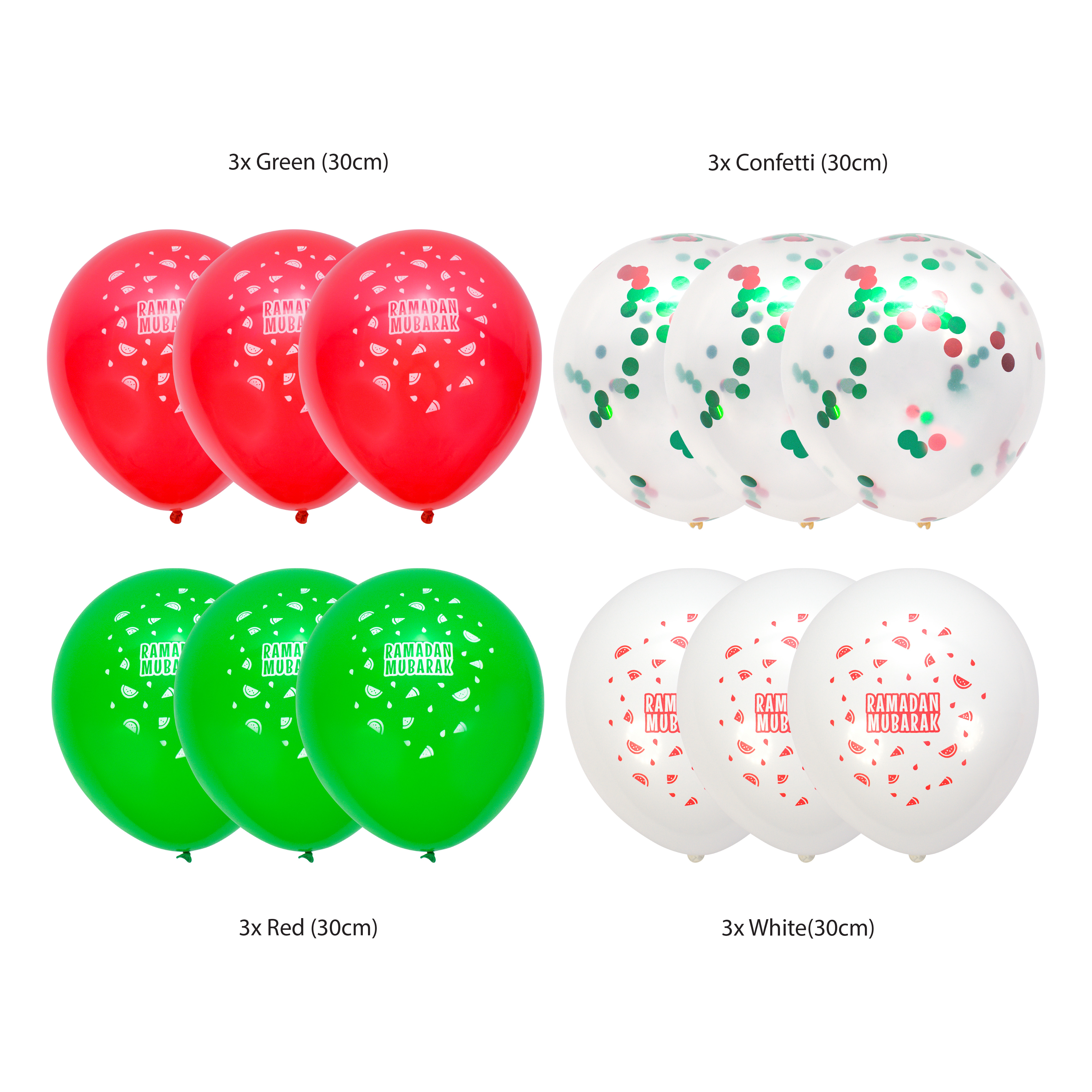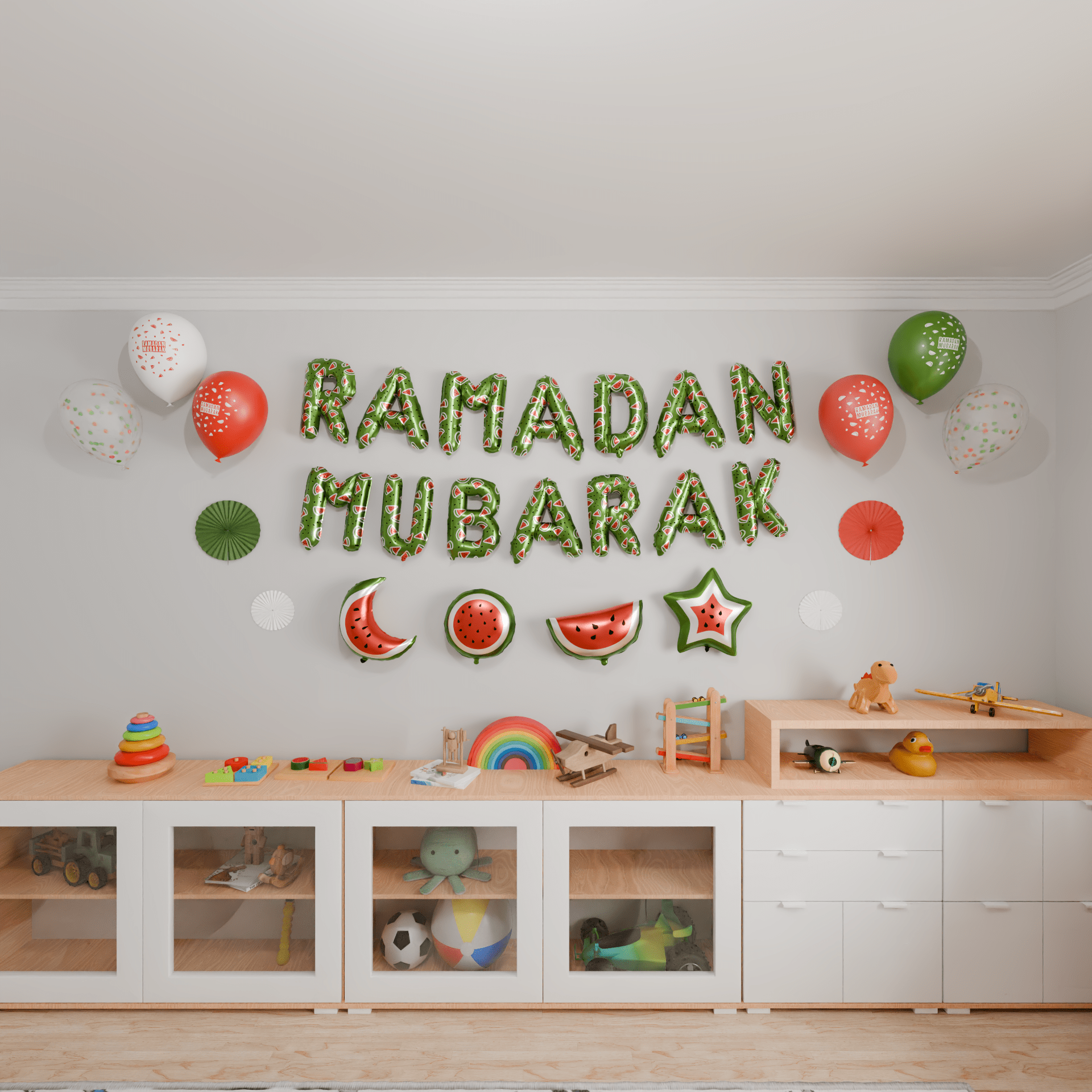 - Watermelon Crescent & Star Foil Balloons: A charming set of four foil balloons shaped as crescents and stars, adorned with delightful watermelon patterns. These iconic symbols of Ramadan beautifully enhance your decorations, making your space feel warm and festive.