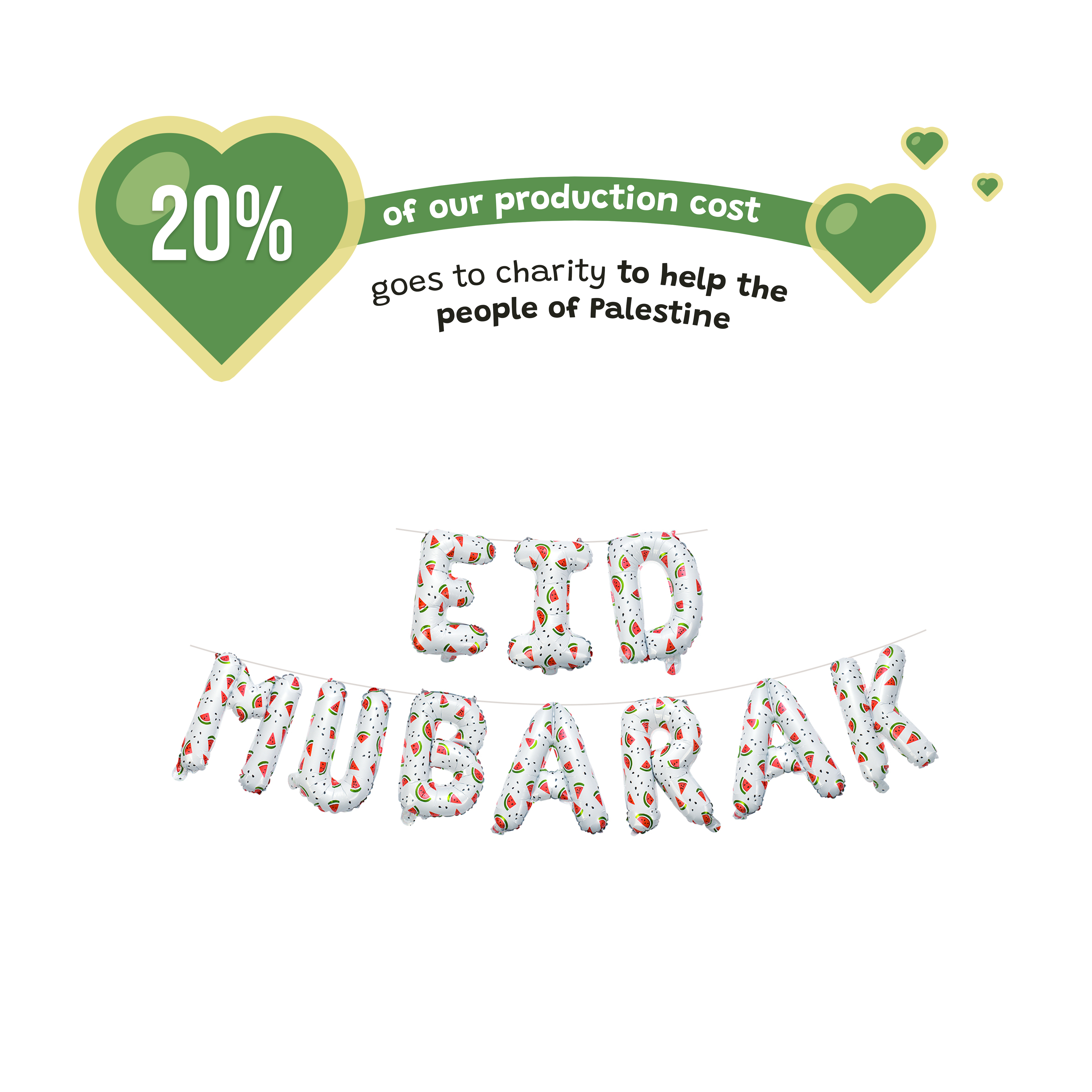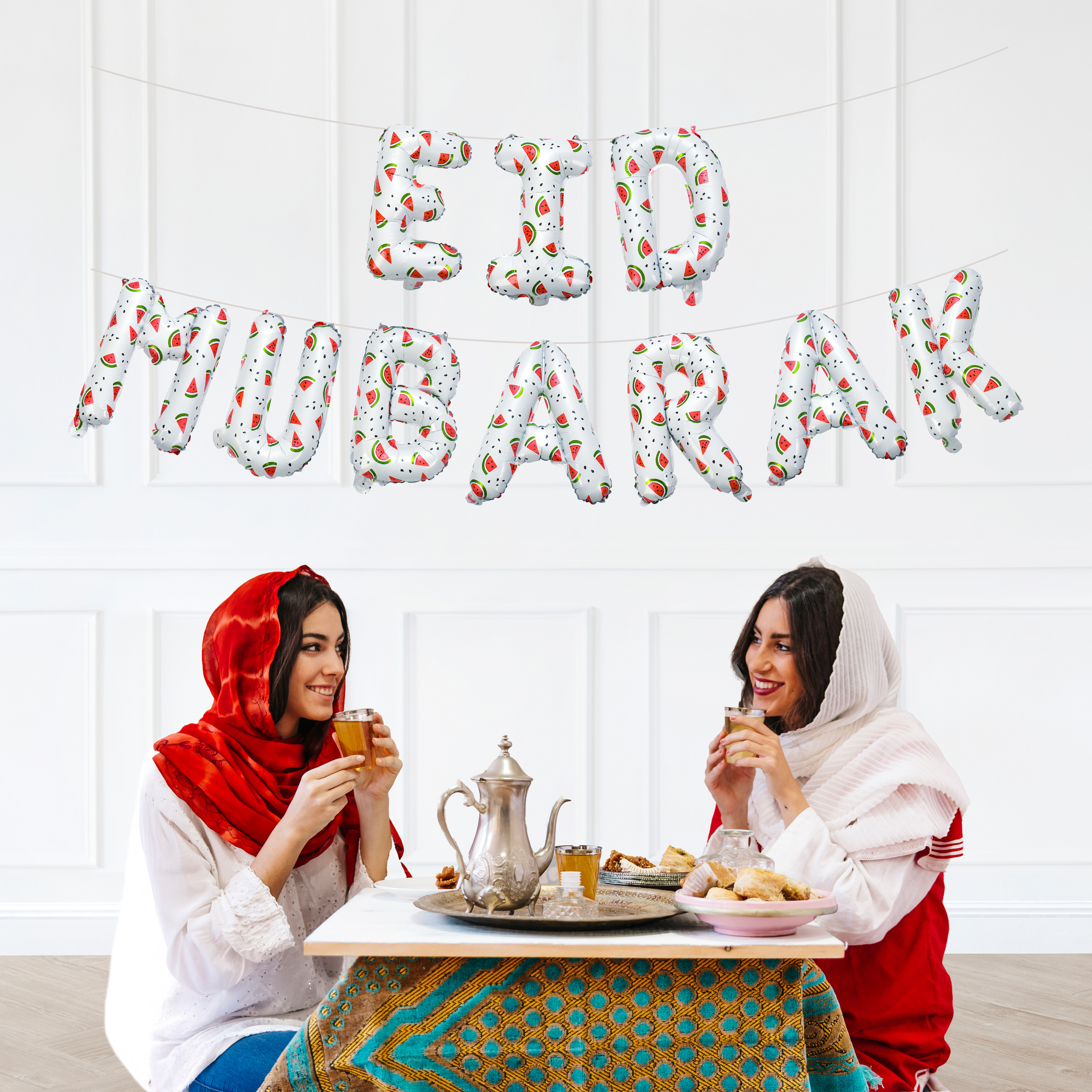 - White Watermelon Eid Mubarak Foil Letter Balloons: A bold yet sophisticated statement, these foil balloons spell out "Eid Mubarak" in crisp white with watermelon-inspired accents. Perfect for creating a serene and festive backdrop that exudes grace and joy.