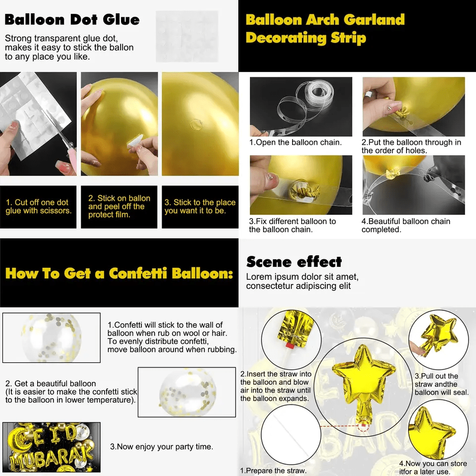 Set includes Foil Balloons, Card Bunting, latex balloons, ribbon and glue dots.