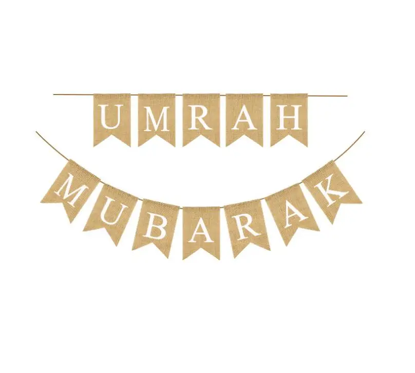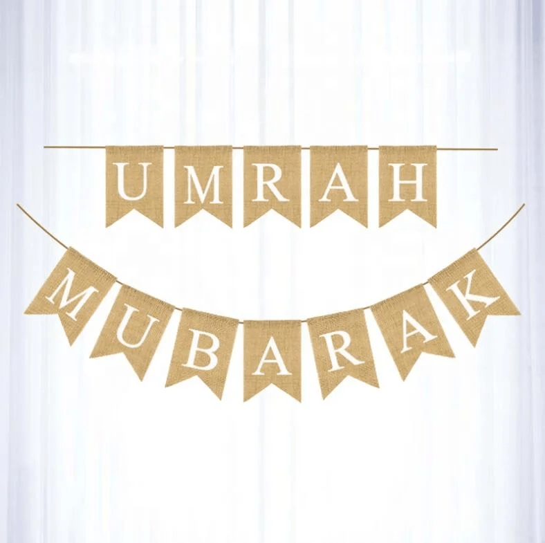 Our new 'Umrah Mubarak' pennant shaped fabric bunting is printed on quality Hessian / Burlap Fabric . A wonderful rustic banner is sure to make an impact at your party celebrating the return of loved ones from their journey to Makkah and Medina.