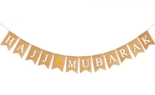 Our new 'Hajj Mubarak' pennant shaped fabric bunting is printed on quality Hessian / Burlap Fabric . A wonderful rustic banner is sure to make an impact at your party celebrating the return of loved ones from their blessed pilgrimage