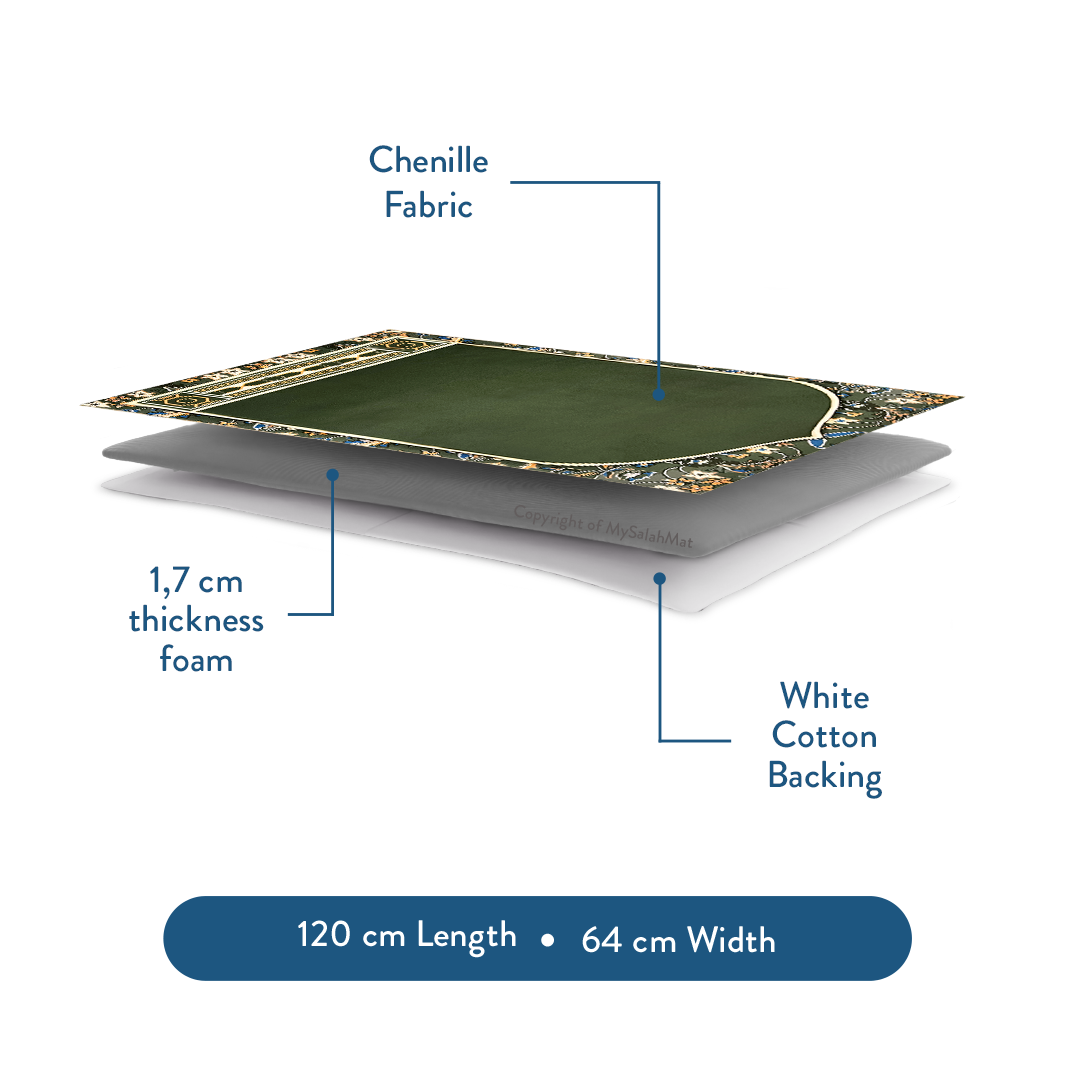Crafted with velvety-soft fabric and cushioned with 1.7 cm of thick foam padding, it offers exceptional comfort and support for your knees and feet. The refined border detailing adds depth and character, while the three-layer construction ensures durability for long-term use. Finished with a white cotton back layer, this prayer mat stays secure and stable on any surface.