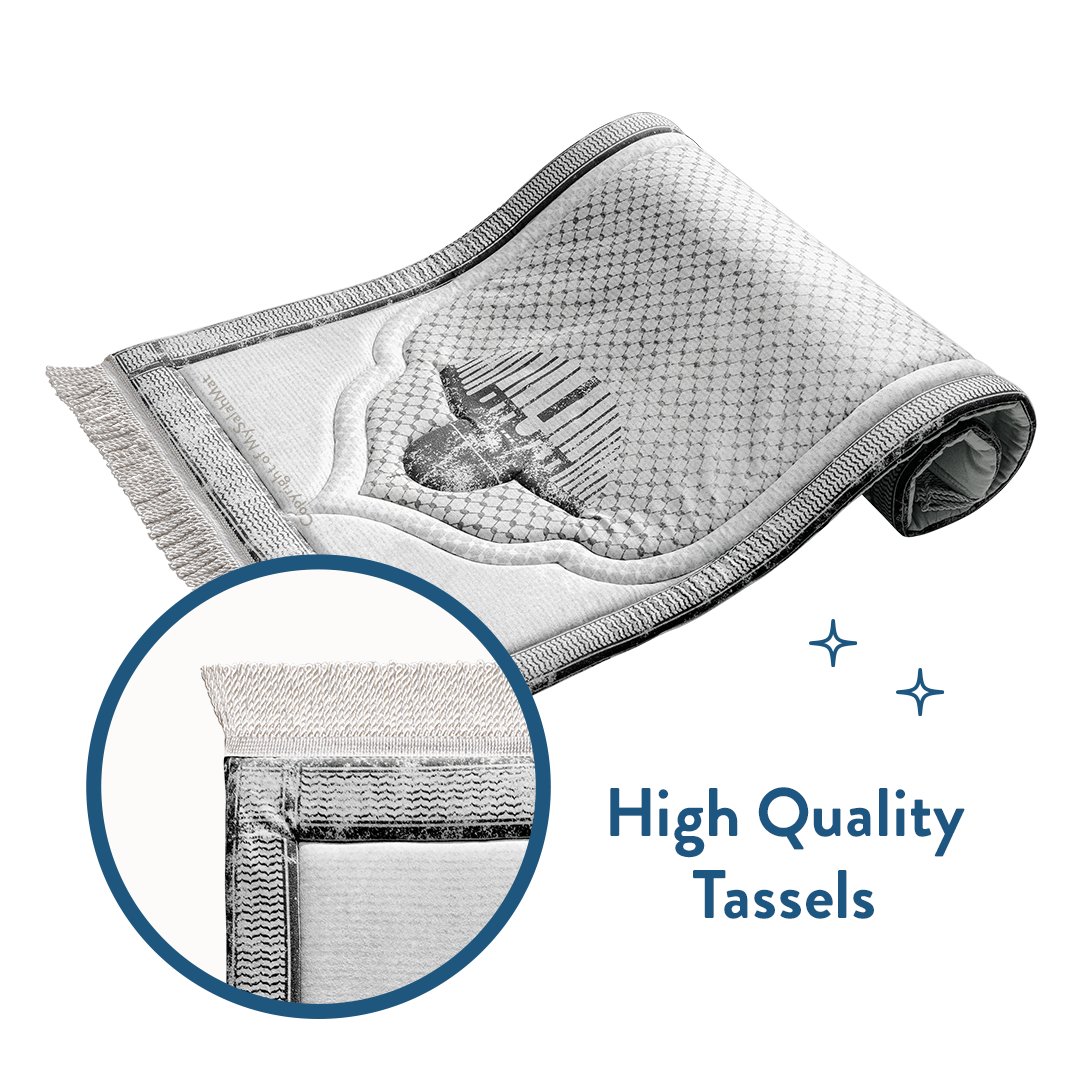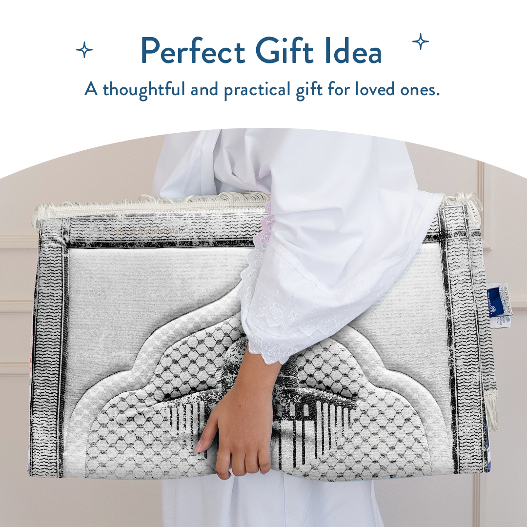 Urban Rugs UK presents the Adult Padded Prayer Mat with Palestinian Kufiya Design, a powerful blend of faith, comfort, and heritage. Inspired by the iconic black-and-white Kufiya pattern, this mat symbolises resilience, identity, and unity while offering a serene and dignified addition to your prayer space.
