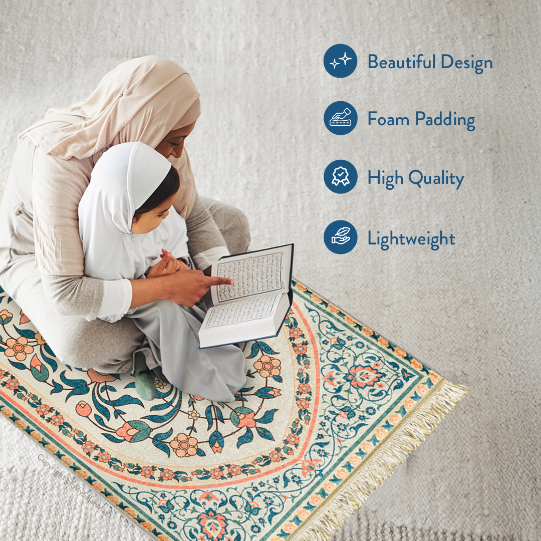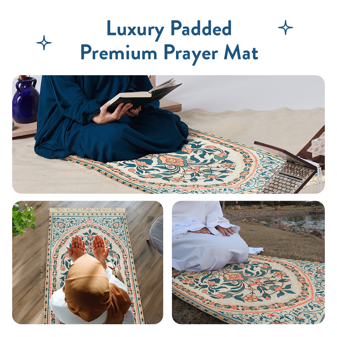 This luxury padded prayer mat blends beauty, comfort, and tradition, making it an ideal choice for daily salah or as a meaningful Islamic gift.