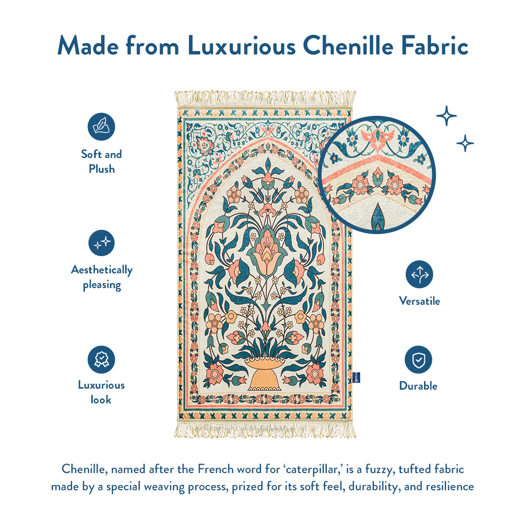 Made with velvety-soft fabric and padded with 1.7 cm of thick foam, this mat offers superior cushioning for your knees and feet. The engraved detailing enhances the design with depth and texture, while the three-layer construction ensures long-lasting durability. The white cotton back layer provides non-slip stability, giving you comfort and peace of mind in every salah.