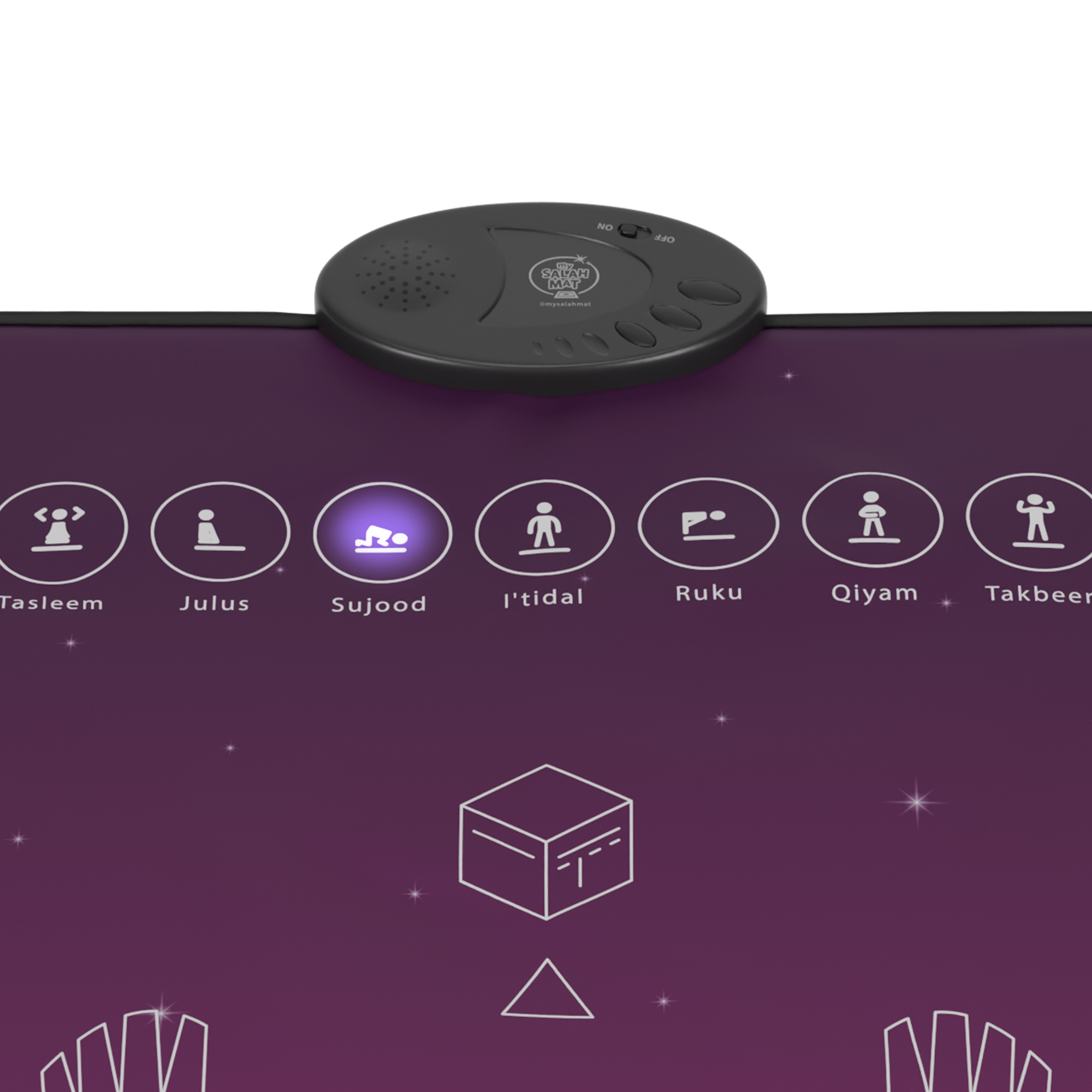 Built-In Sensors! The My Salah Mat for Adults is equipped with touch-sensitive sensors placed where the hands, feet, and forehead go during prayer. These sensors respond to your movements, providing real-time instructions, Qur’an recitations, and Duas to help you confidently perform Salah.