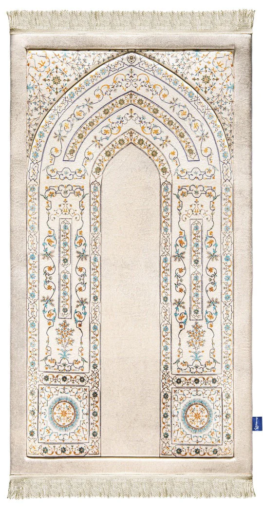 Experience luxury and comfort in your salah with our hand-sewn UK prayer mat, featuring an Antique Indian Arch design inspired by traditional Mughal architecture. This modern prayer mat blends intricate floral and geometric detailing with a timeless elegance, creating a serene space for worship.