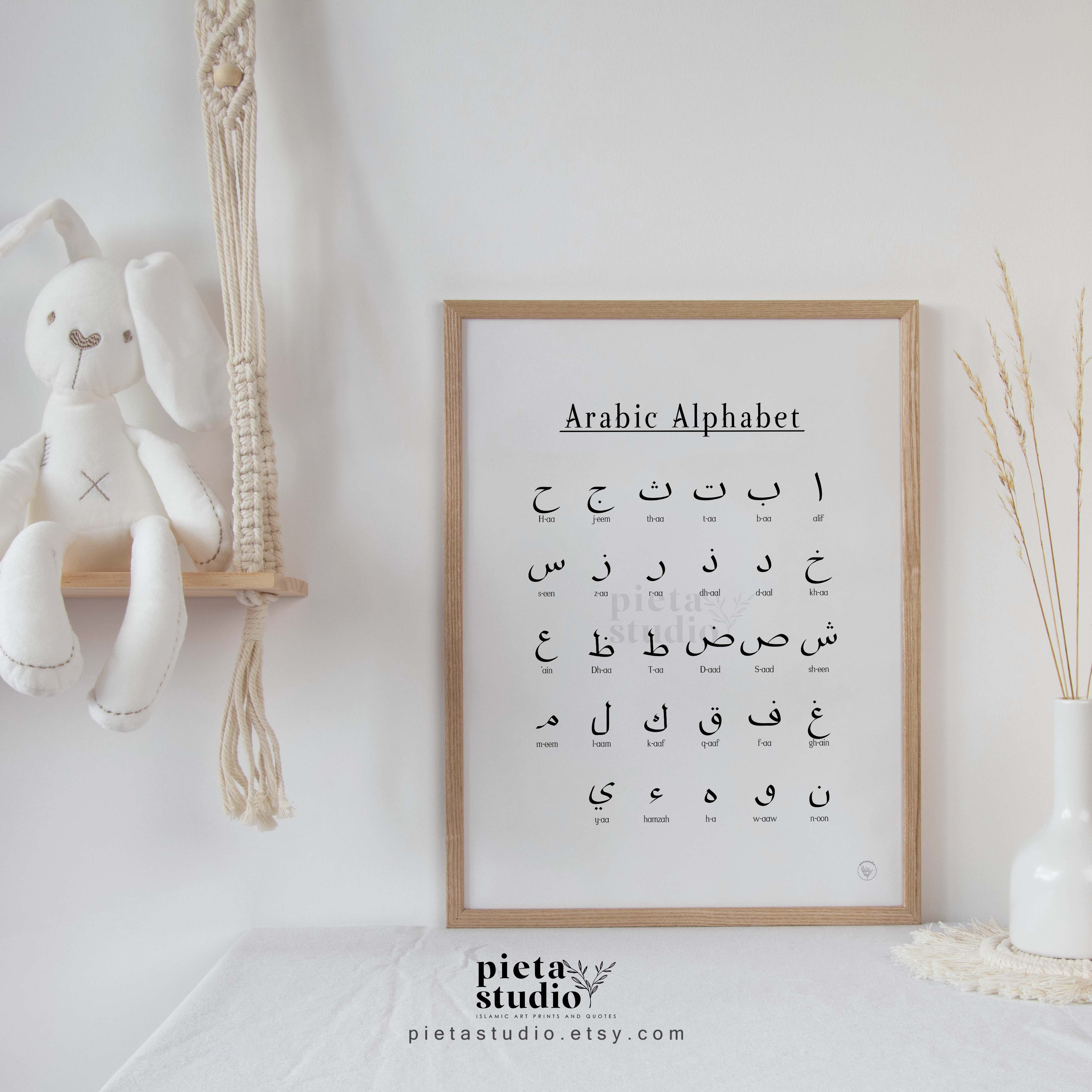 Beautiful Arabic alphabet poster print to help your kid learn Arabic. Decorate your home and kid’s room with this Islamic calligraphy wall art. Available in instant download you could print by yourself or your preference print store