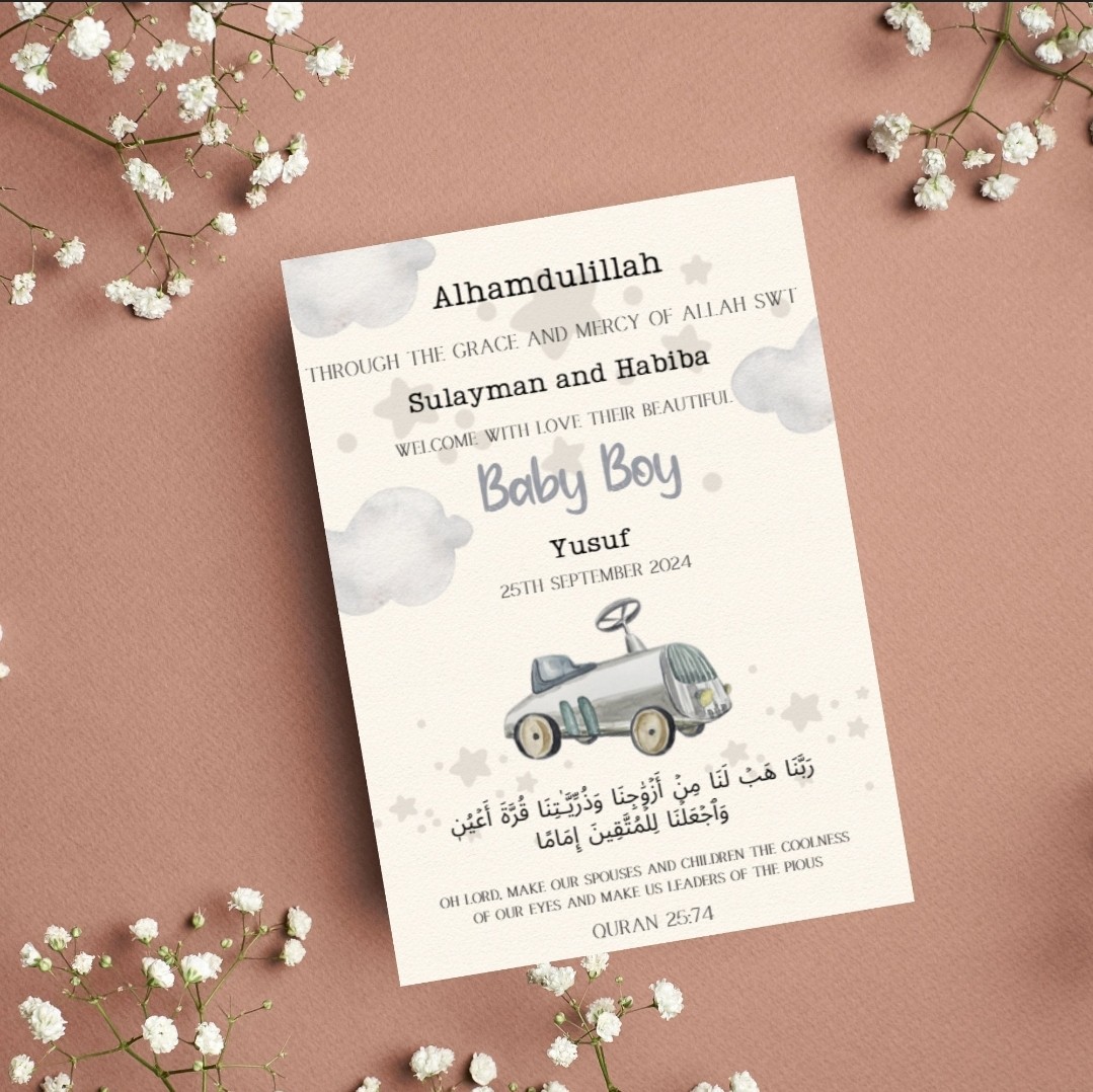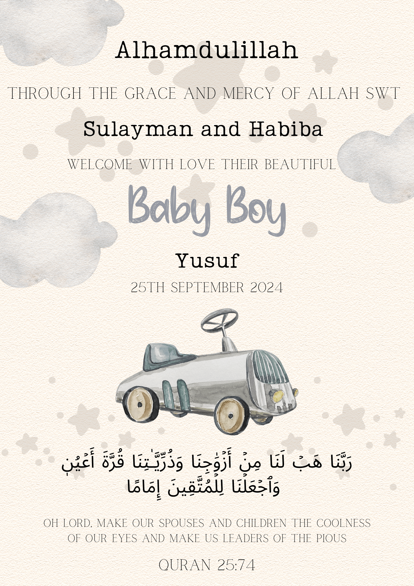 Celebrate the arrival of your precious little one with our custom-made Birth Announcement Card! This charming and personalised card is the perfect way to share the joyous news of your baby boy's arrival with friends and family.