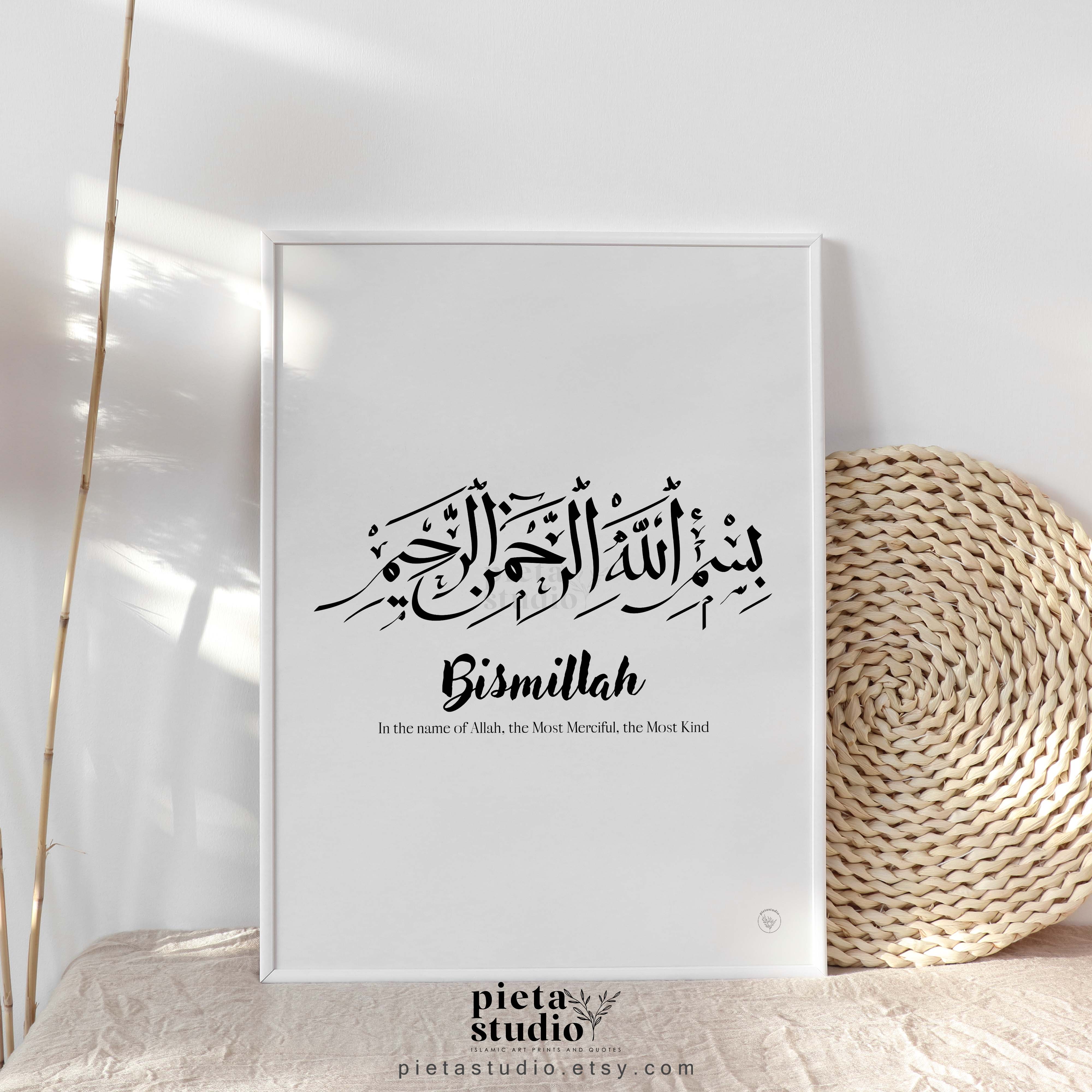 Beautiful Islamic calligraphy wall art of a Quran Surah Al Fatihah verse 1, bismillahirrahmanirrahim calligraphy wall art to remind you about Allah and faith. Decorate your home and daily life with this Islamic calligraphy wall art. Available in instant download you could print by yourself or your preference print store