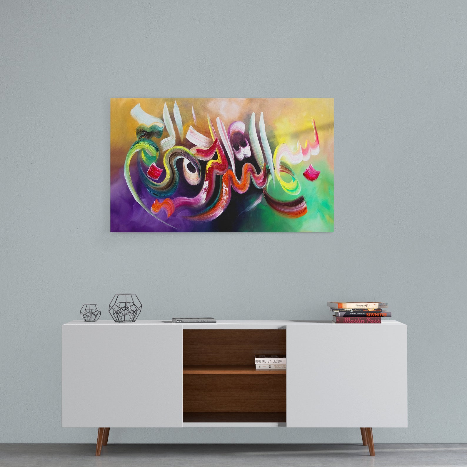 Bismillah-ir-Rahman-ir-Rahim بسم الله الرحمن الرحيم meaning “In the name of Allah, the Most Gracious, the Most Merciful.” A person begins any task with these words which includes Allah’s (God’s) name (with sincerity in his heart), he will enjoy Allah’s support and succour.