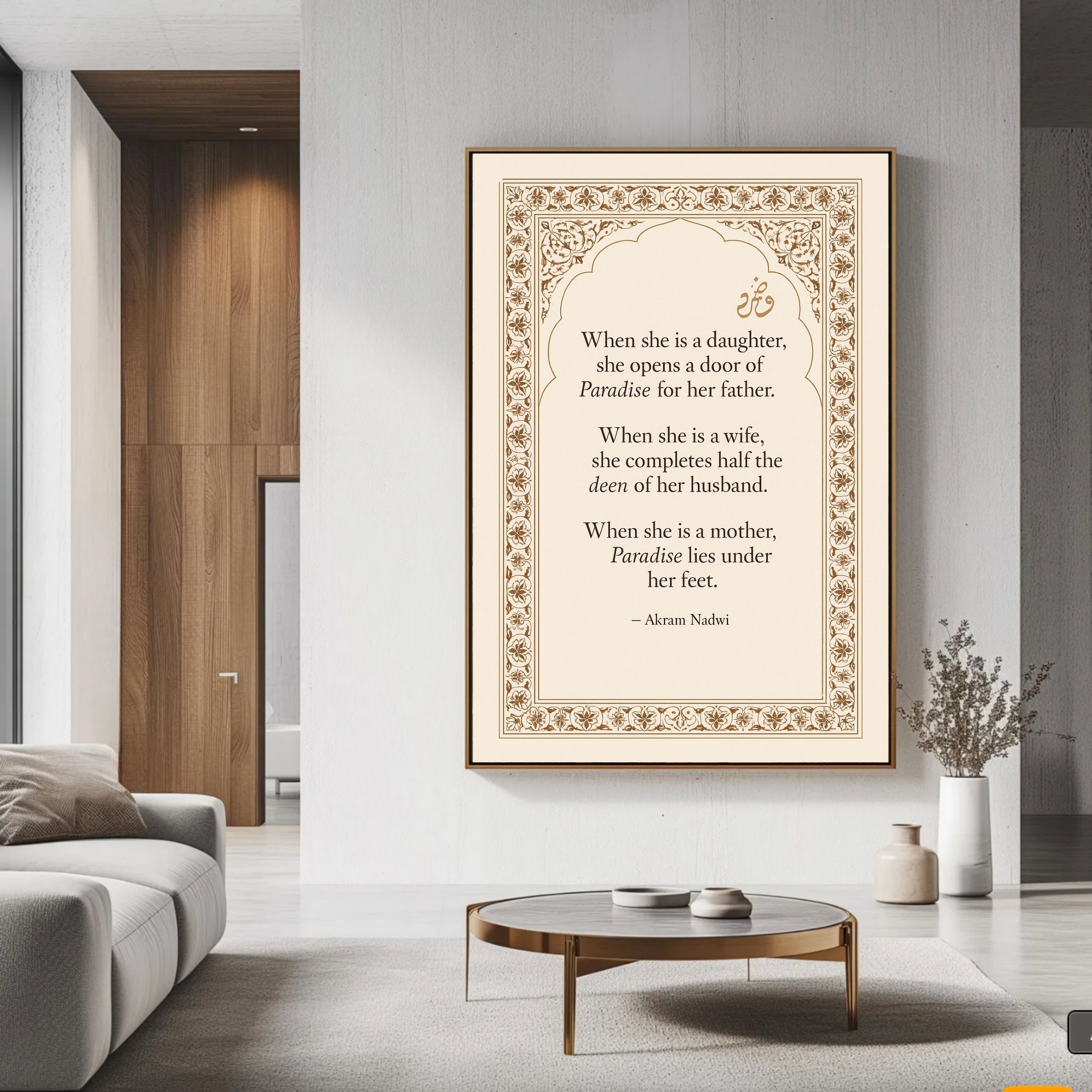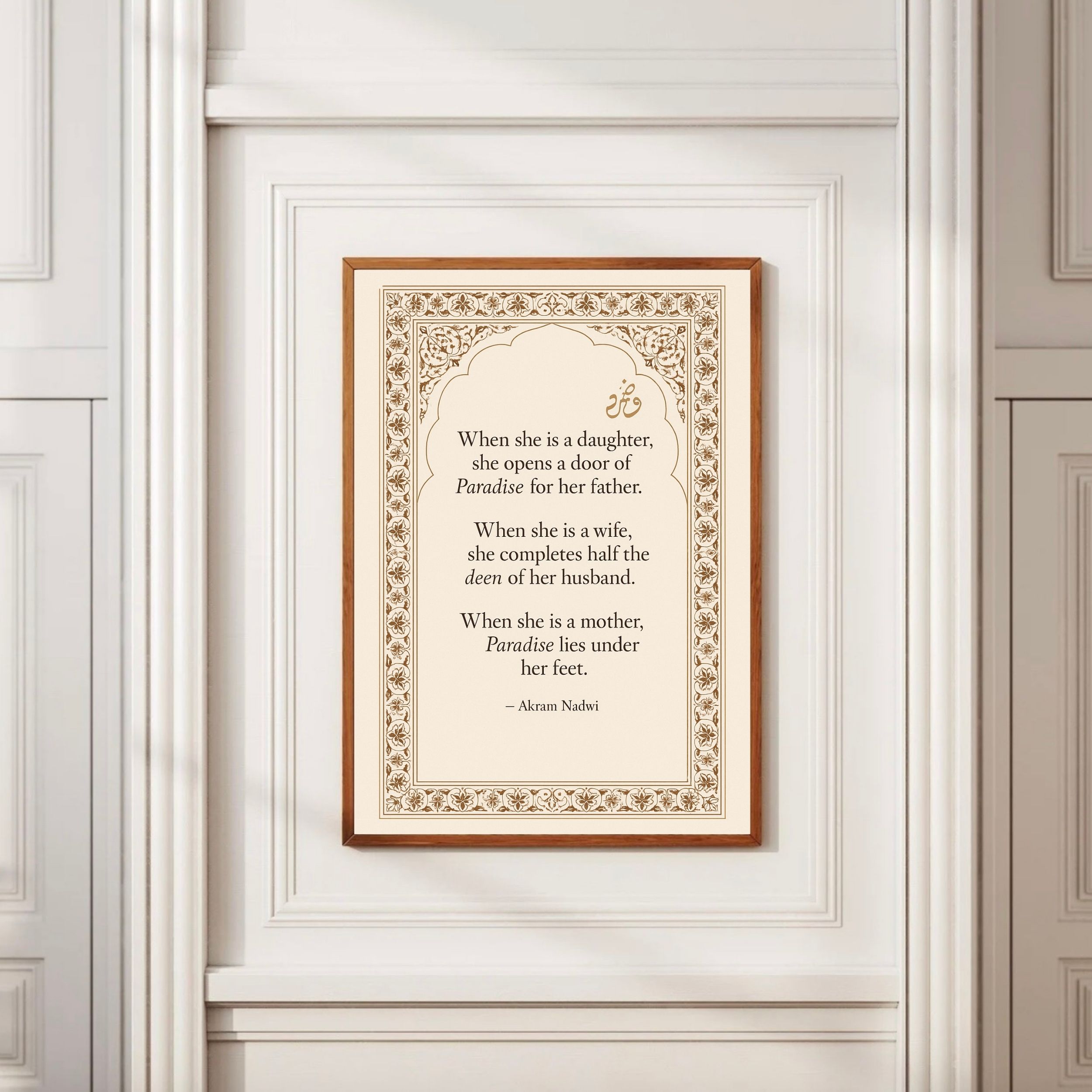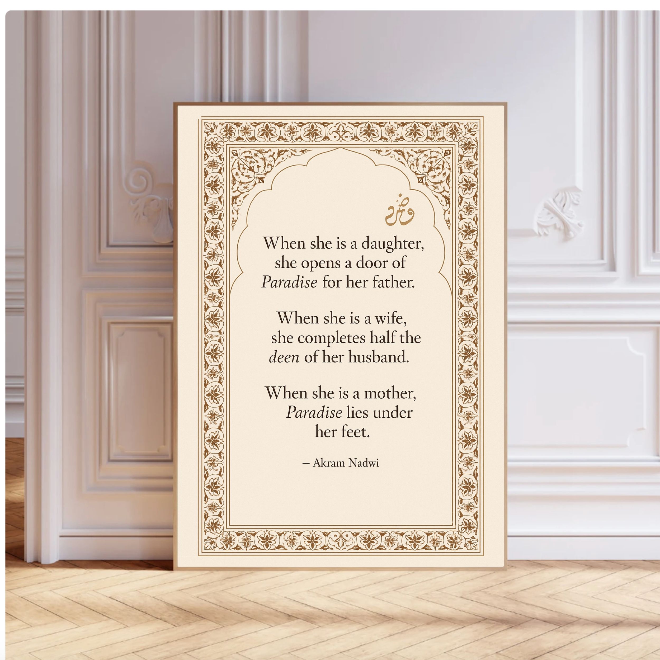 Infuse your space with elegance and meaning through this beautifully curated digital print celebrating the value of women in Islam. Rooted in sacred wisdom, this minimal yet powerful design serves as a graceful daily reminder: a woman is not just honored — she is a divine trust.