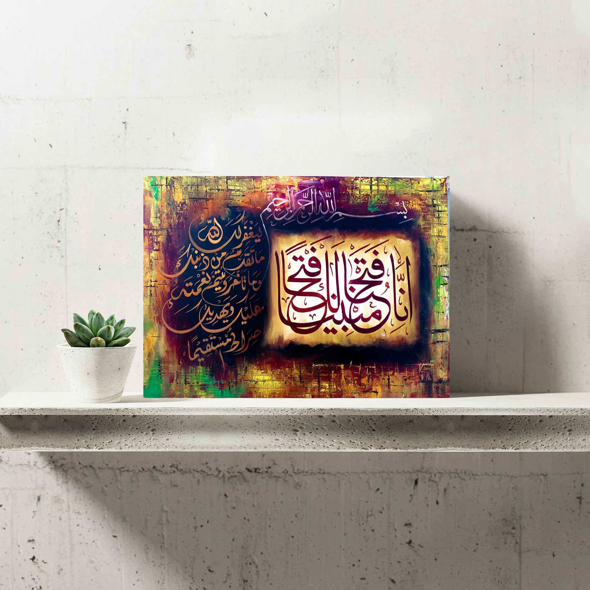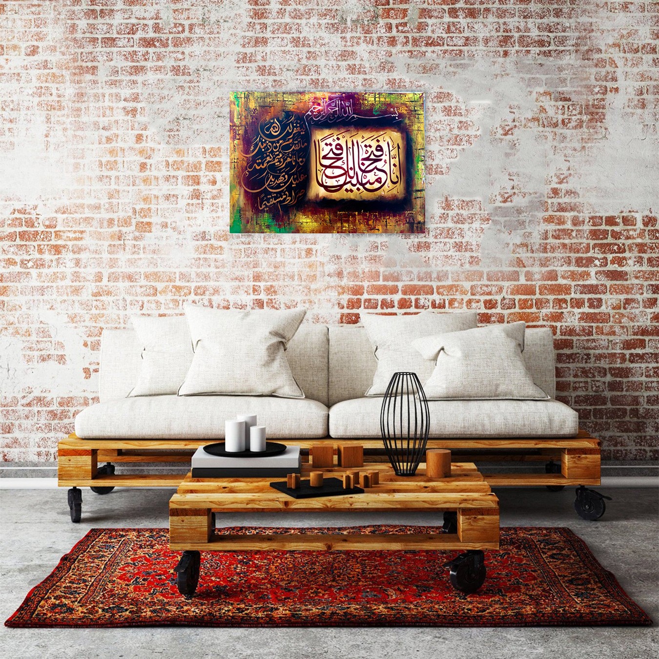 Taken from Surah Al Fath the phrase 'Inna fatahna laka fathan mubeenan' translates to ''Verily We have granted thee a manifest Victory.'' There is power in prayer and one can find victory over all that you desire, need or wish for this phrase can raise one's belief for self-conquest (Fath) promised by Allah (God).