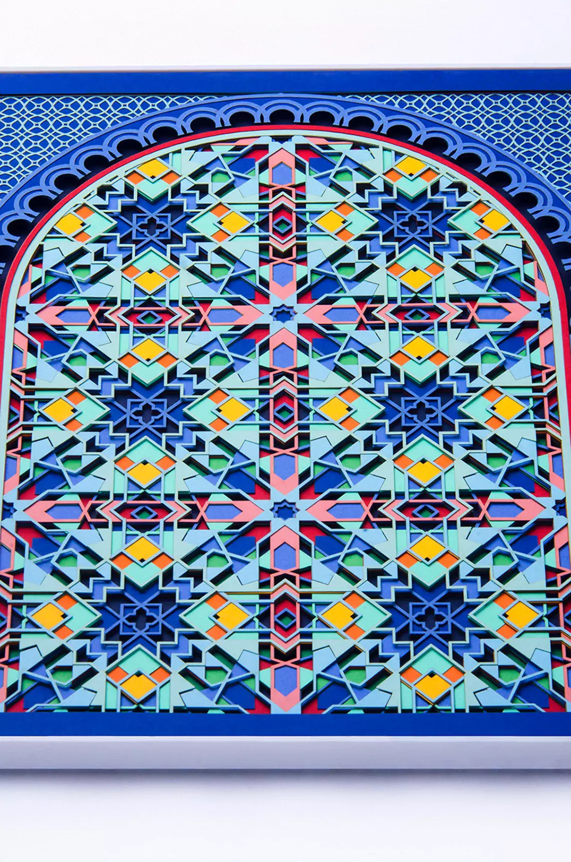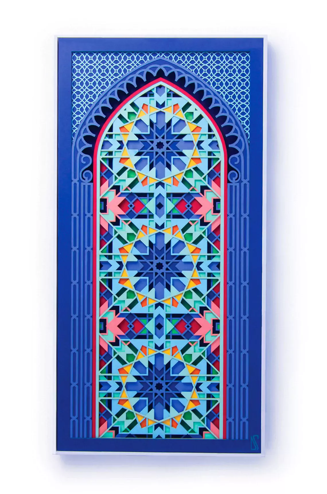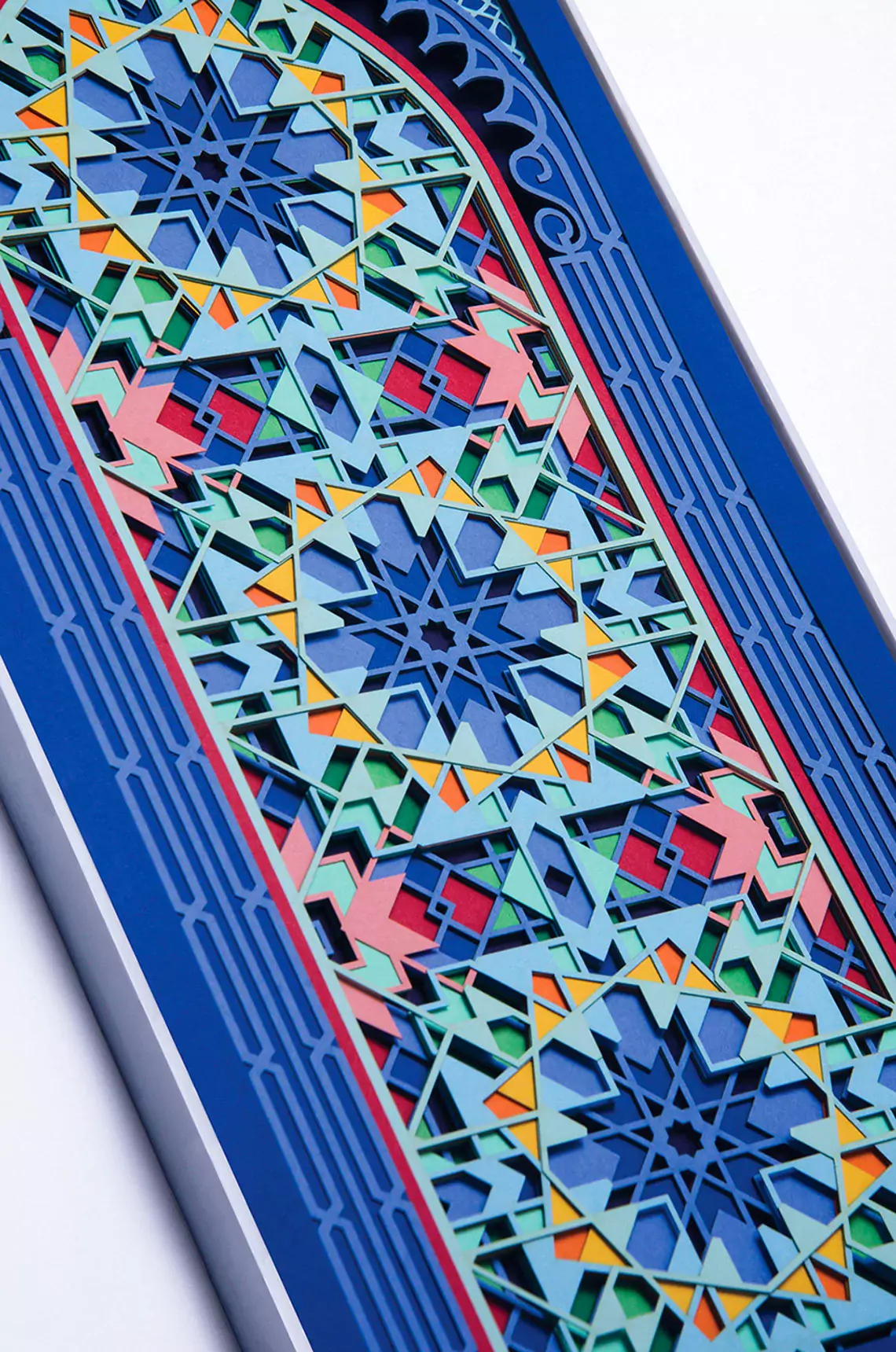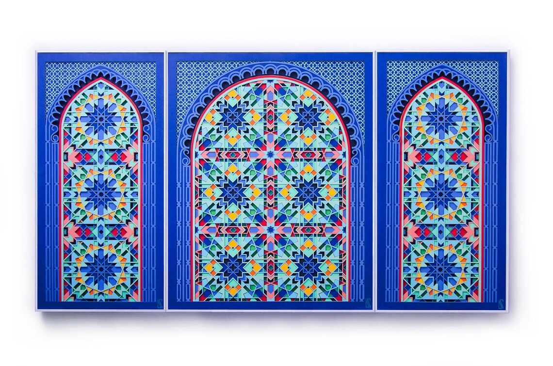 A paper sculpture based on kaleidoscopic geometry. This intricate artwork consist of three pieces (2 side pieces + 1 center piece). Each piece is made up of 20 layers of delicately cut 300gsm paper. Titled 'Labyrinth' for its complexity, you will lose yourself as you try to decode this maze. Find tranquility in its perfect fusion of sacred geometry and soothing colors. A one of a kind wall decor, that comes alive under the spell of light. Enjoy the 2D illusion from afar or come closer to experience its true dimensional value. An exquisite artwork that is a genuine gem for your personal space. It also serves as a great gift for your wedding anniversary or a house warming ceremony. Something that will be cherished for a long time. ------------------------------------------------------------------------------ PROCESS The artwork goes through a painstakingly long design process. • Starting with design conceptualization and how best to portray it. • Then days of drafting a unique design and experimenting with color combinations. • Followed by converting the 2D designs into 3D. • After this the final cutting and layering is done and the paper sculpture is complete. • A high level of precision is required as even a small error could lead to redoing the entire design. ------------------------------------------------------------------------------ PLEASE NOTE • LIMITED EDITION of 15 • The frames shown in the images are for representational purpose only. The artwork comes unframed. • If you wish to discuss framing options kindly contact me. • The artwork is available in 2 sizes 21" x 12" x 0.3" (54cm x 30cm x 1cm) 26.5" x 15" x 0.3" (67cm x 38cm x 1cm) • For a custom/larger size please contact me. • A Certificate of Authenticity will be provided with the artwork. • This is the entire three piece 'LABYRINTH' artwork. Care Instructions: • Avoid keeping the paper artwork in harsh sunlight. • Avoid keeping the artwork in a damp area. <strong> </strong><strong> </strong>