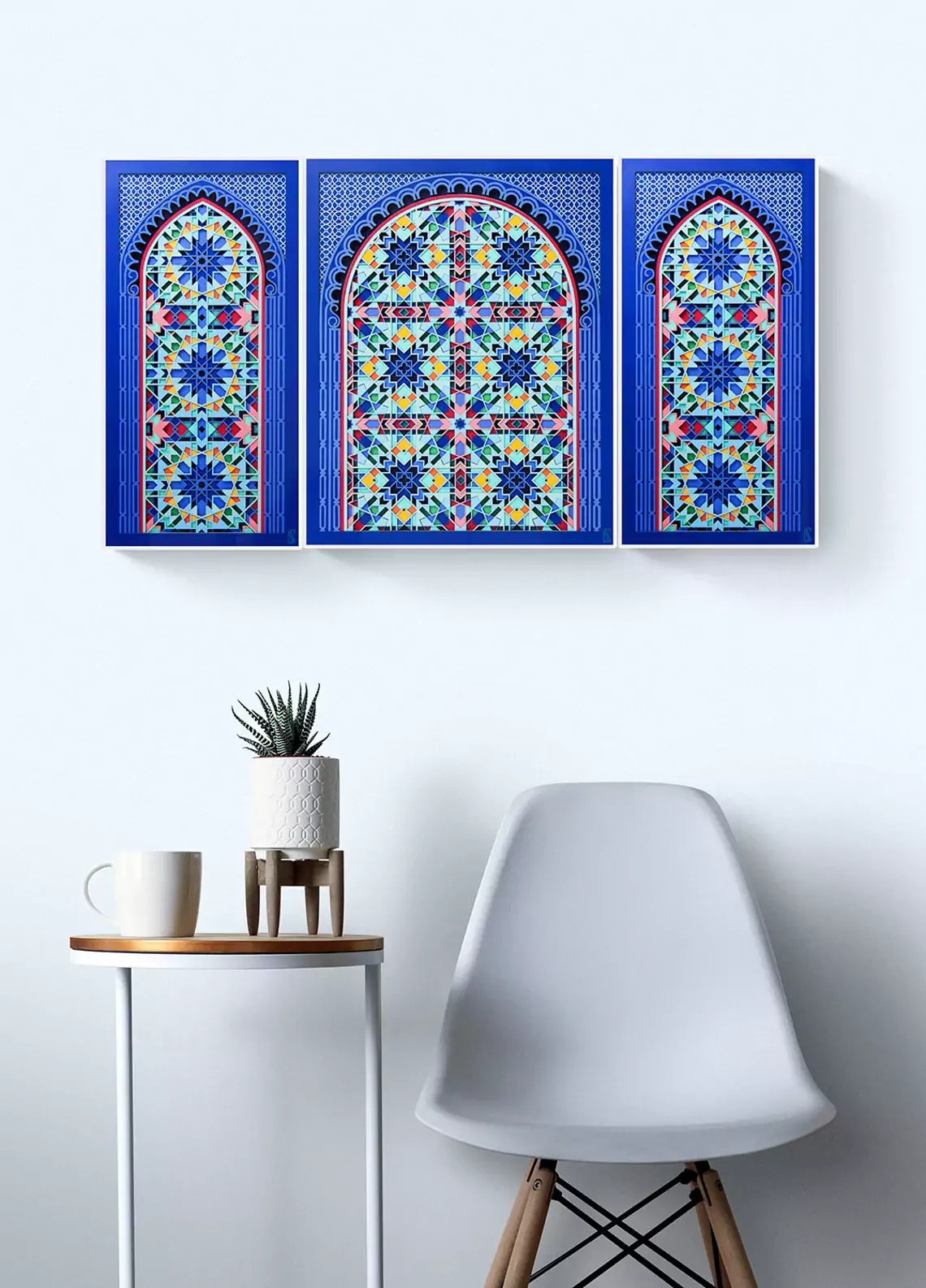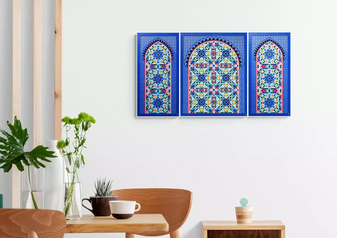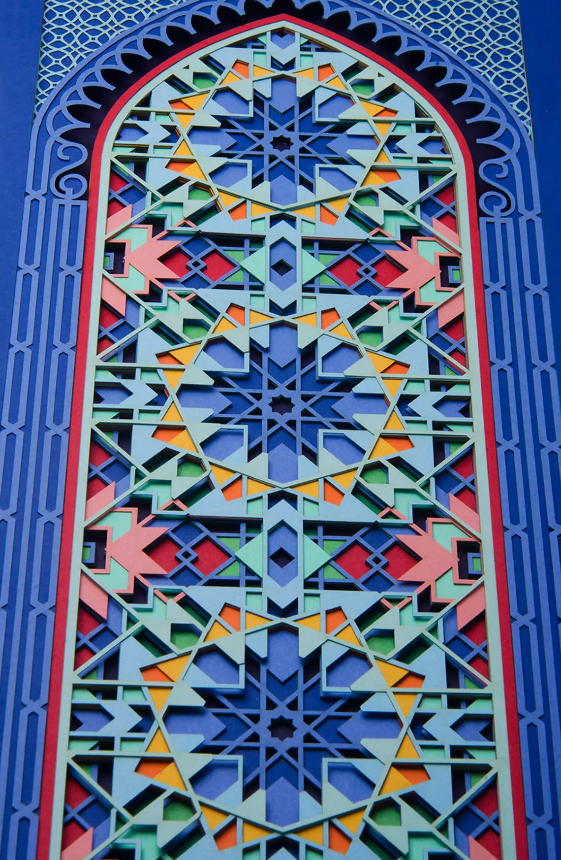 A paper sculpture based on kaleidoscopic geometry. This intricate artwork consist of three pieces (2 side pieces + 1 center piece). Each piece is made up of 20 layers of delicately cut 300gsm paper. Titled 'Labyrinth' for its complexity, you will lose yourself as you try to decode this maze. Find tranquility in its perfect fusion of sacred geometry and soothing colors. A one of a kind wall decor, that comes alive under the spell of light. Enjoy the 2D illusion from afar or come closer to experience its true dimensional value. An exquisite artwork that is a genuine gem for your personal space. It also serves as a great gift for your wedding anniversary or a house warming ceremony. Something that will be cherished for a long time. ------------------------------------------------------------------------------ PROCESS The artwork goes through a painstakingly long design process. • Starting with design conceptualization and how best to portray it. • Then days of drafting a unique design and experimenting with color combinations. • Followed by converting the 2D designs into 3D. • After this the final cutting and layering is done and the paper sculpture is complete. • A high level of precision is required as even a small error could lead to redoing the entire design. ------------------------------------------------------------------------------ PLEASE NOTE • LIMITED EDITION of 15 • The frames shown in the images are for representational purpose only. The artwork comes unframed. • If you wish to discuss framing options kindly contact me. • The artwork is available in 2 sizes 21" x 12" x 0.3" (54cm x 30cm x 1cm) 26.5" x 15" x 0.3" (67cm x 38cm x 1cm) • For a custom/larger size please contact me. • A Certificate of Authenticity will be provided with the artwork. • This is the entire three piece 'LABYRINTH' artwork. Care Instructions: • Avoid keeping the paper artwork in harsh sunlight. • Avoid keeping the artwork in a damp area. <strong> </strong><strong> </strong>