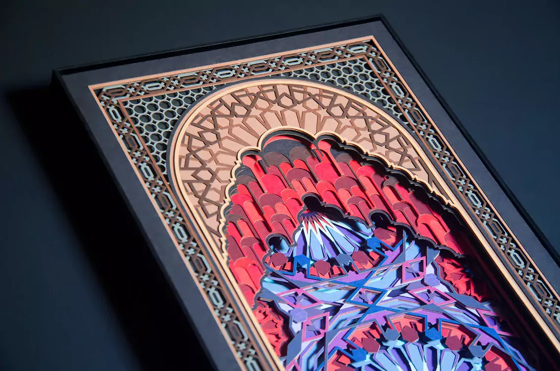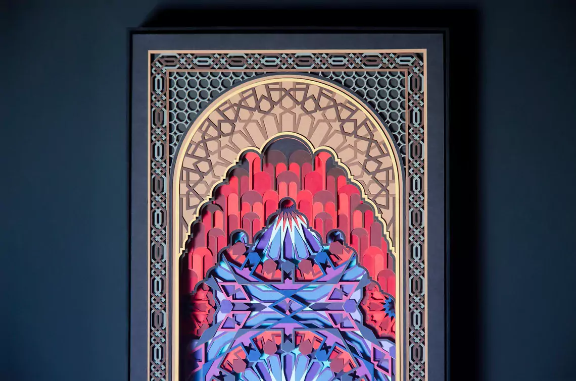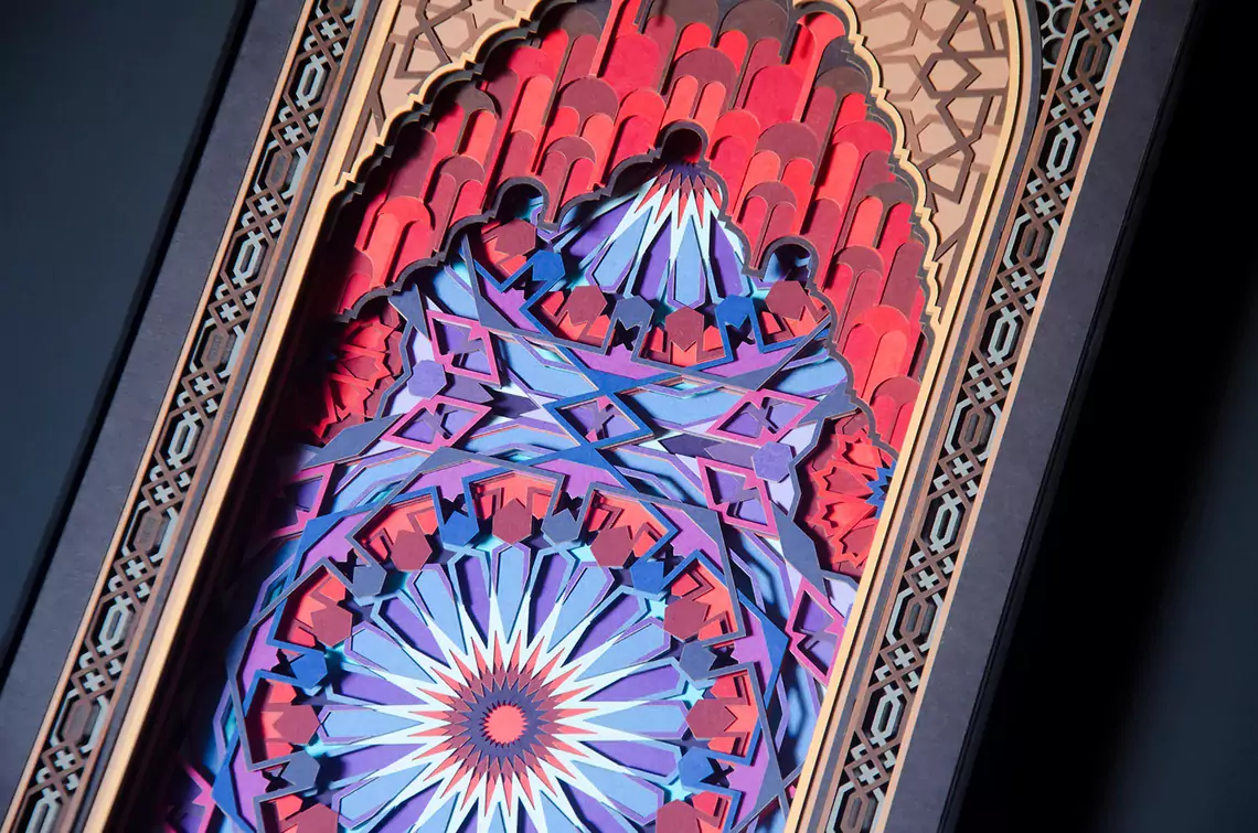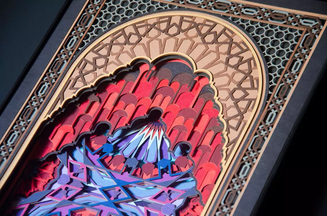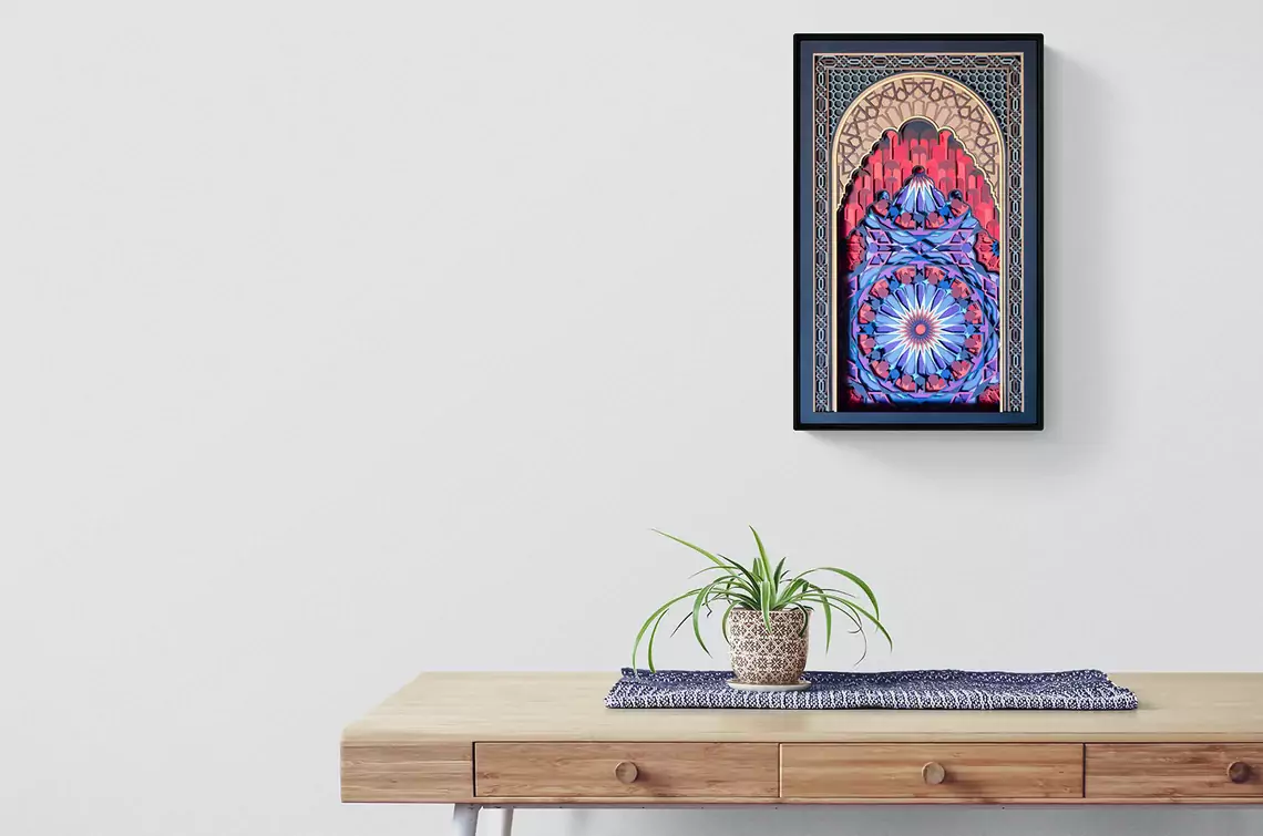 This artwork is part of the series 'Transcendence' that are gateways to higher dimensions. It uses architecture with geometry and transcends into mythical places that have intrigued men for ages. Places beyond our realm of life, of inner peace and bliss, of secrets and buried treasures that unfold with the prismatic union of shapes and colors. The intricately carved arch is the point of ingress and gives a glimpse of what lies beyond. The design sets the stage for light and shadow to weave a dramatic scene that entices the viewer to step closer and be teleported to mesmerizing dimensions. The artwork is titled 'An Aladdin's Cave', an apt idiom leaving the meaning open to interpretation. It is made with 49 layers of paper and has a palette of 26 vivid colors. It will be an exquisite gem for your personal space and be cherished for a long time. ------------------------------------------------------------------------------ The Making A thorough study of forms is done before creating an intricate framework that seamlessly fuses architecture and geometry. The design is broken down into levels and filled with a complementing color palette. Placing the right color on the right level highlights certain elements that create hypnotizing patterns. An accurate cutting is done using a mix of machine and hand cuts for getting the best of both worlds. The final assembly turns the 2D design into a 3D structure under the play of light and shadow. A high level of precision is required as small errors lead to entire redoes. ------------------------------------------------------------------------------ PLEASE NOTE ● LIMITED EDITION of 12 ● The artwork is available in three sizes 12" x 7.3" x 1" (30cm x 18.5cm x 2.5cm) 15.4" x 9.5" x 1" (39cm x 24cm x 2.5cm) 19.3" x 12" x 1" (49cm x 30cm x 2.5cm) ● Product will be shipped within 6 days. ● Certificate of Authenticity will be provided with the artwork. ● The frames shown in the images are for representational purpose only. The artwork comes unframed. ● If you wish to discuss framing options kindly contact me.