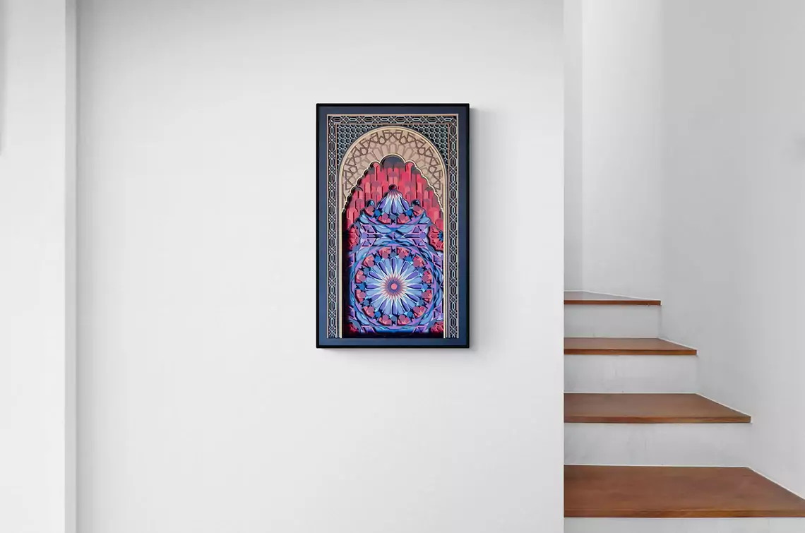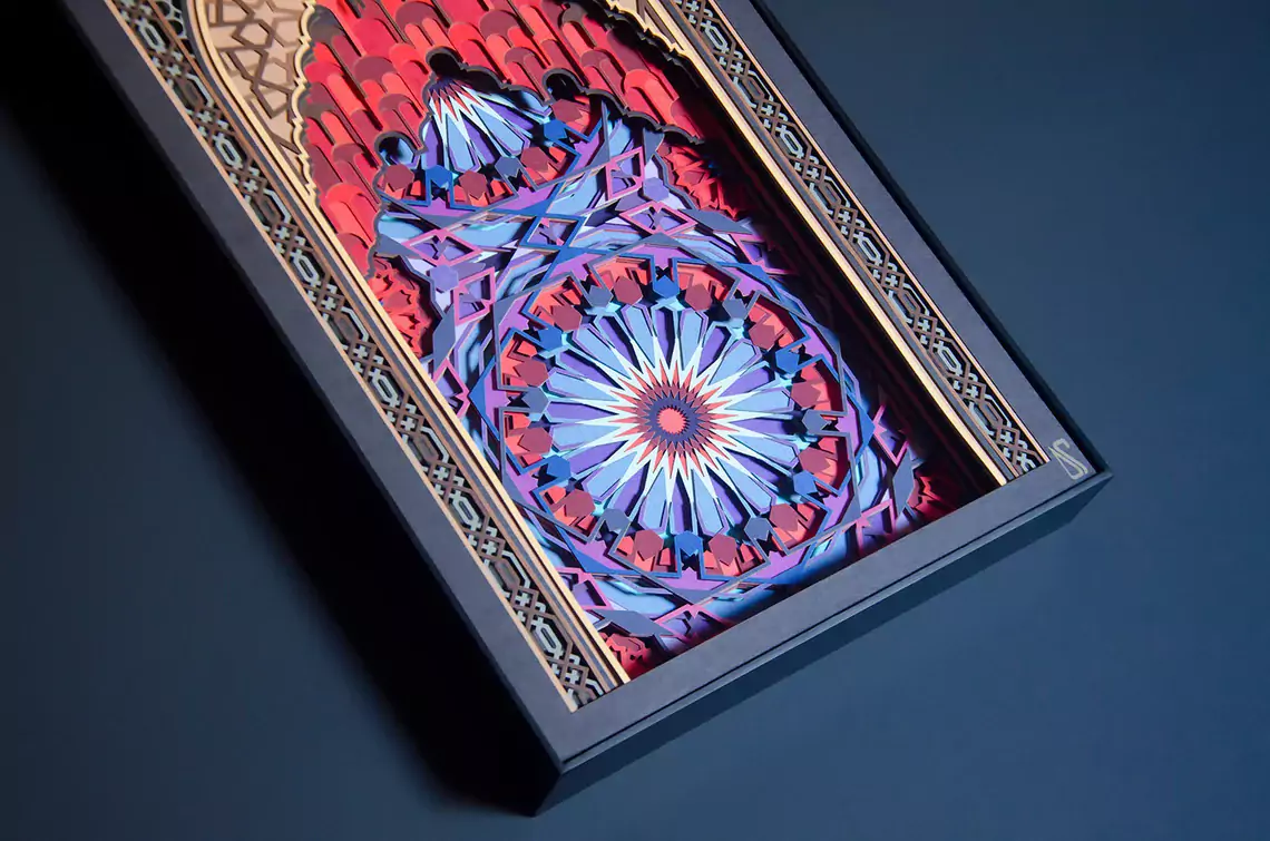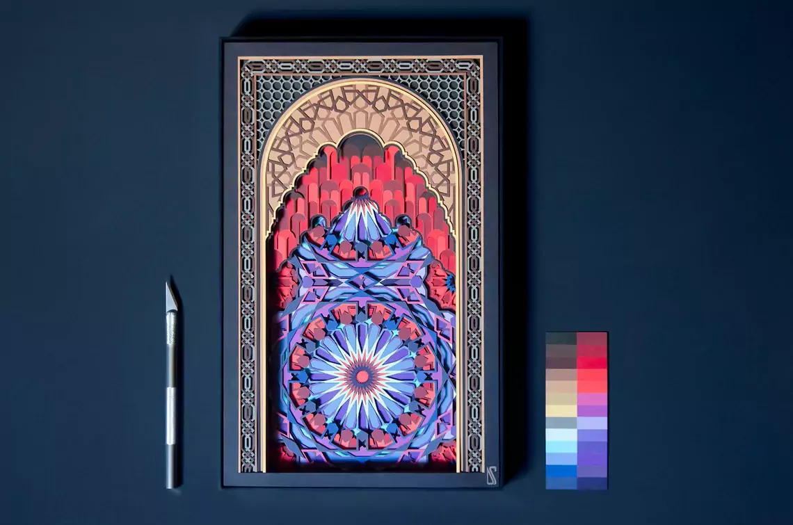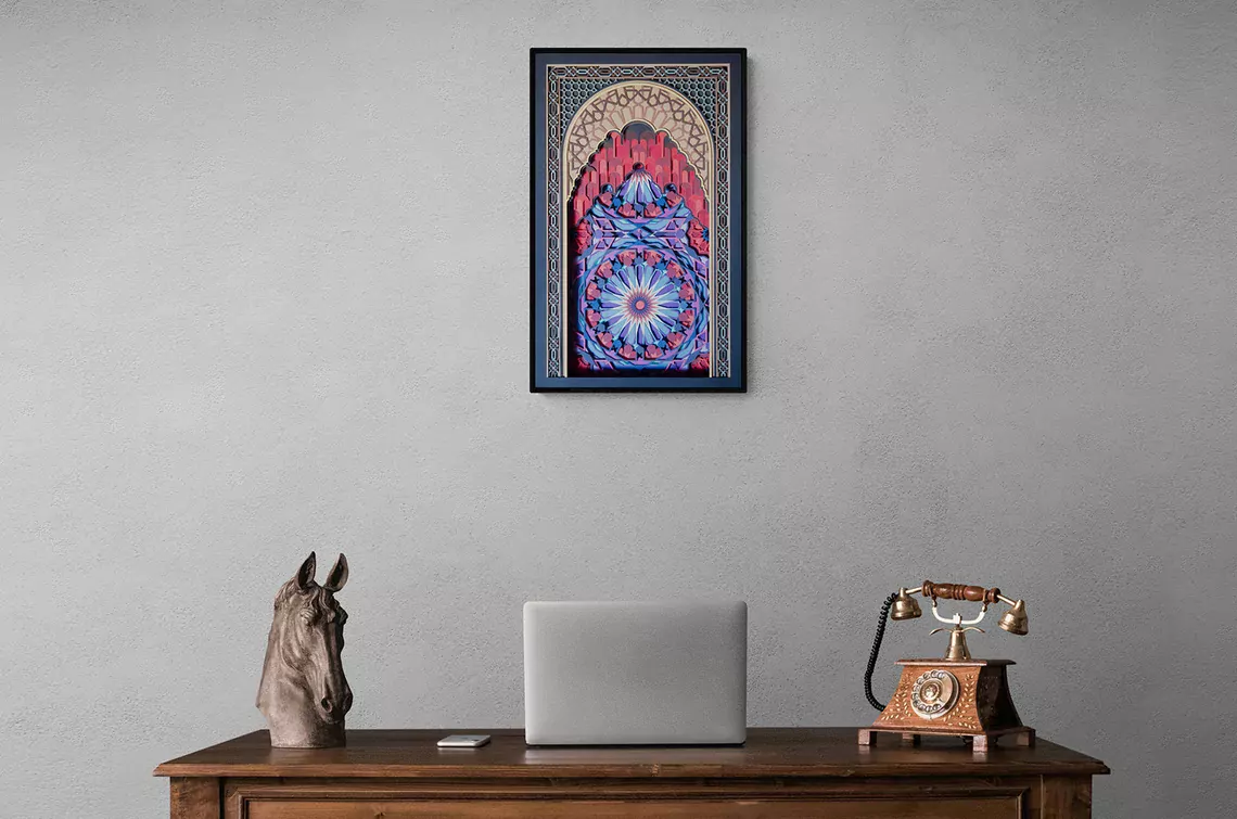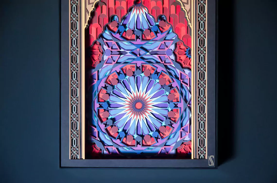 This artwork is part of the series 'Transcendence' that are gateways to higher dimensions. It uses architecture with geometry and transcends into mythical places that have intrigued men for ages. Places beyond our realm of life, of inner peace and bliss, of secrets and buried treasures that unfold with the prismatic union of shapes and colors. The intricately carved arch is the point of ingress and gives a glimpse of what lies beyond. The design sets the stage for light and shadow to weave a dramatic scene that entices the viewer to step closer and be teleported to mesmerizing dimensions. The artwork is titled 'An Aladdin's Cave', an apt idiom leaving the meaning open to interpretation. It is made with 49 layers of paper and has a palette of 26 vivid colors. It will be an exquisite gem for your personal space and be cherished for a long time. ------------------------------------------------------------------------------ The Making A thorough study of forms is done before creating an intricate framework that seamlessly fuses architecture and geometry. The design is broken down into levels and filled with a complementing color palette. Placing the right color on the right level highlights certain elements that create hypnotizing patterns. An accurate cutting is done using a mix of machine and hand cuts for getting the best of both worlds. The final assembly turns the 2D design into a 3D structure under the play of light and shadow. A high level of precision is required as small errors lead to entire redoes. ------------------------------------------------------------------------------ PLEASE NOTE ● LIMITED EDITION of 12 ● The artwork is available in three sizes 12" x 7.3" x 1" (30cm x 18.5cm x 2.5cm) 15.4" x 9.5" x 1" (39cm x 24cm x 2.5cm) 19.3" x 12" x 1" (49cm x 30cm x 2.5cm) ● Product will be shipped within 6 days. ● Certificate of Authenticity will be provided with the artwork. ● The frames shown in the images are for representational purpose only. The artwork comes unframed. ● If you wish to discuss framing options kindly contact me.