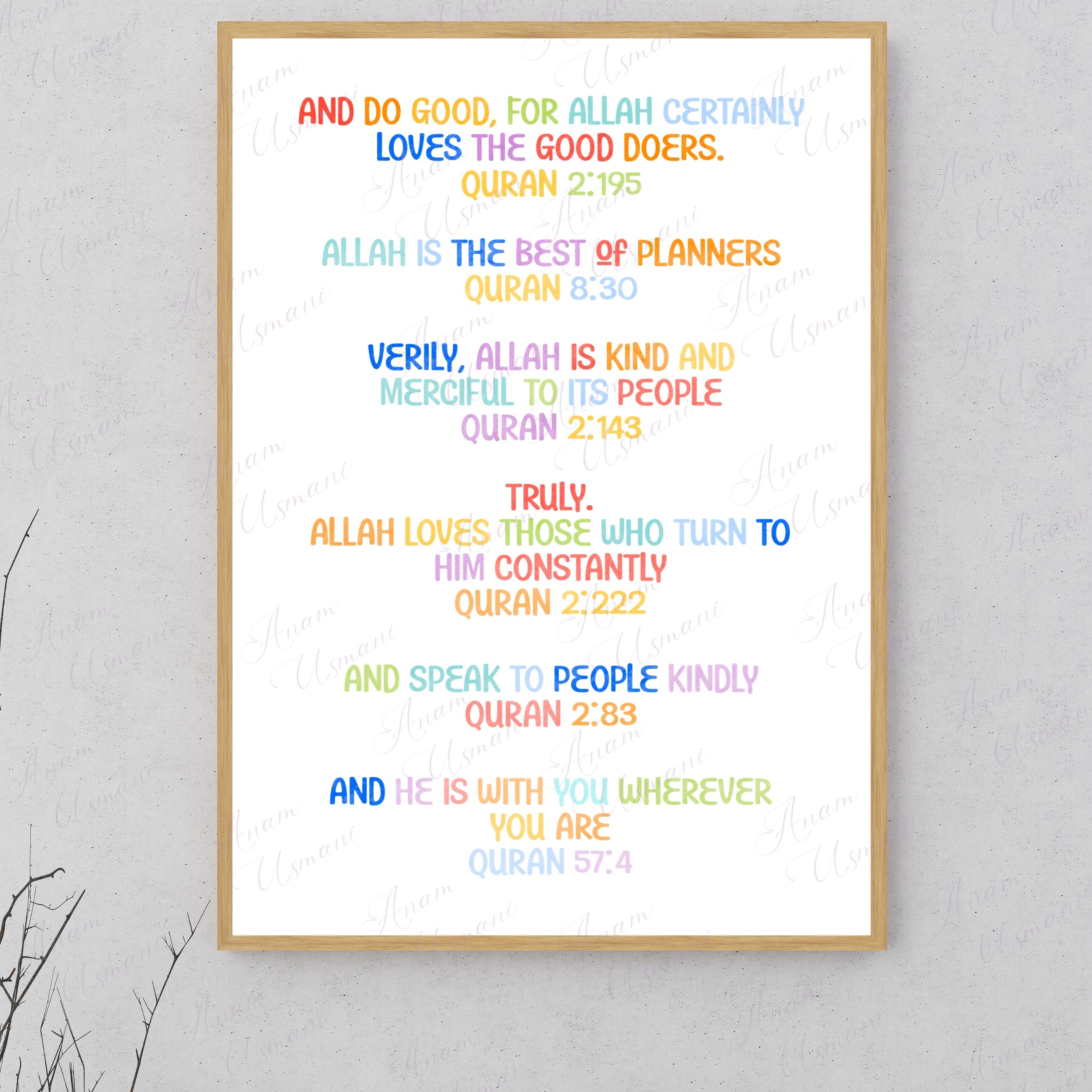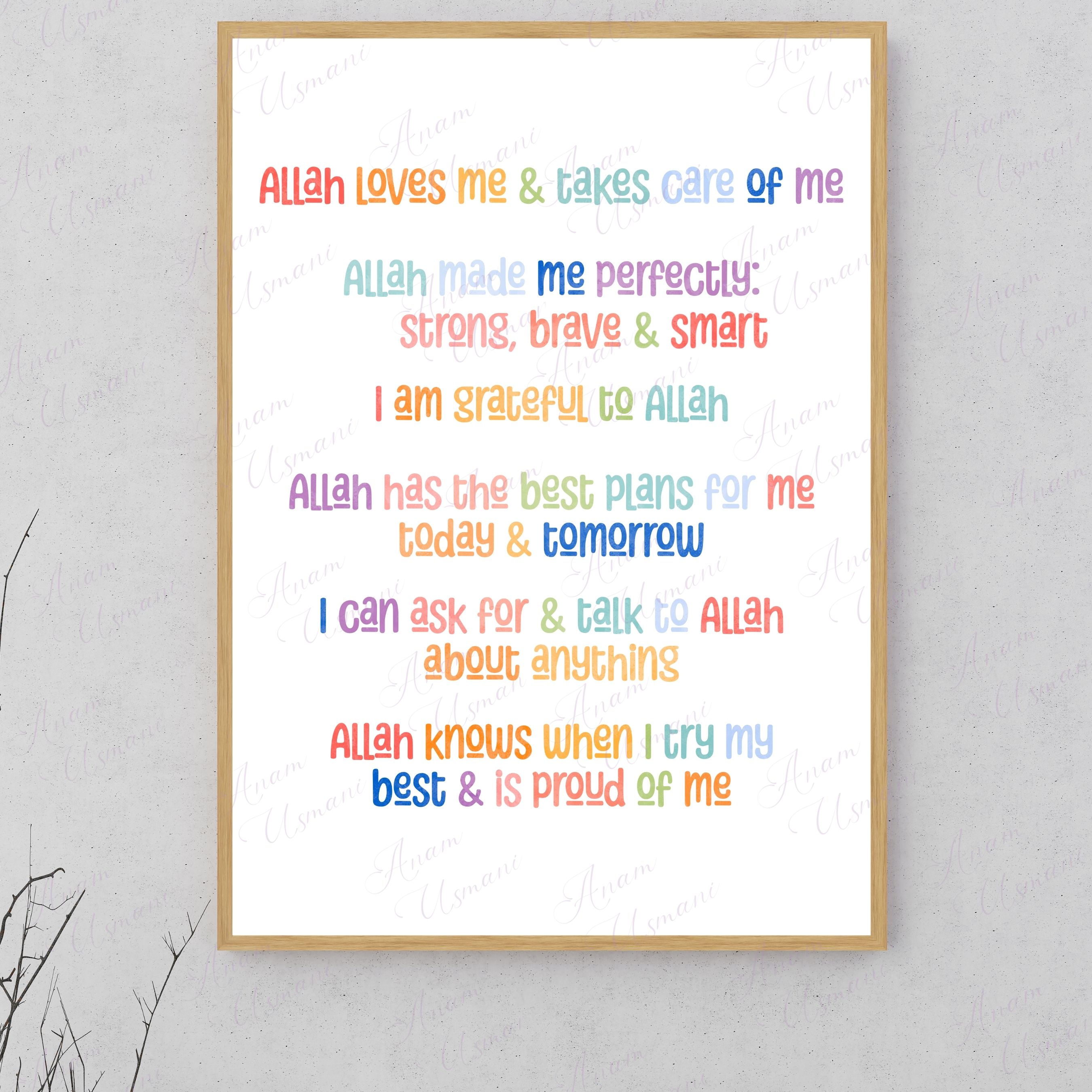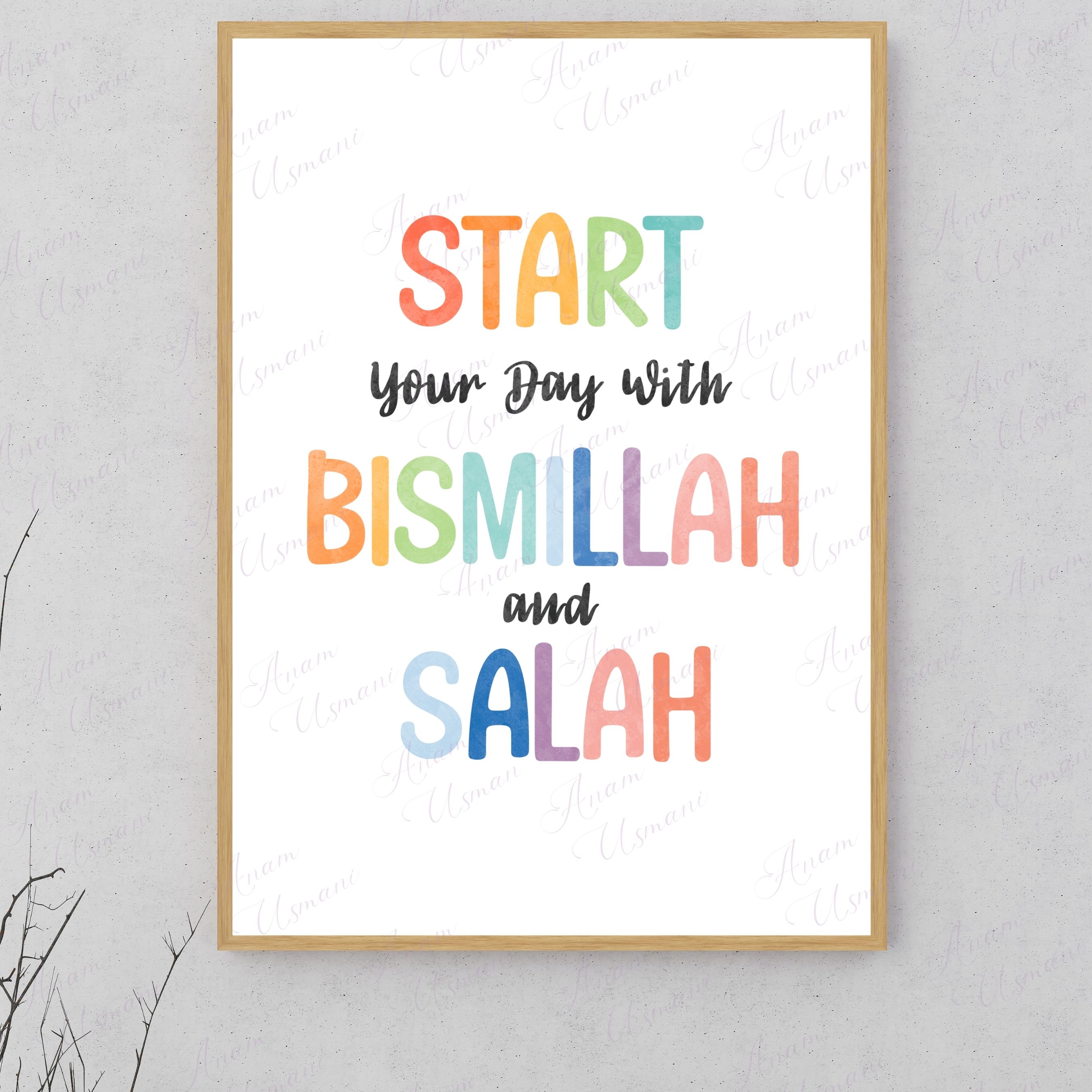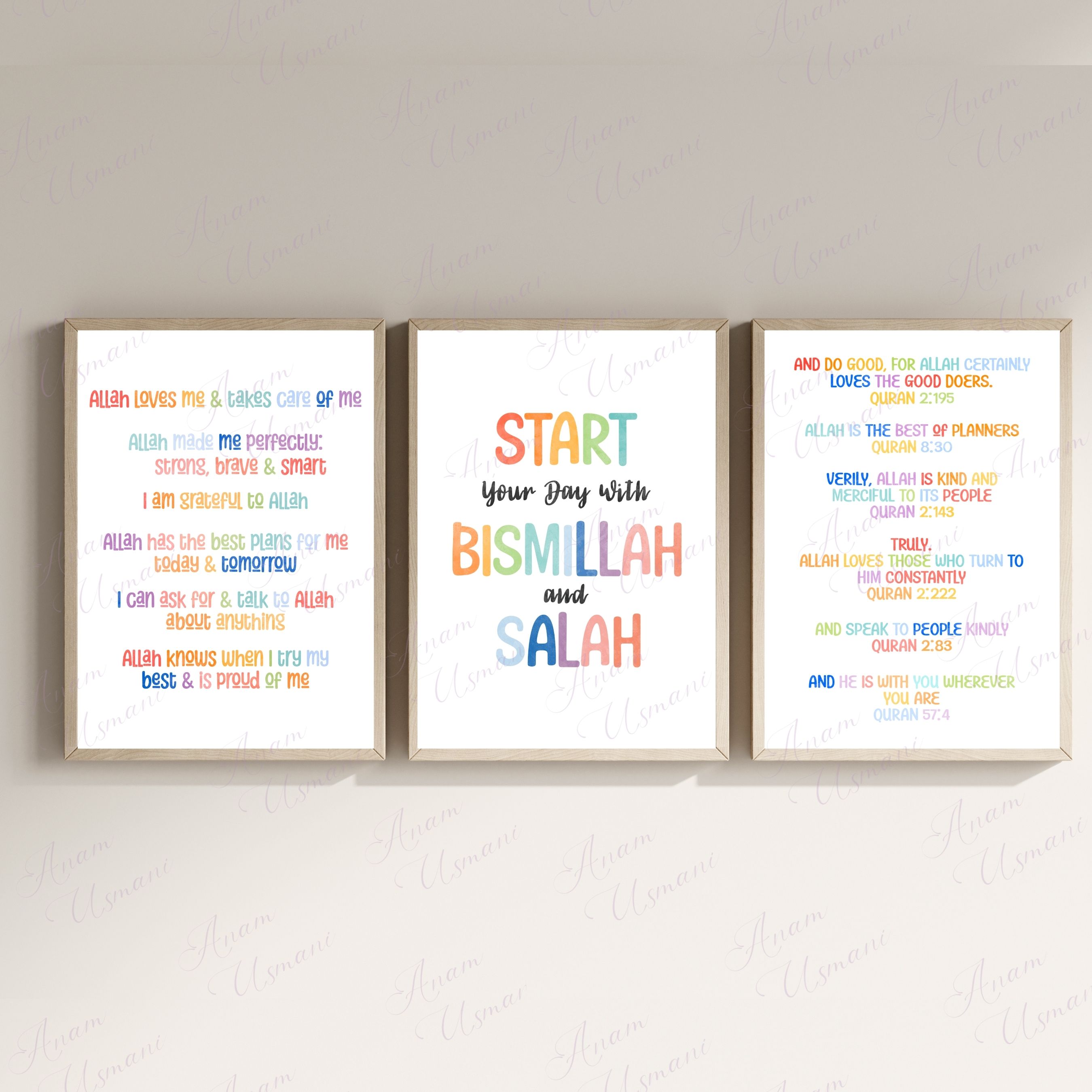 "Brighten your child's room with this thoughtfully designed set of three Islamic-themed prints, perfect for nurturing their spiritual journey. The first print encourages starting the day with 'BISMILLAH and Salah,' setting a positive and faith-driven tone. The second print features heartwarming Islamic affirmations to inspire confidence, gratitude, and mindfulness. The third print includes a selection of beautifully written Quranic verses, fostering a connection to the teachings of Islam. These vibrant and meaningful prints are ideal for creating a serene and spiritually uplifting environment in your child's bedroom, playroom, or study area. Whether you're decorating a nursery or adding to a growing child's space, this set serves as a daily reminder of faith, positivity, and spiritual growth. A perfect gift for parents or loved ones, these prints offer both beauty and inspiration for little hearts and minds."