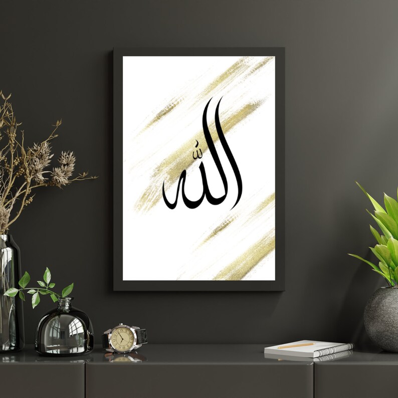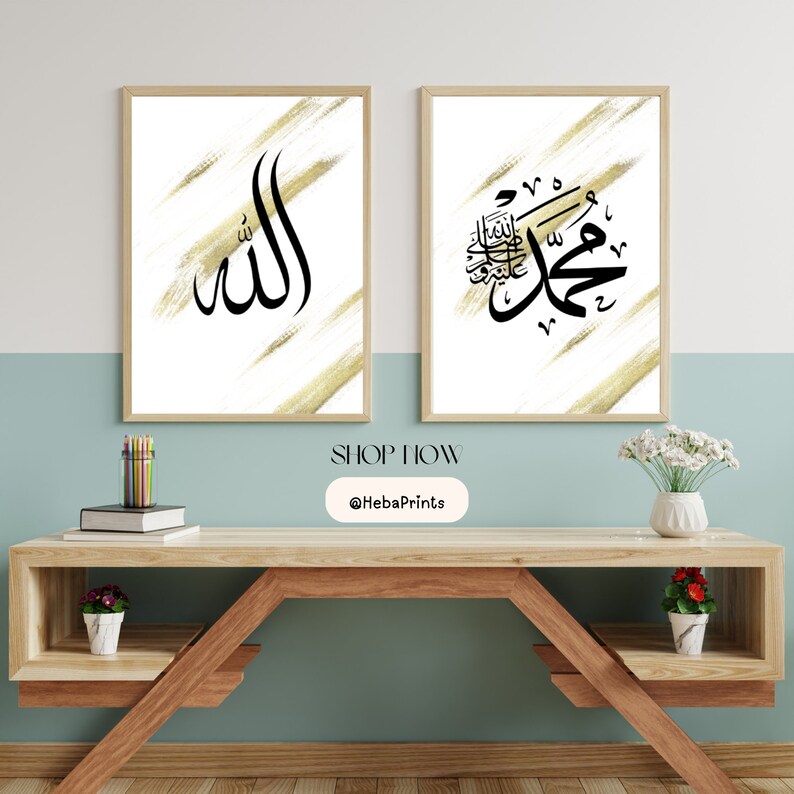 Immerse your surroundings in divine beauty with our digital download posters showcasing Allah (SWT) and Prophet Muhammad (PBUH). These exclusive designs feature a minimalistic and timeless aesthetic, adorned with gold brush strokes that add a touch of sophistication to any space.