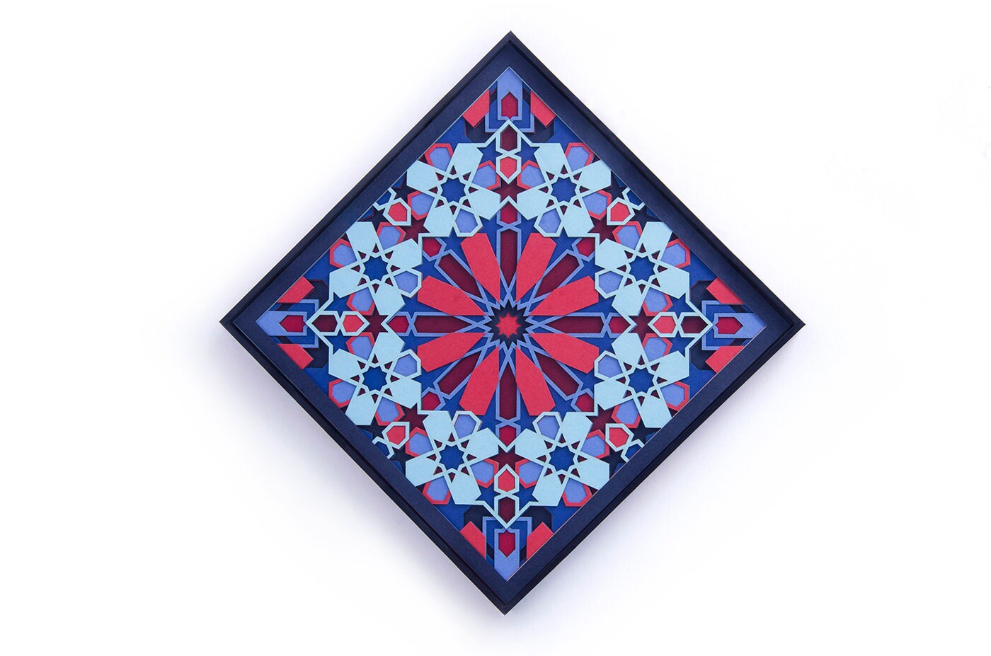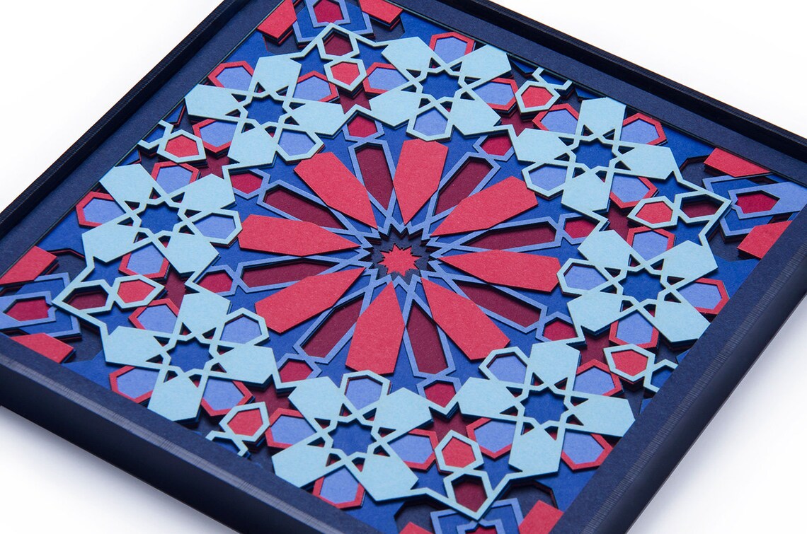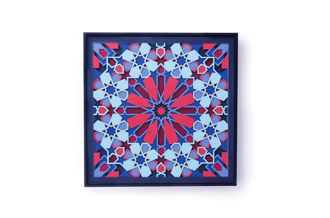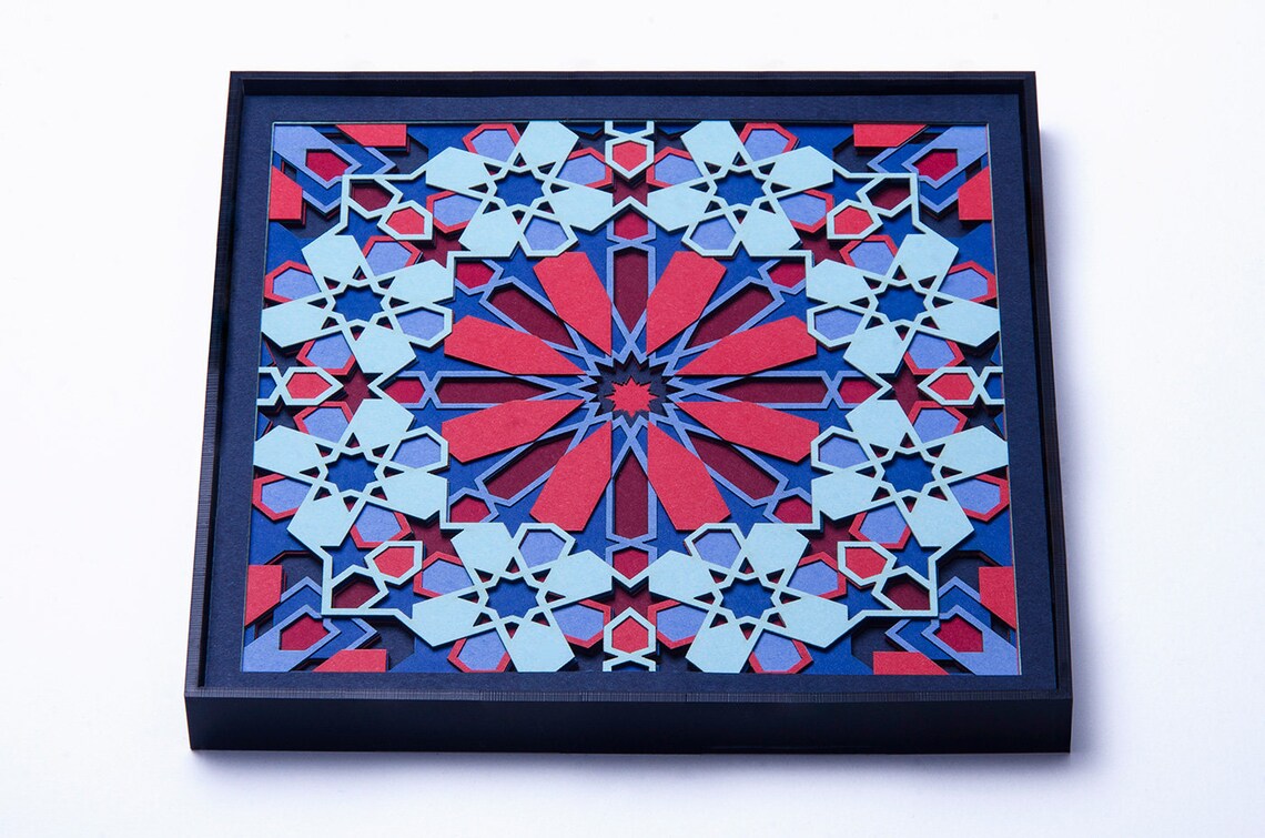 This original paper cut art is inspired by sacred geometry. It is made up of 10 layers of delicately cut 300gsm paper. Titled 'Passion' for its intense colors and design, it comes alive under the spell of light. Lose yourself in its perfect fusion of geometry and vibrant colors.