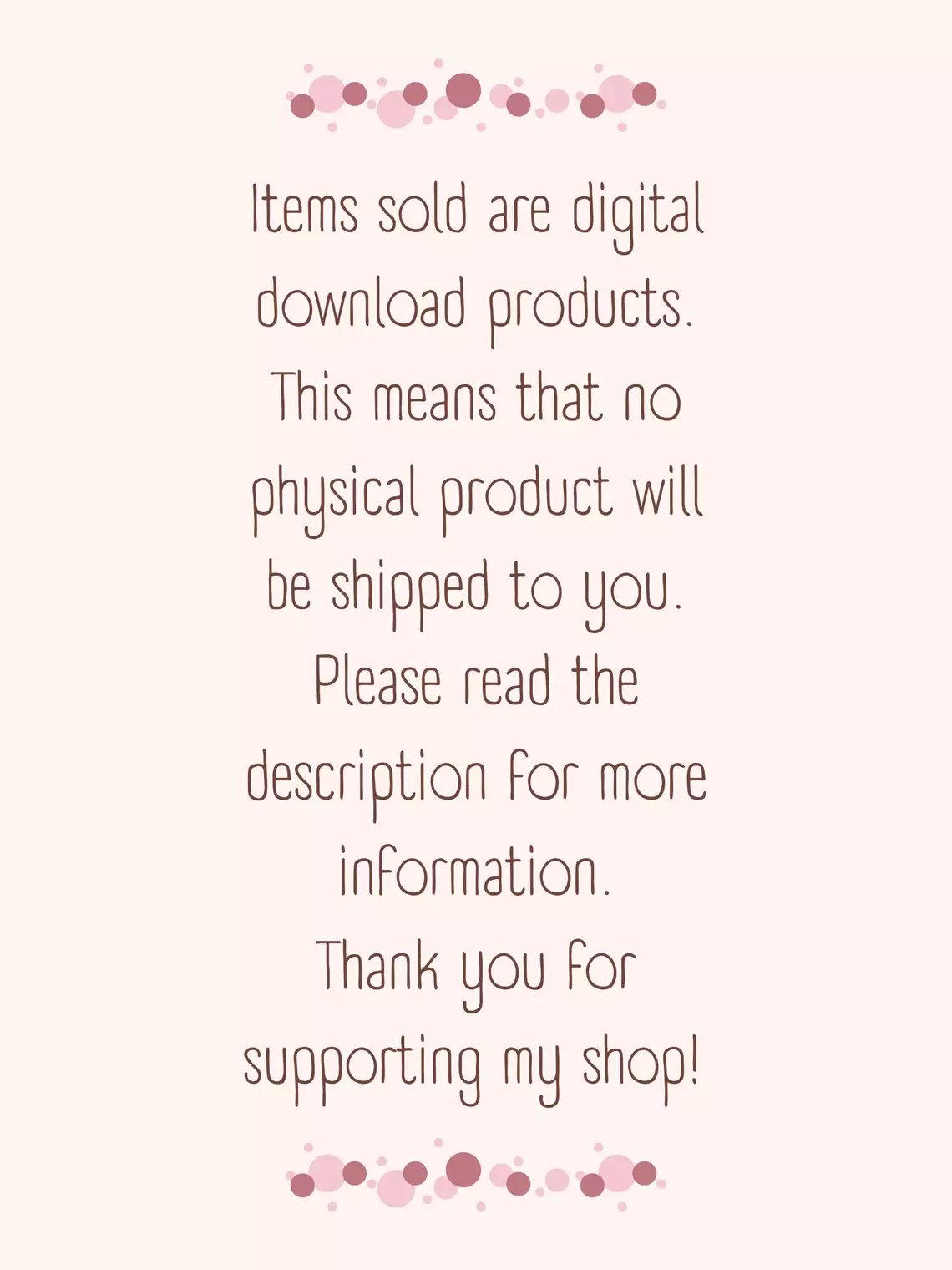 Because this item is a digital file we do not accept refunds, returns or exchanges. please be sure that you read the description carefully and fully understand the details of this product listing before purchase. Please message our shop with any questions BEFORE making your purchase.