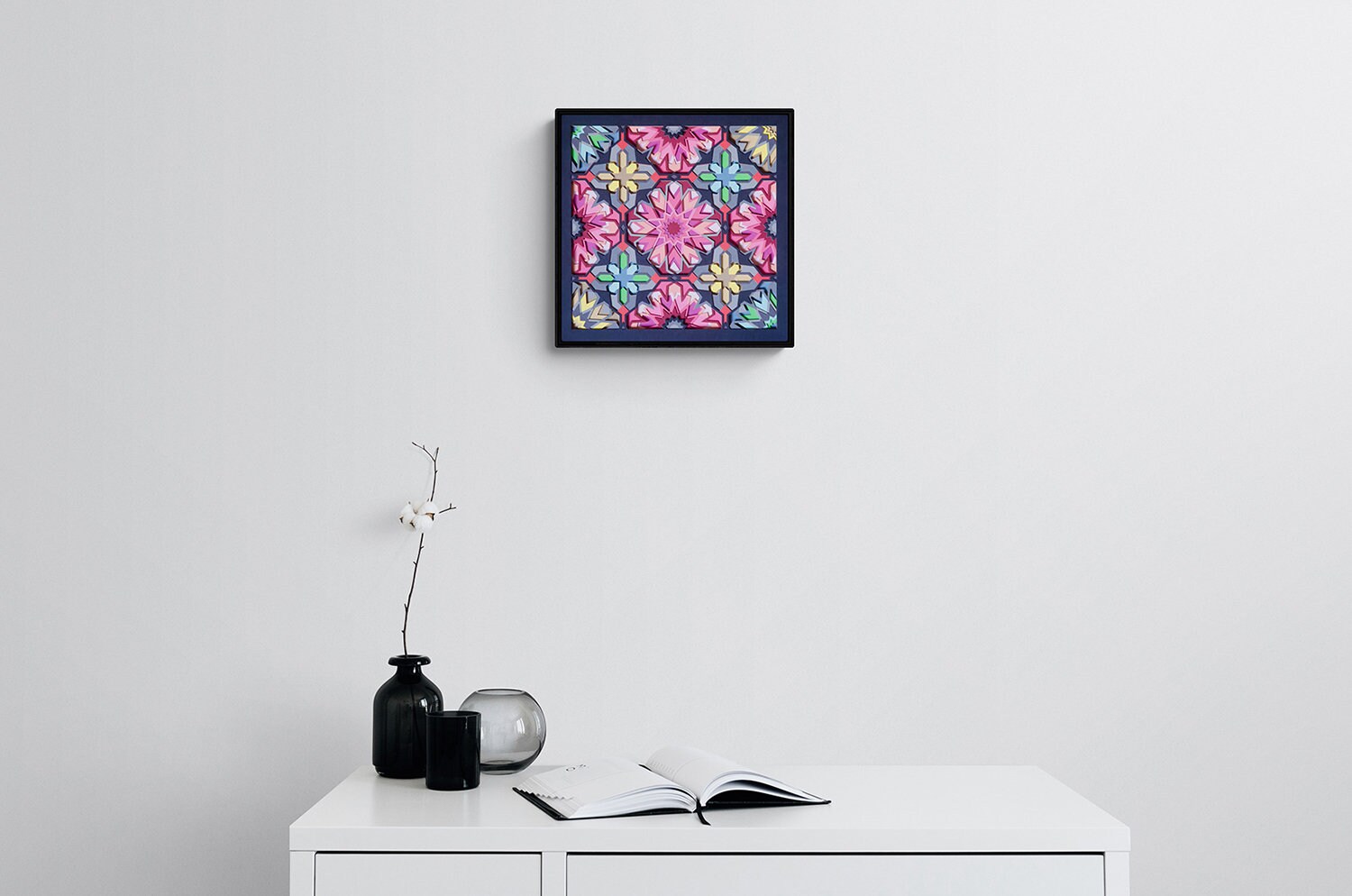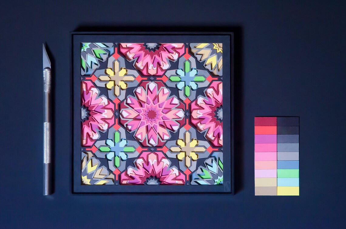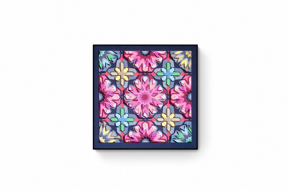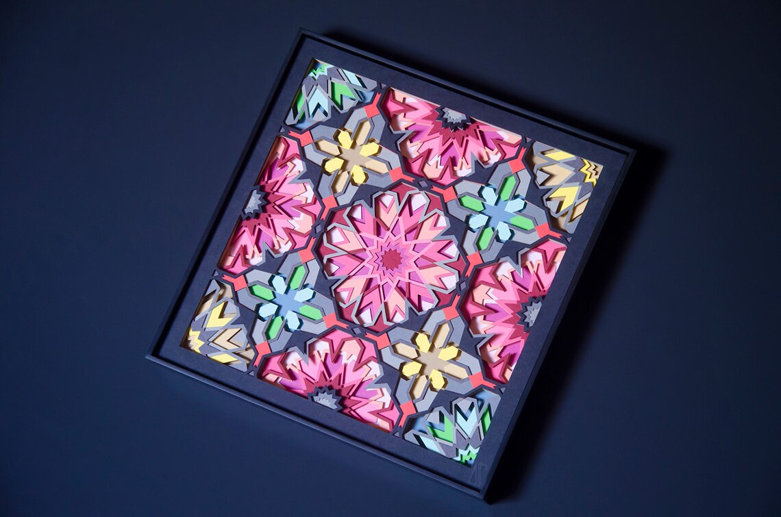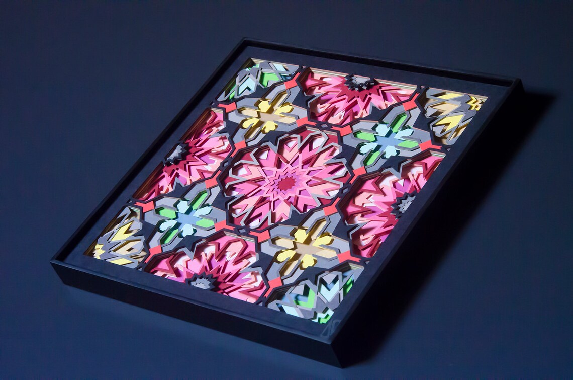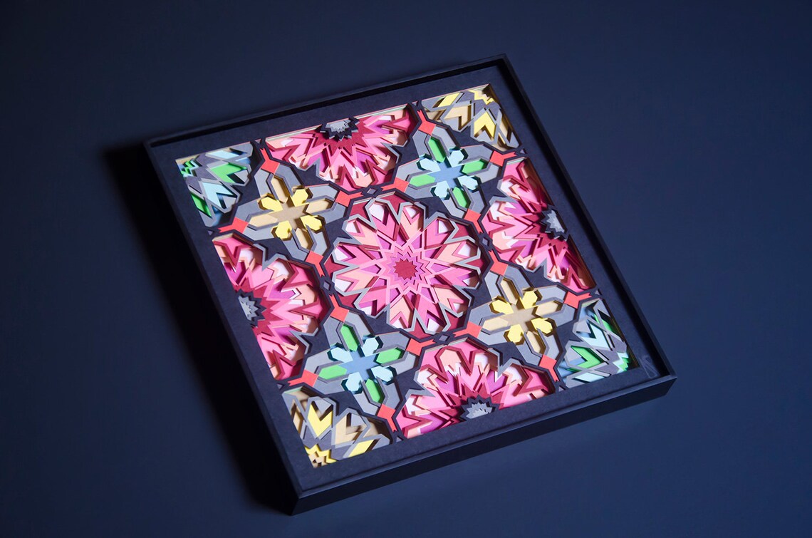 This artwork 'Iridescence' is part of the series 'Spectral Matrix' that deciphers complex geometry through selective use of the color spectrum. A vivid color palette and how it is used at various levels of the structure unveils a mesmerizing pattern. The play of light & shadow orchestrates dramatic outcomes, turning chaos into beautiful prismatic arena. The title of the artwork is evident of what this union of geometry and colors reveals. 'Ikebana' has 20 layers of paper and a palette of 18 vivid colors. It will be a kaleidoscopic ornament for your personal space and be truly cherished. ------------------------------------------------------------------------------ THE MAKING It kicks off with drawing and designing an intricate geometric framework. The design is broken down into levels and filled with colors that contrast and complement each other. Mesmerizing patterns are uncovered by highlighting and subduing different elements in the matrix. An accurate cutting is done using a mix of machine and hand cuts for getting the best of both worlds. Under the play of light & shadows the final step of layer assembly turns the 2D design into a 3D structure. A high level of precision is required as small errors lead to entire redoes. ------------------------------------------------------------------------------ PLEASE NOTE ● LIMITED EDITION of 12 ● The artwork is available in three sizes 6" x 6" x 0.4" (15cm x 15cm x 1cm) 8" x 8" x 0.4" (20cm x 20cm x 1cm) 10" x 10" x 0.4" (25cm x 25cm x 1cm) ● Product will be shipped within 4 days. ● Certificate of Authenticity will be provided with the artwork. ● The frames shown in the images are for representational purpose only. The artwork comes unframed. ● If you wish to discuss framing options kindly contact me.