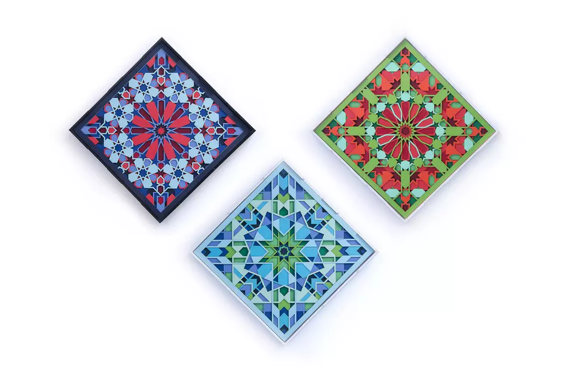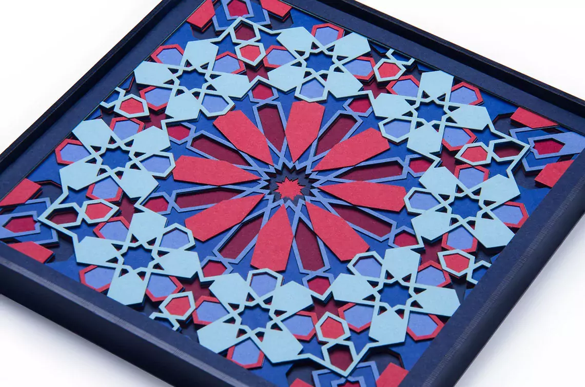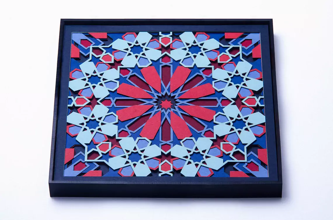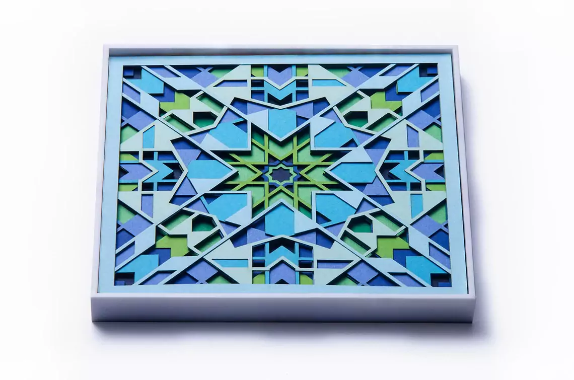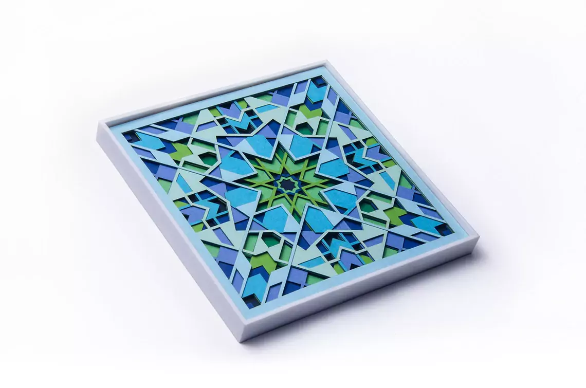 Each paper sculpture is made up of 10 layers of delicately cut 300gsm paper, and the alive under the spell of light. You will lose yourself as you try to decode their geometric structure. Find tranquility in this union of sacred geometry and radiant colors. Enjoy the 2D illusion from afar or come closer to experience its true dimensional value.