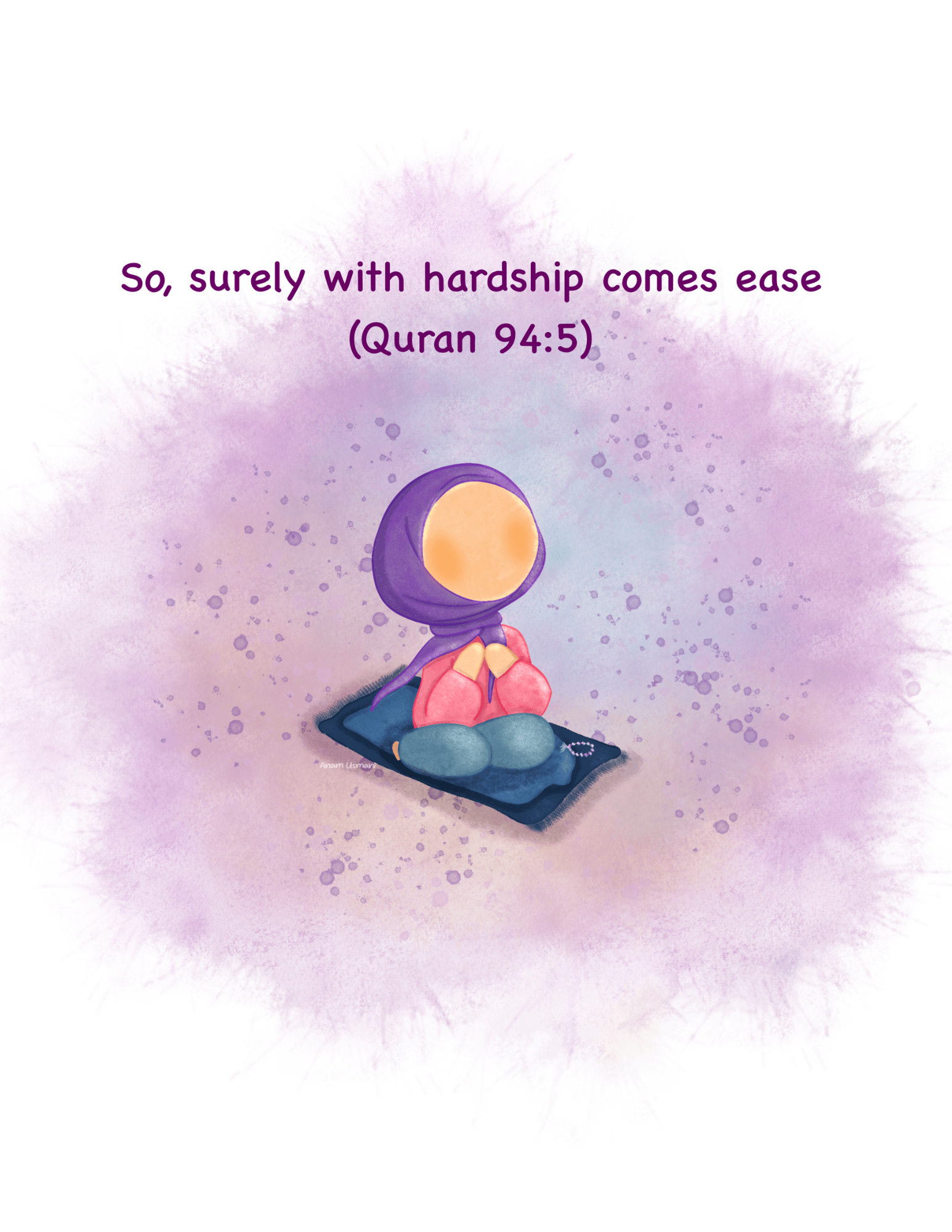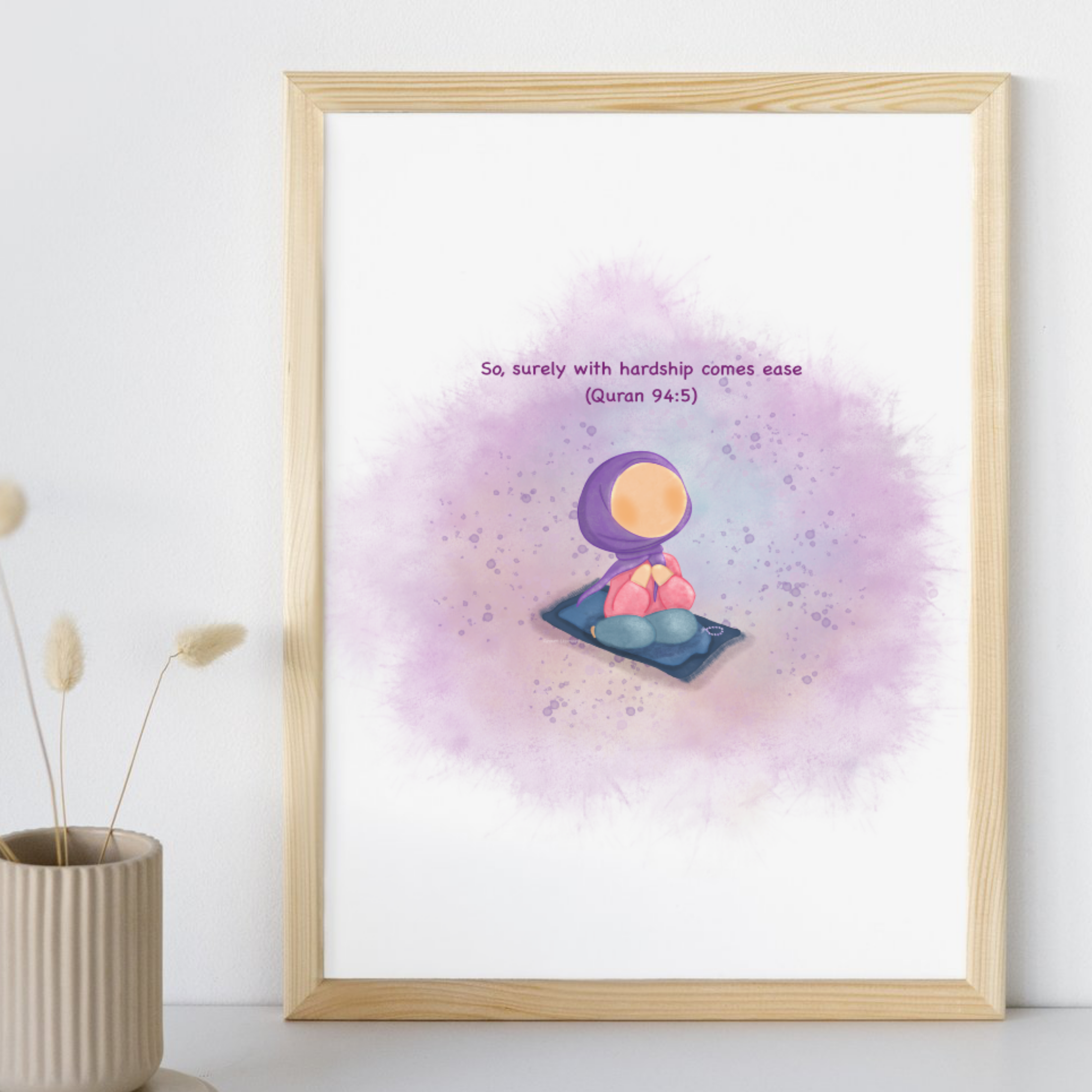 Bring a sense of peace and faith to your space with this beautiful digital art print, featuring a serene illustration of a hijabi in prayer, accompanied by the comforting Quranic verse: “So, surely with hardship comes ease” (Quran 94:5). The soft watercolor-style background in calming purple tones enhances the feeling of tranquility and hope.