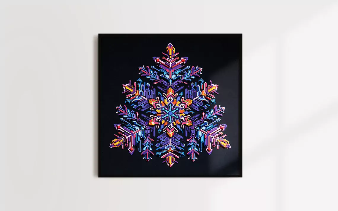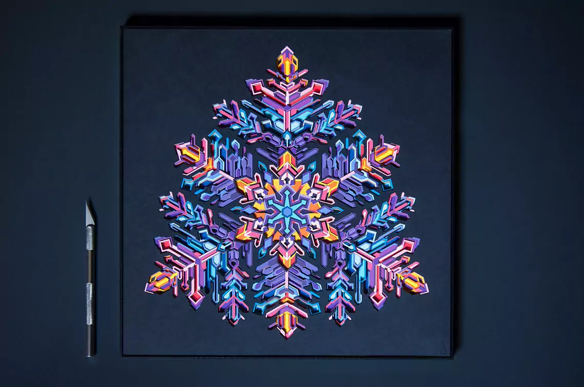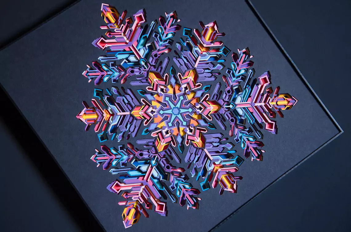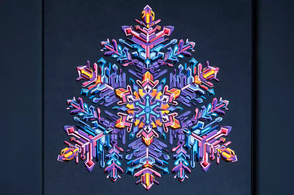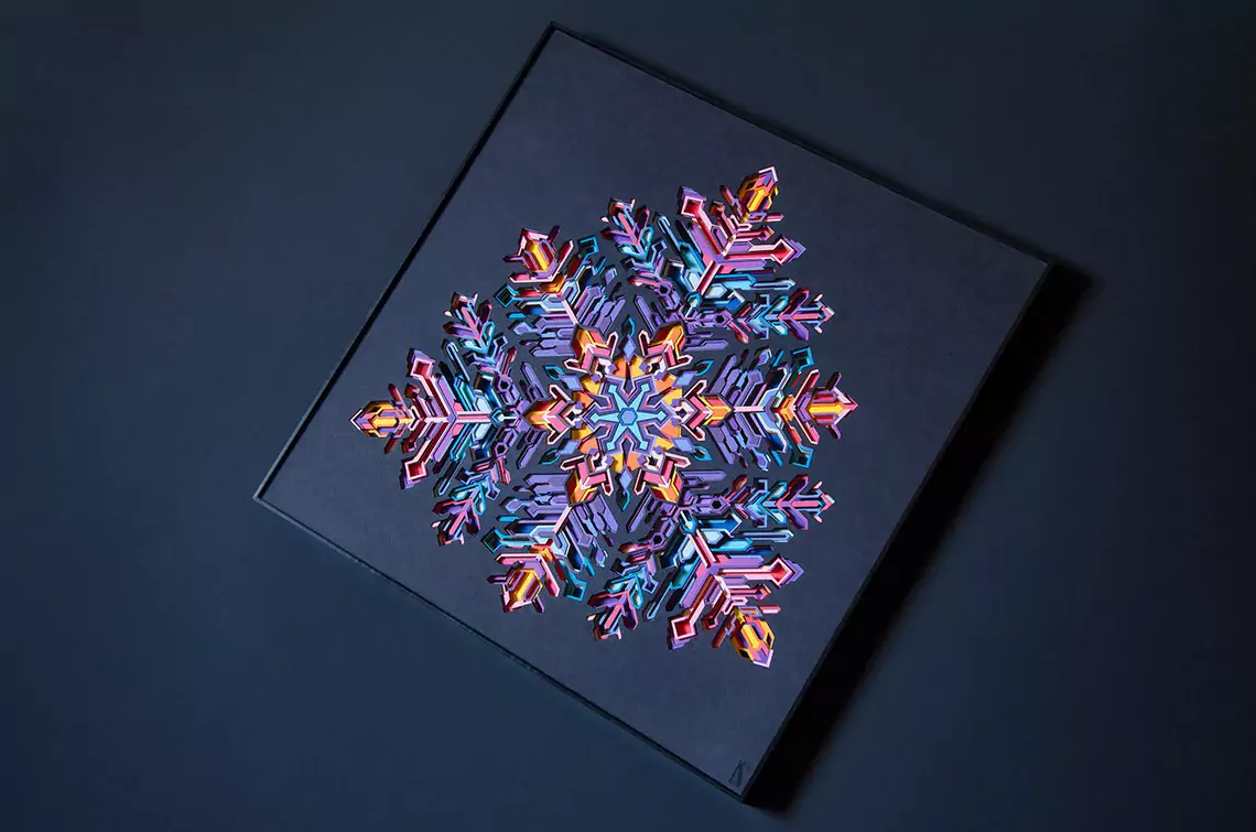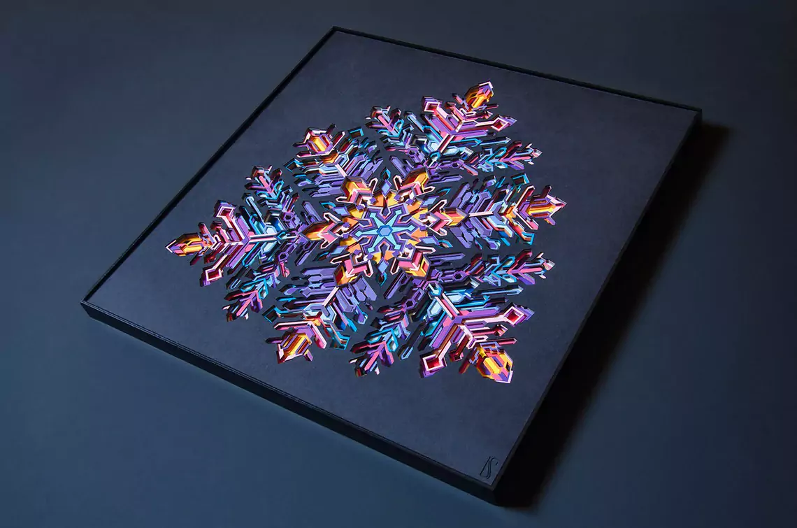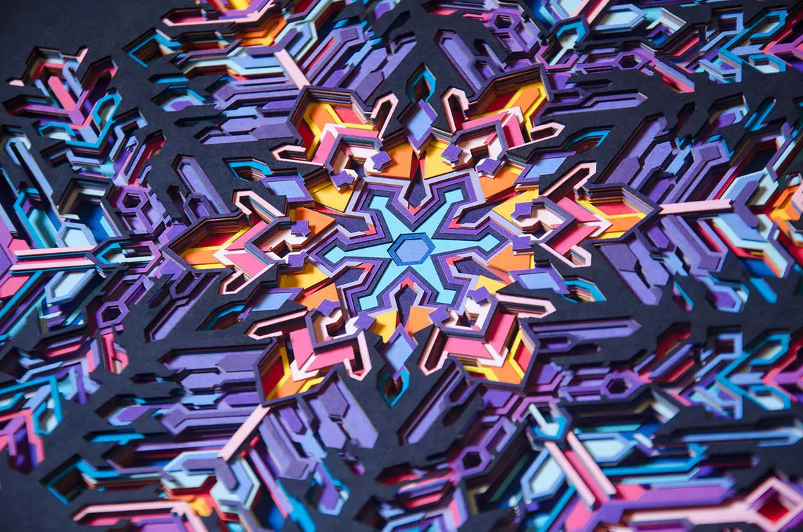 The artwork is made up of 25 layers of intricately cut paper. Each layer is stacked on top of another adding to its depth. It comes alive under the spell of light, revealing its true dimensional value. You will lose yourself in the art as you decode the geometric complexity and color transitions. Enjoy the 2D illusion from afar or come closer for the 3D experience.