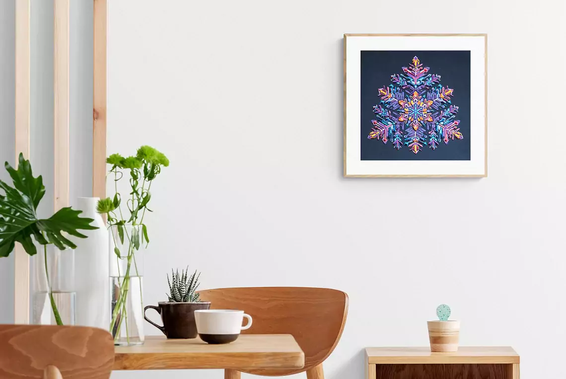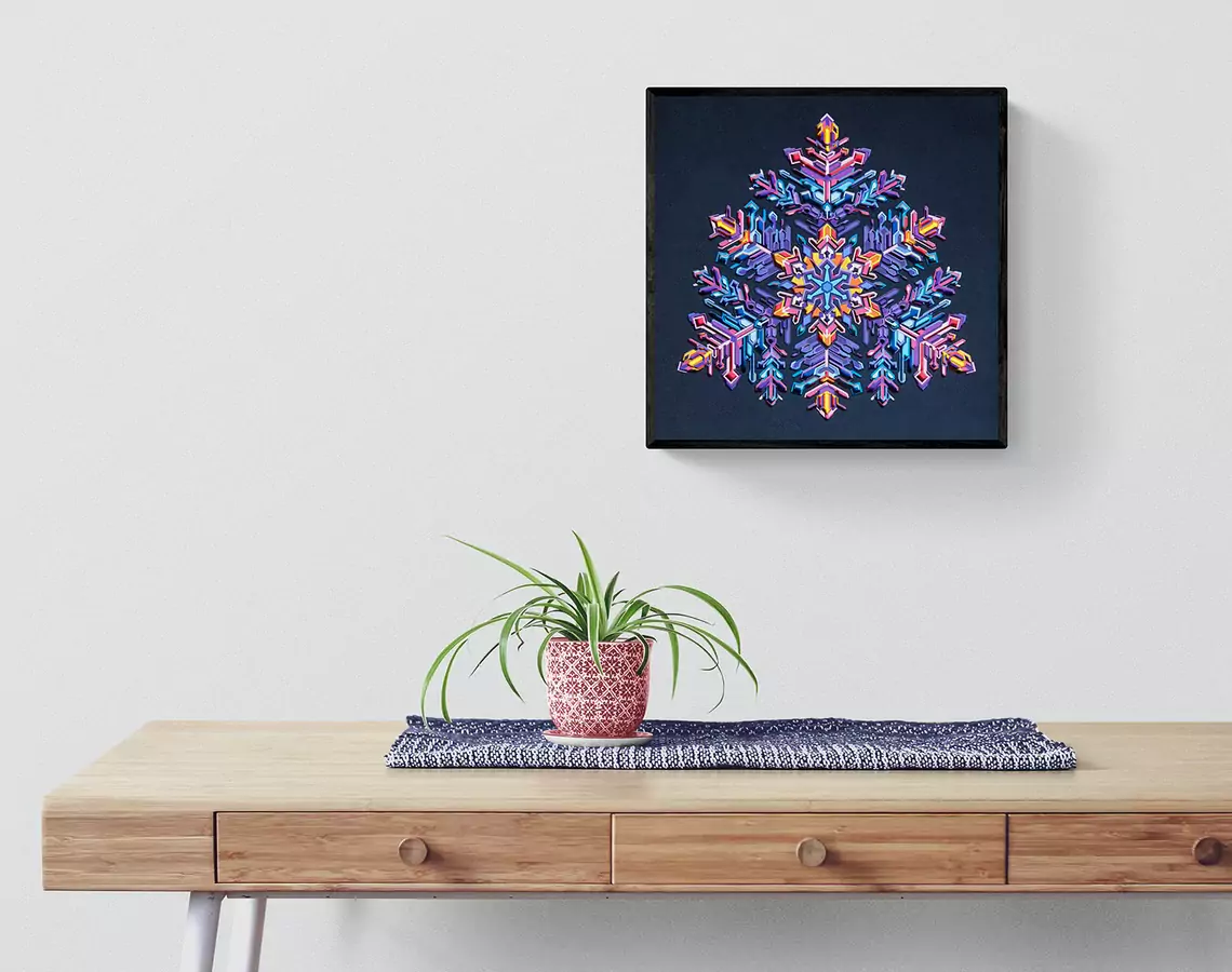 Through this artwork I have explored the fantasy of what if the snow crystal captured what it witnessed. A memory frozen within its heart that blooms into its structure and colors. Titled 'Thunderstorm' the artwork captures lighting in all its glory. The thunderbolts branching into smaller ones as it spreads and illuminates the sky for a split second in shades of violet, pink, purple, cyan, yellow.