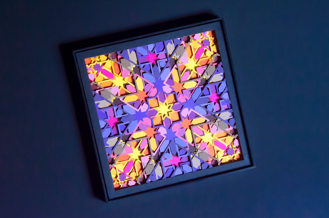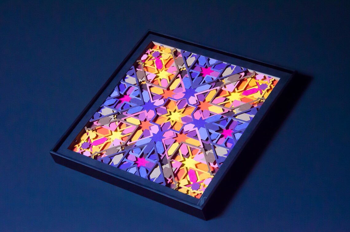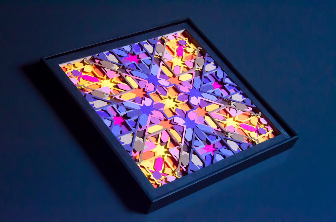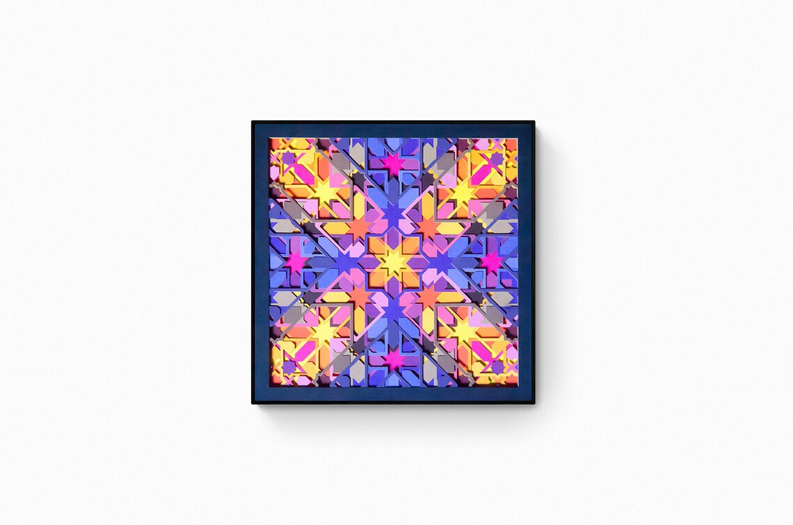 This artwork 'Iridescence' is part of the series 'Spectral Matrix' that deciphers complex geometry through selective use of the color spectrum. A vivid color palette and how it is used at various levels of the structure unveils a mesmerizing pattern. The play of light & shadow orchestrates dramatic outcomes, turning chaos into beautiful prismatic arena. The title of the artwork is evident of what this union of geometry and colors reveals. 'Fireworks' has 20 layers of paper and a palette of 20 vivid colors. It will be a kaleidoscopic ornament for your personal space and be truly cherished. ------------------------------------------------------------------------------ THE MAKING It kicks off with drawing and designing an intricate geometric framework. The design is broken down into levels and filled with colors that contrast and complement each other. Mesmerizing patterns are uncovered by highlighting and subduing different elements in the matrix. An accurate cutting is done using a mix of machine and hand cuts for getting the best of both worlds. Under the play of light & shadows the final step of layer assembly turns the 2D design into a 3D structure. A high level of precision is required as small errors lead to entire redoes. ------------------------------------------------------------------------------ PLEASE NOTE ● LIMITED EDITION of 12 ● The artwork is available in three sizes 6" x 6" x 0.4" (15cm x 15cm x 1cm) 8" x 8" x 0.4" (20cm x 20cm x 1cm) 10" x 10" x 0.4" (25cm x 25cm x 1cm) ● Product will be shipped within 4 days. ● Certificate of Authenticity will be provided with the artwork. ● The frames shown in the images are for representational purpose only. The artwork comes unframed. ● If you wish to discuss framing options kindly contact me.