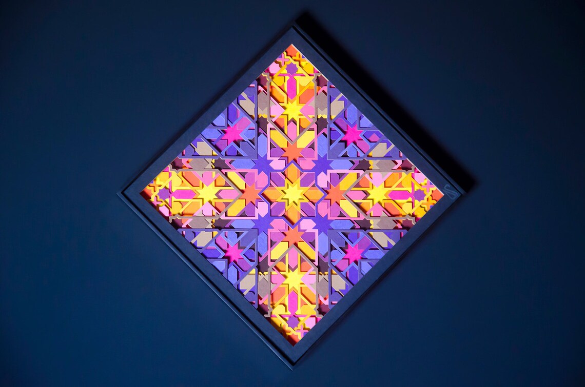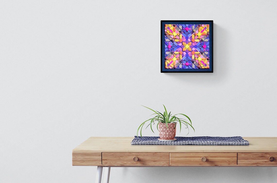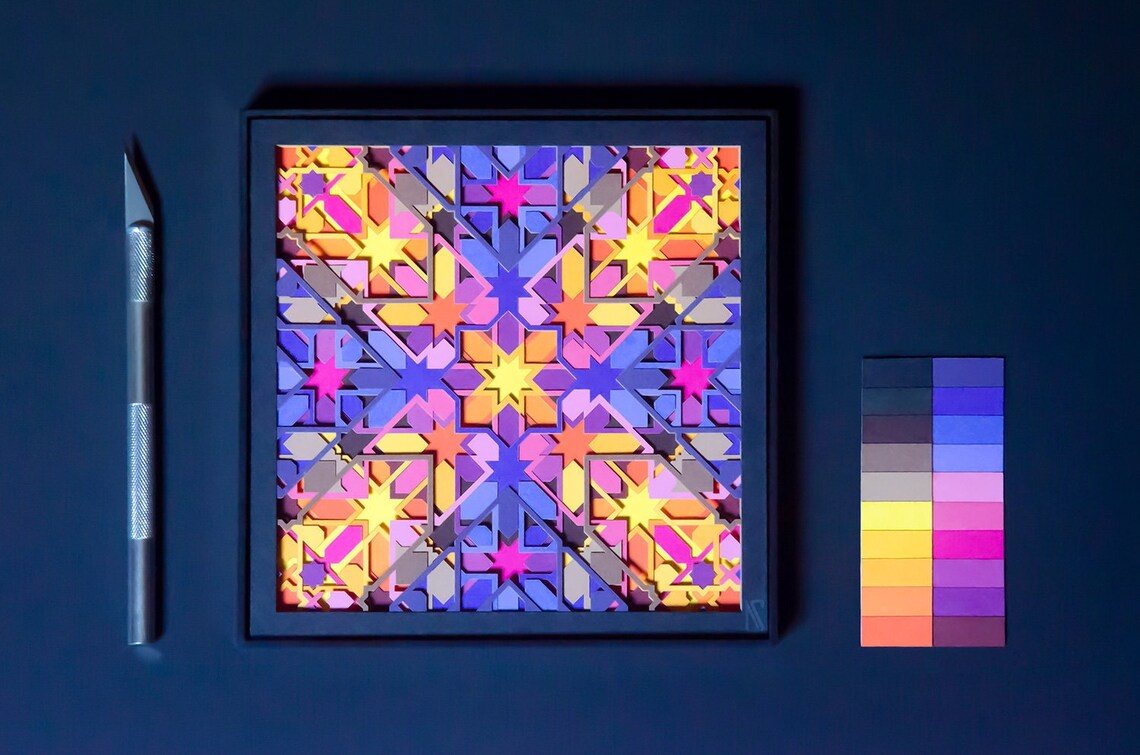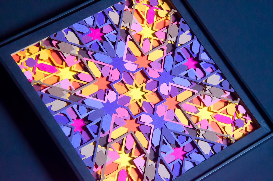 This artwork 'Iridescence' is part of the series 'Spectral Matrix' that deciphers complex geometry through selective use of the color spectrum. A vivid color palette and how it is used at various levels of the structure unveils a mesmerizing pattern. The play of light & shadow orchestrates dramatic outcomes, turning chaos into beautiful prismatic arena. The title of the artwork is evident of what this union of geometry and colors reveals. 'Fireworks' has 20 layers of paper and a palette of 20 vivid colors. It will be a kaleidoscopic ornament for your personal space and be truly cherished. ------------------------------------------------------------------------------ THE MAKING It kicks off with drawing and designing an intricate geometric framework. The design is broken down into levels and filled with colors that contrast and complement each other. Mesmerizing patterns are uncovered by highlighting and subduing different elements in the matrix. An accurate cutting is done using a mix of machine and hand cuts for getting the best of both worlds. Under the play of light & shadows the final step of layer assembly turns the 2D design into a 3D structure. A high level of precision is required as small errors lead to entire redoes. ------------------------------------------------------------------------------ PLEASE NOTE ● LIMITED EDITION of 12 ● The artwork is available in three sizes 6" x 6" x 0.4" (15cm x 15cm x 1cm) 8" x 8" x 0.4" (20cm x 20cm x 1cm) 10" x 10" x 0.4" (25cm x 25cm x 1cm) ● Product will be shipped within 4 days. ● Certificate of Authenticity will be provided with the artwork. ● The frames shown in the images are for representational purpose only. The artwork comes unframed. ● If you wish to discuss framing options kindly contact me.