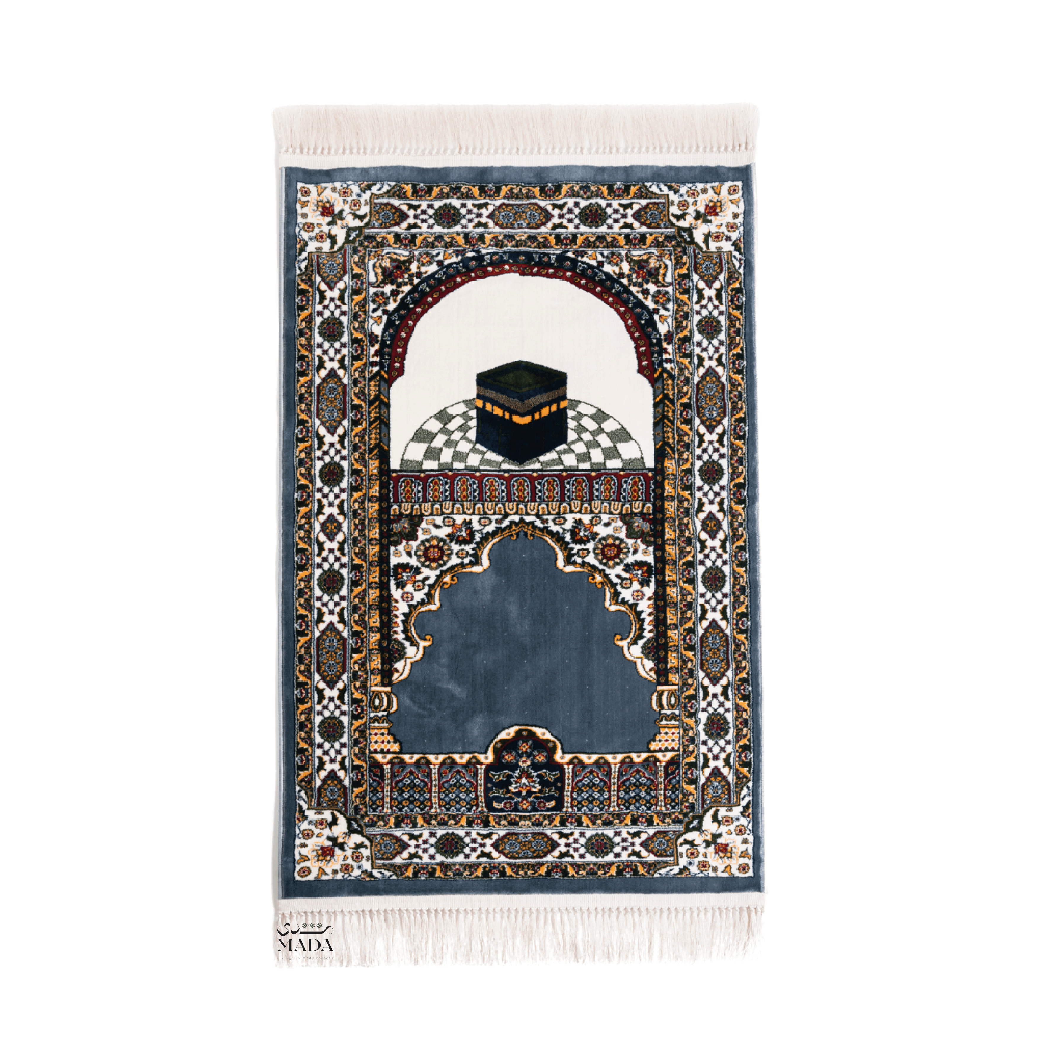The Kaabah Heritage Prayer Rug captures the awe of standing before the Kaabah, framed within a grand arch that evokes the architectural elegance of Islamic tradition. Its detailed depiction of the Kaabah on a tiled mihrab-like platform invites stillness, focus, and reverence.