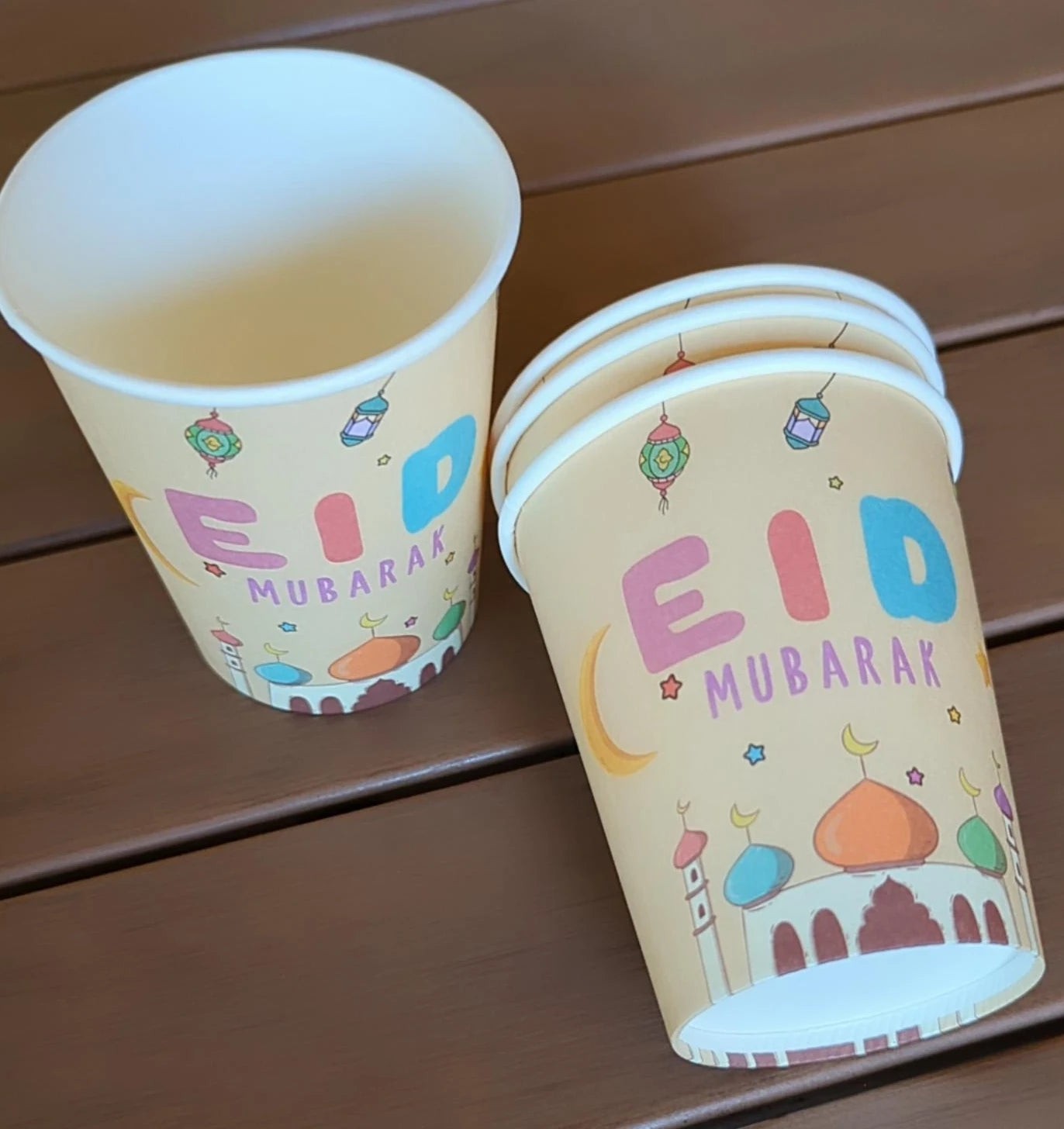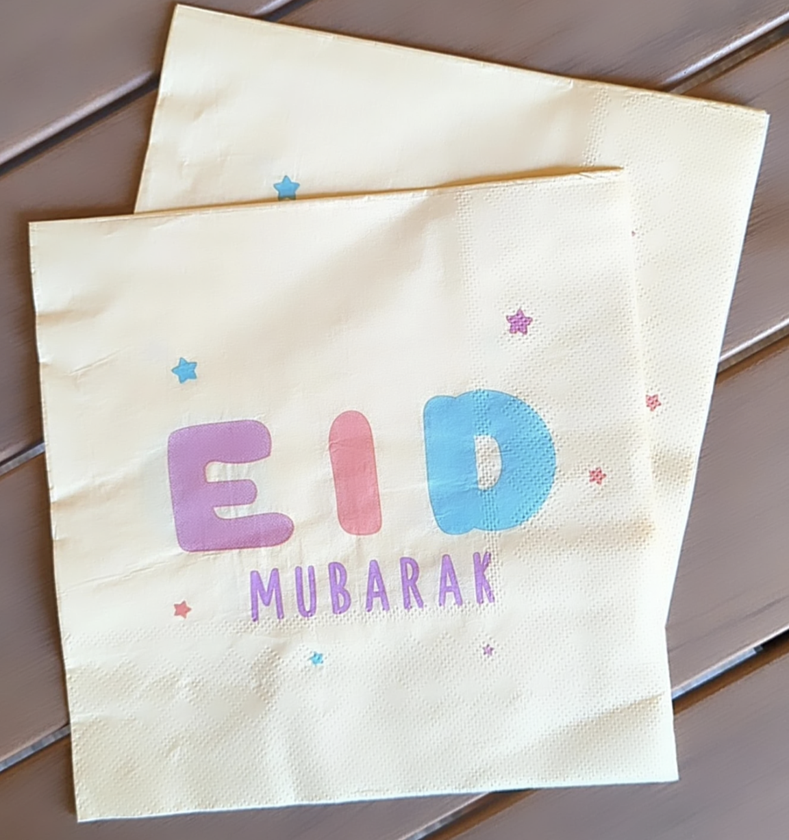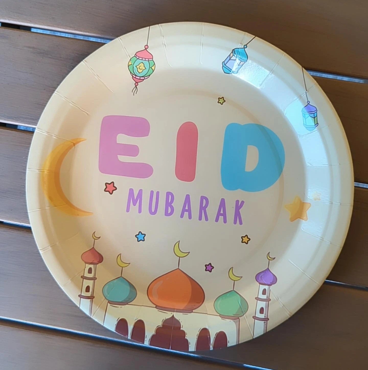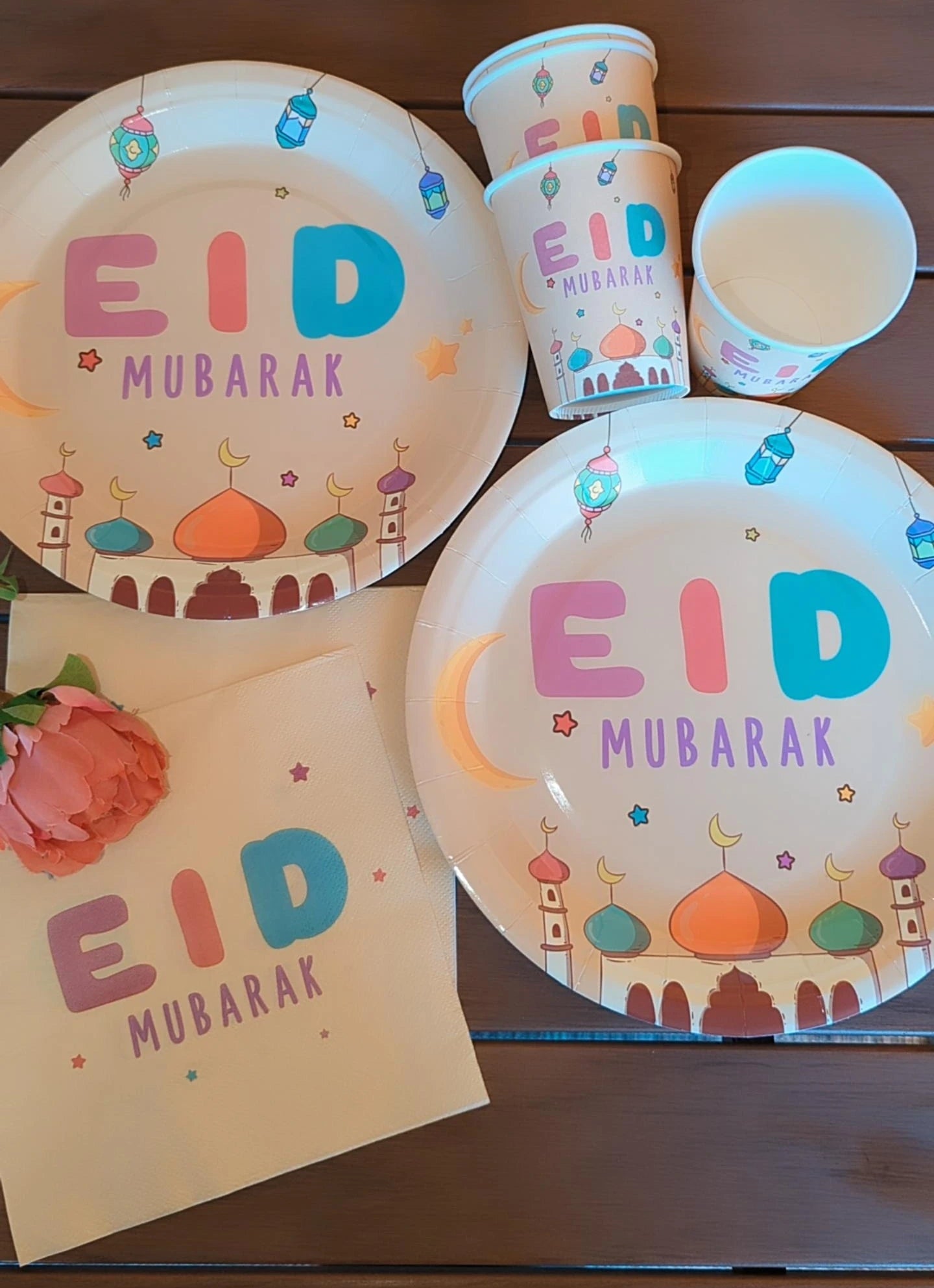 Introducing our newest addition for this year: our exquisite Eid Mubarak tableware set, featuring the playful Masjid & Lanterns design. Enjoy the vibrant theme with matching cups, plates, and napkins.