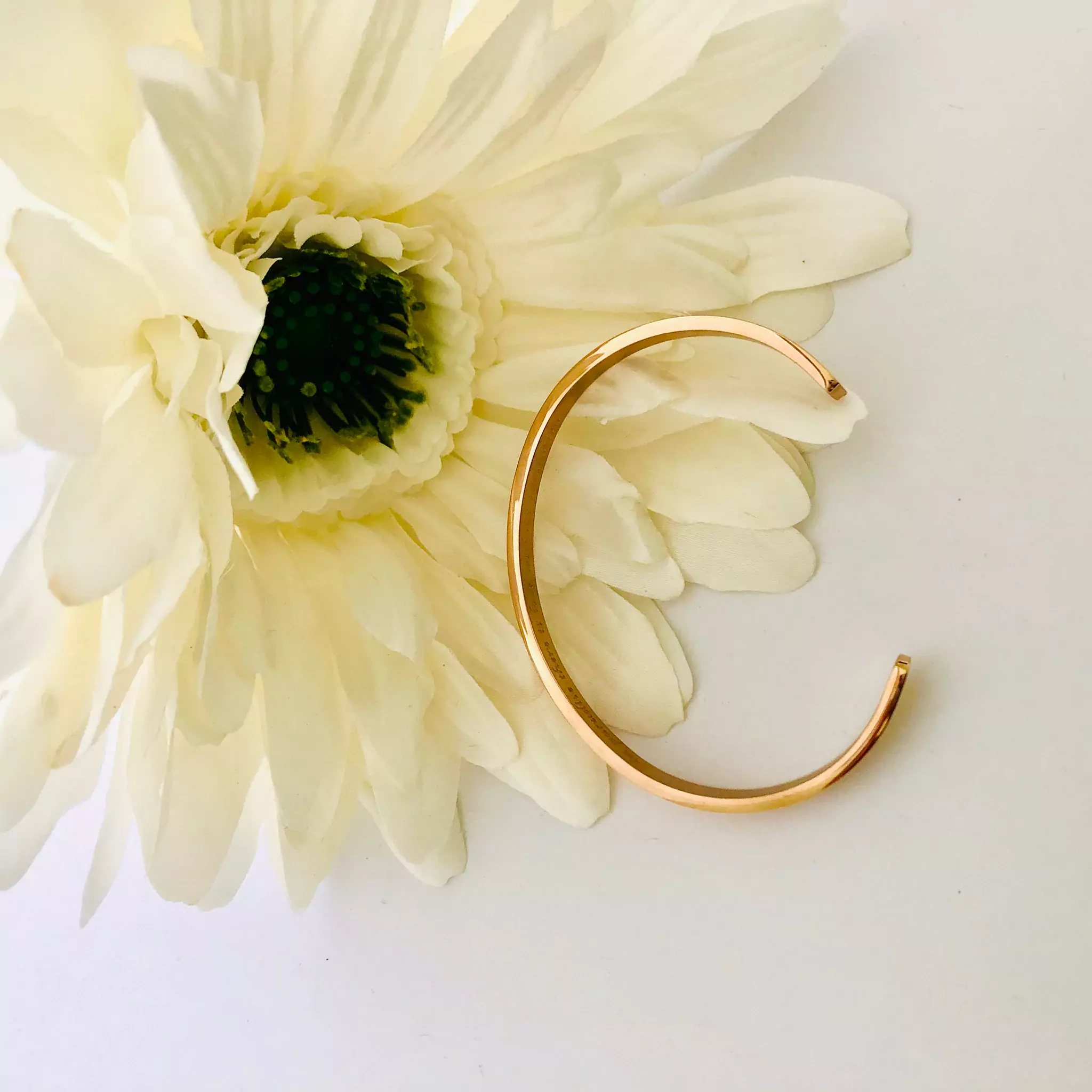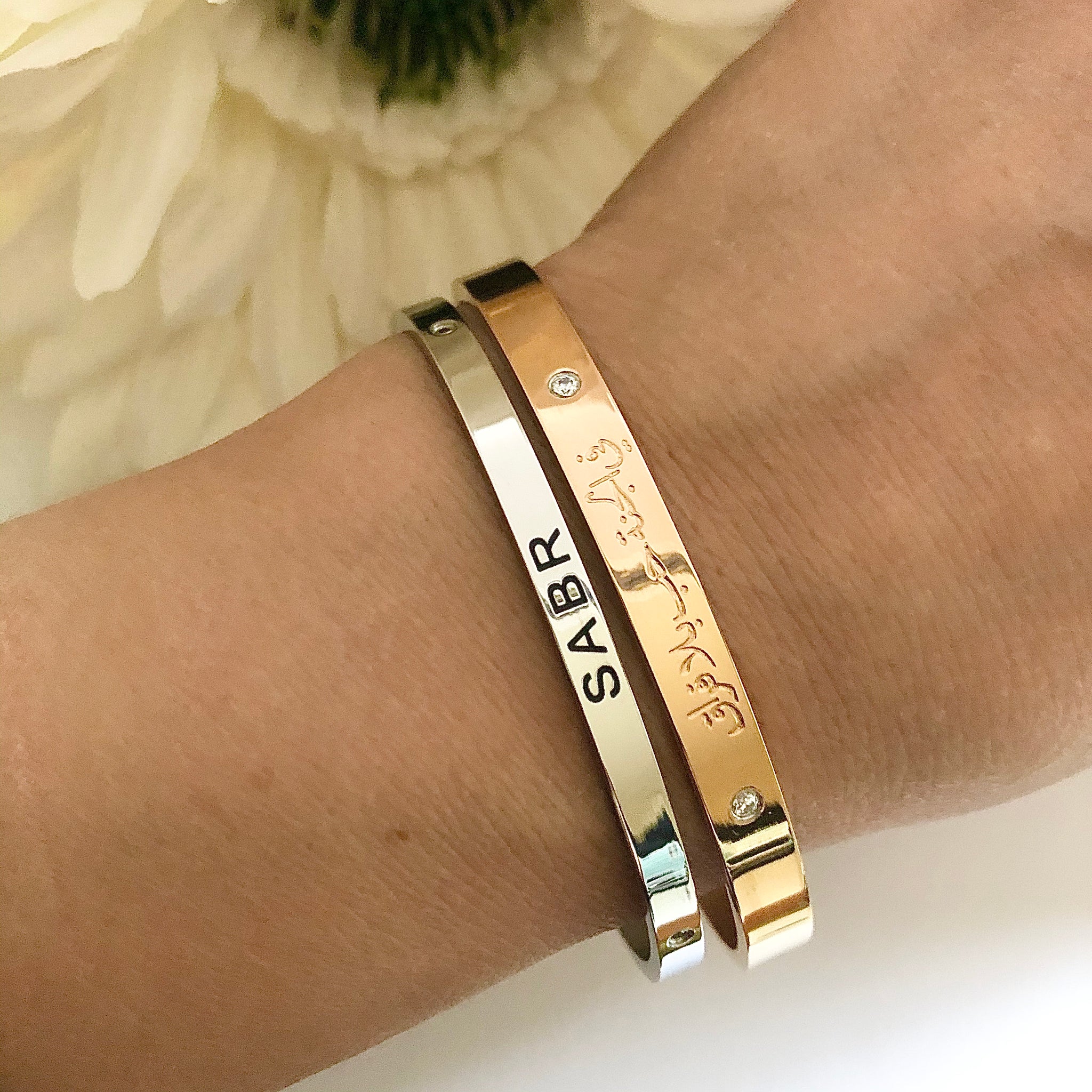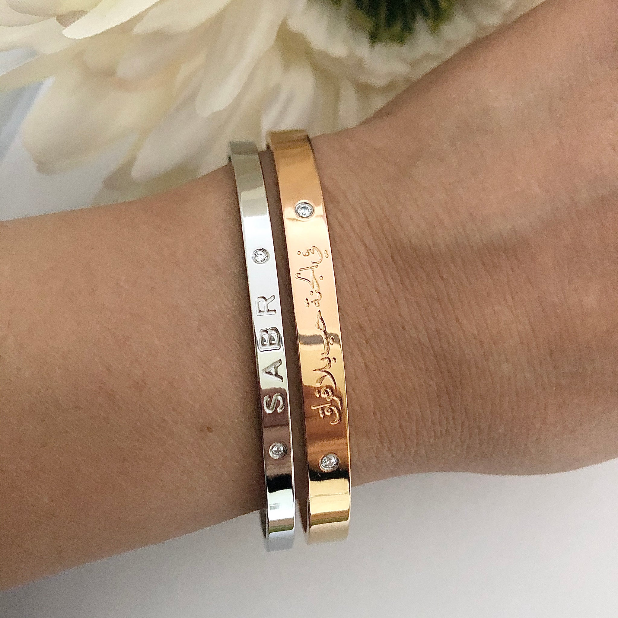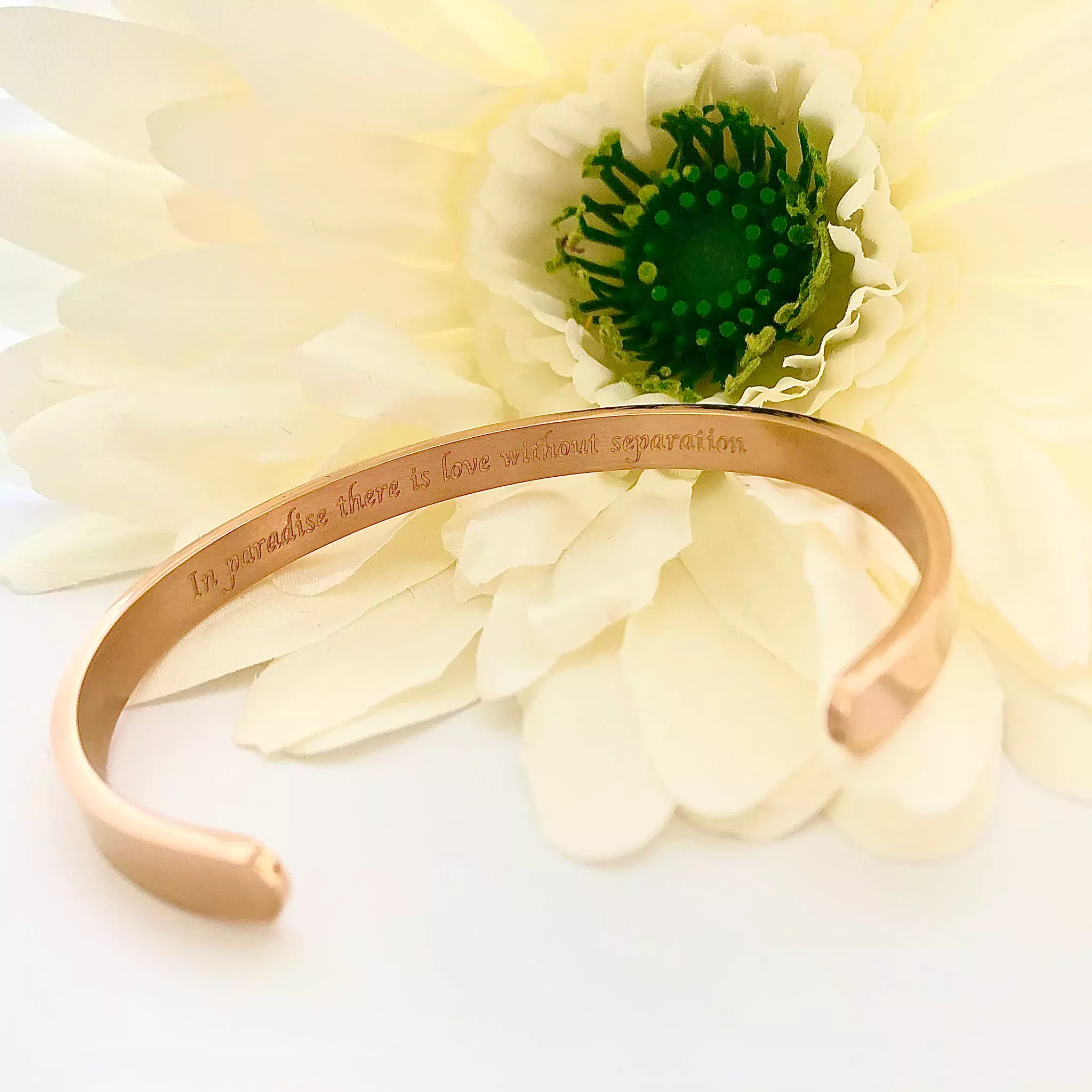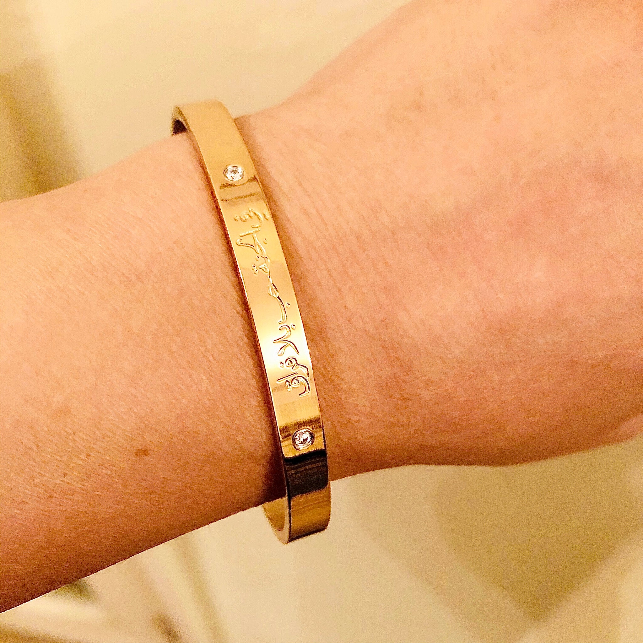 This special cuff is charmingly engraved with the Arabic proverb “In paradise there is love without separation”. The outside of the cuff is engraved with delicate Arabic lettering and the inside of the cuff is engraved with the English meaning, making this a very unusual piece and a definite conversation starter.