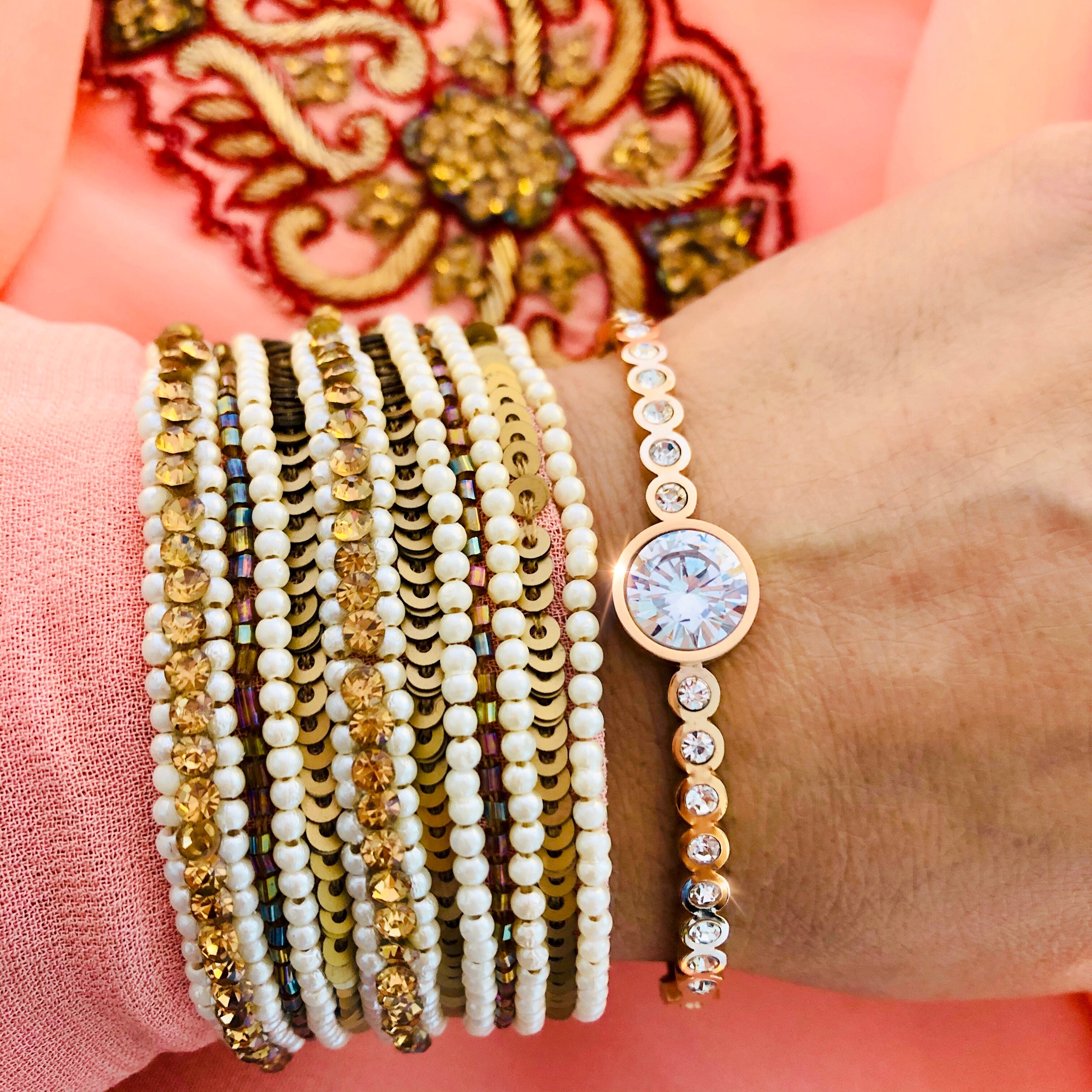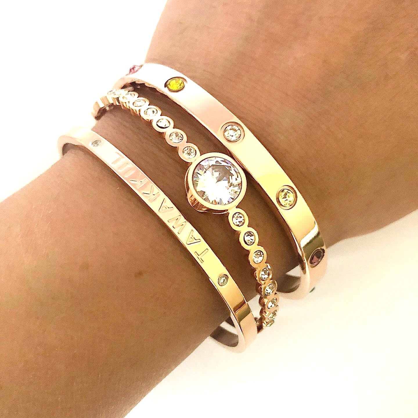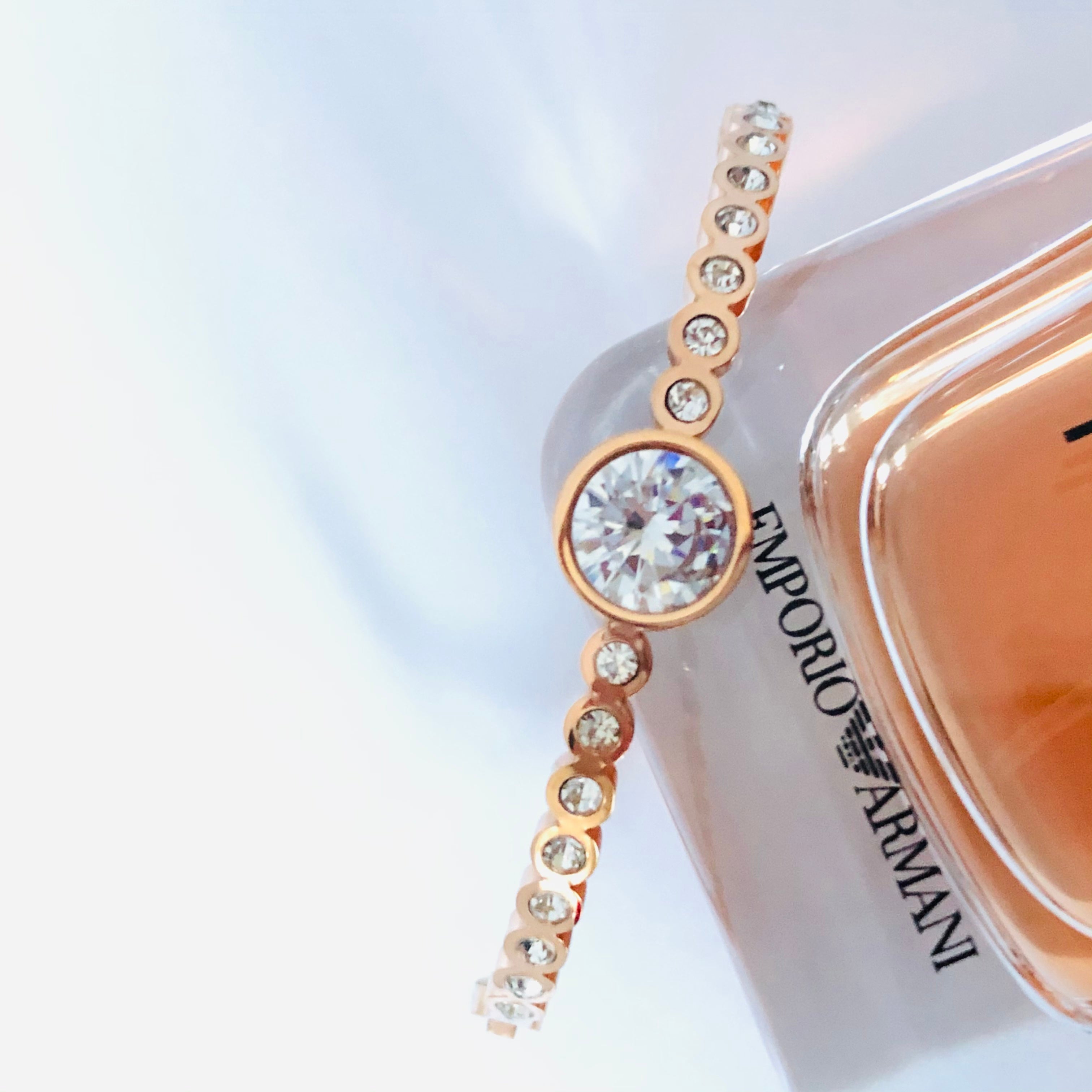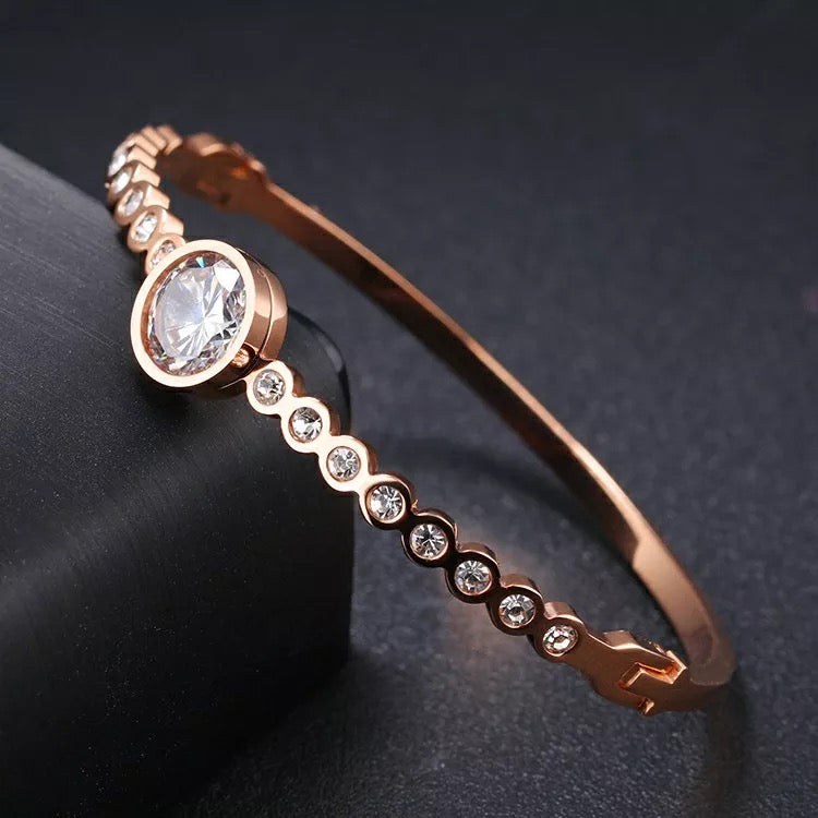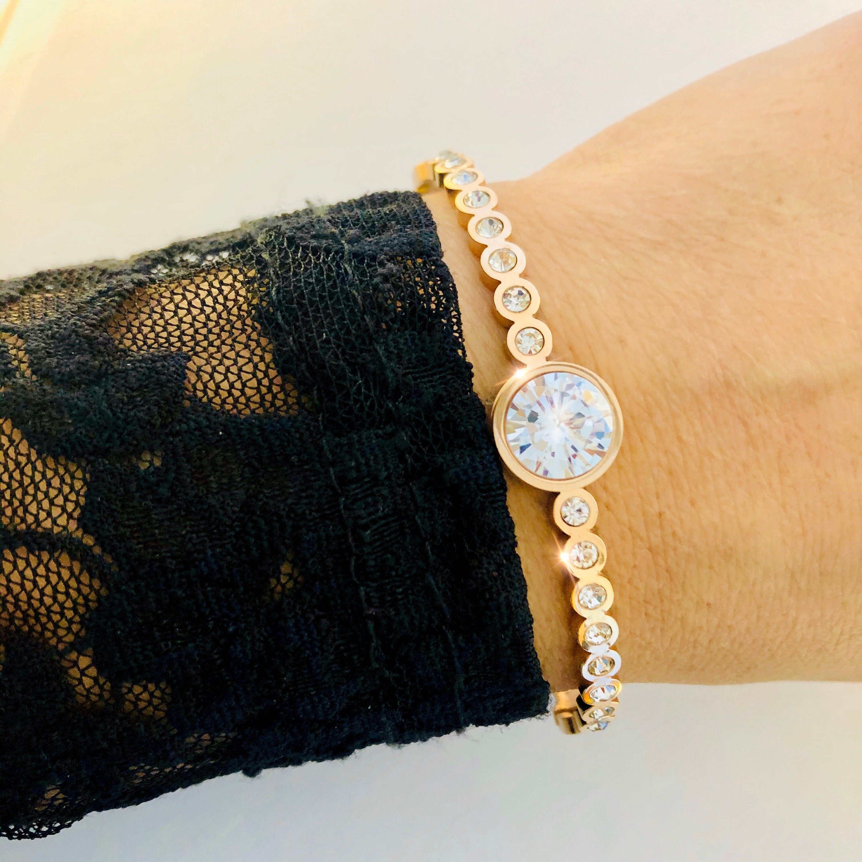 This rich and luscious 18k Rose Gold Plated bangle sparkles with the brilliance and magnificence of diamonds - at a fraction of the price! Each Cubic Zirconia stone radiates with flashes of fire as the bangle moves around on the wrist. Cubic Zirconia is second only to diamonds but is far more affordable.