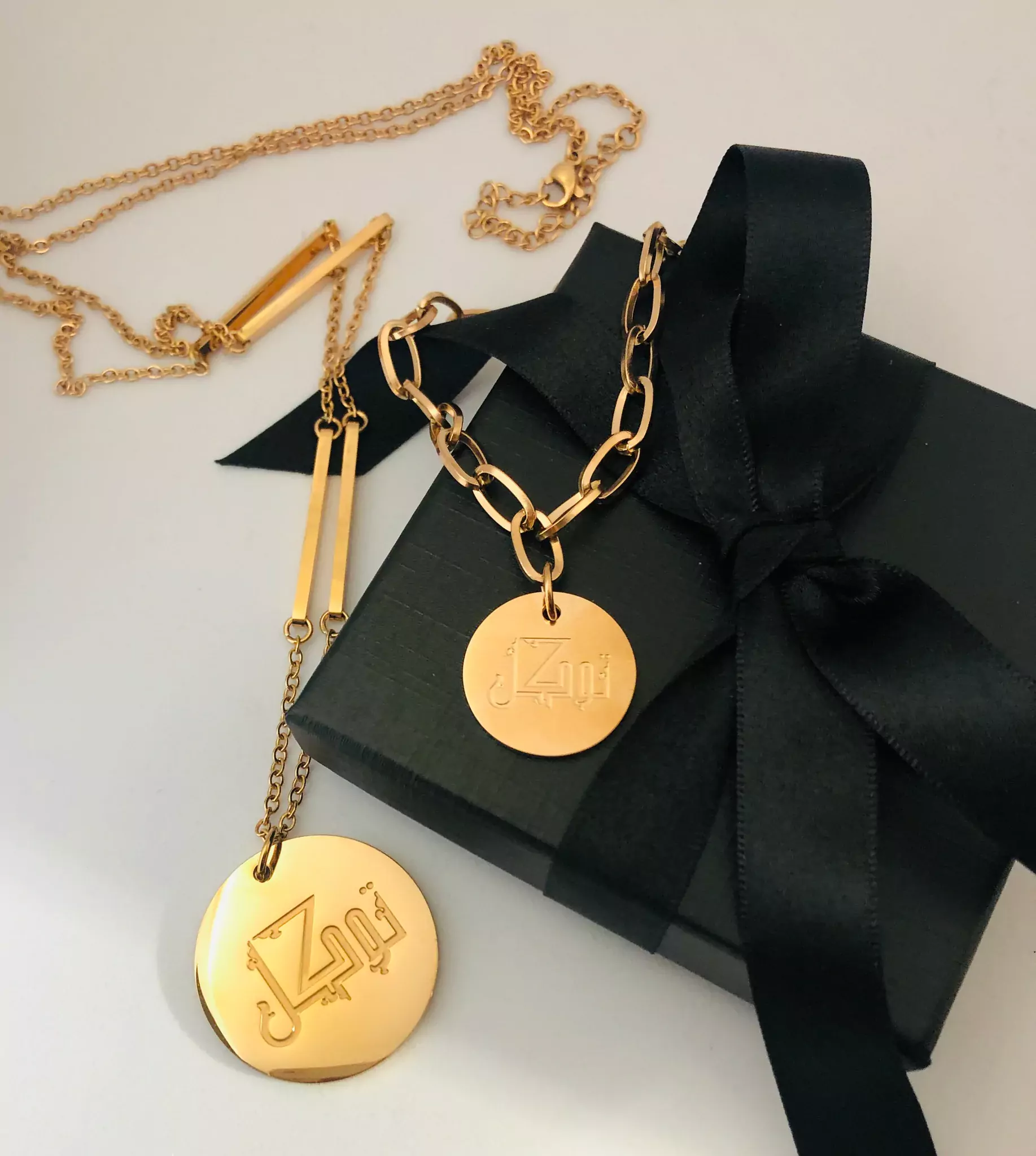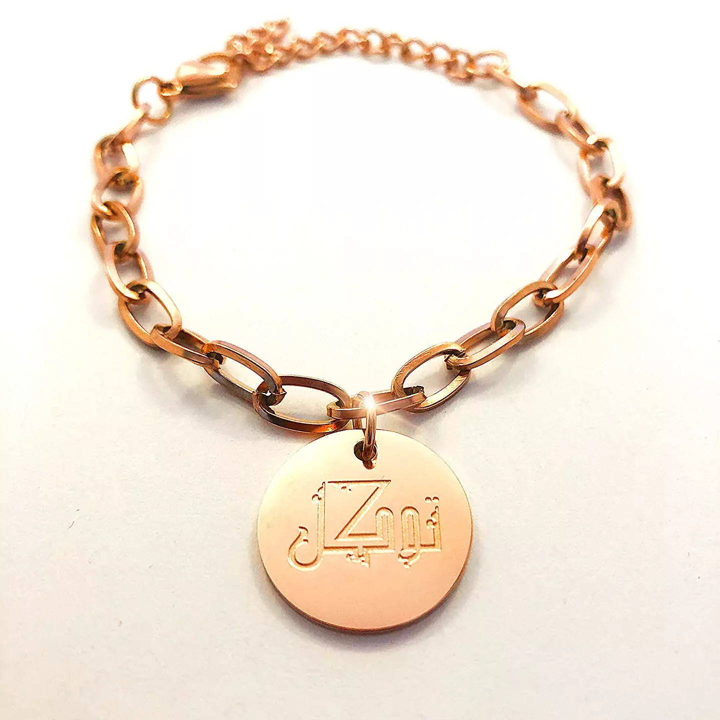 This stunning bracelet has a contemporary link chain design with a beautifully engraved charm dangling alluringly off the wrist. The charm has the Arabic word “Tawakkul” engraved on it in an artistic calligraphy design.