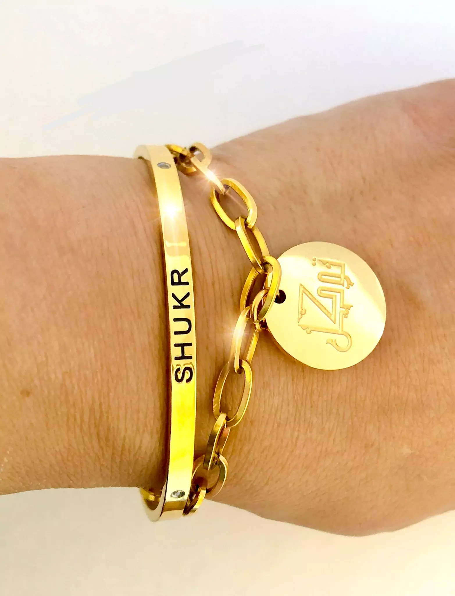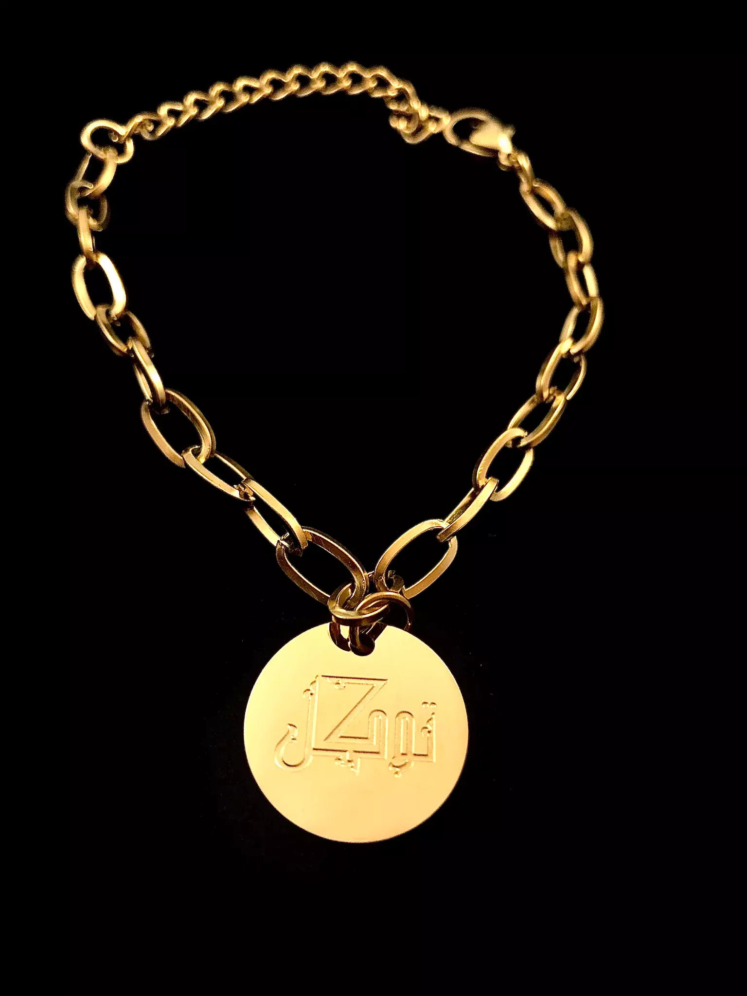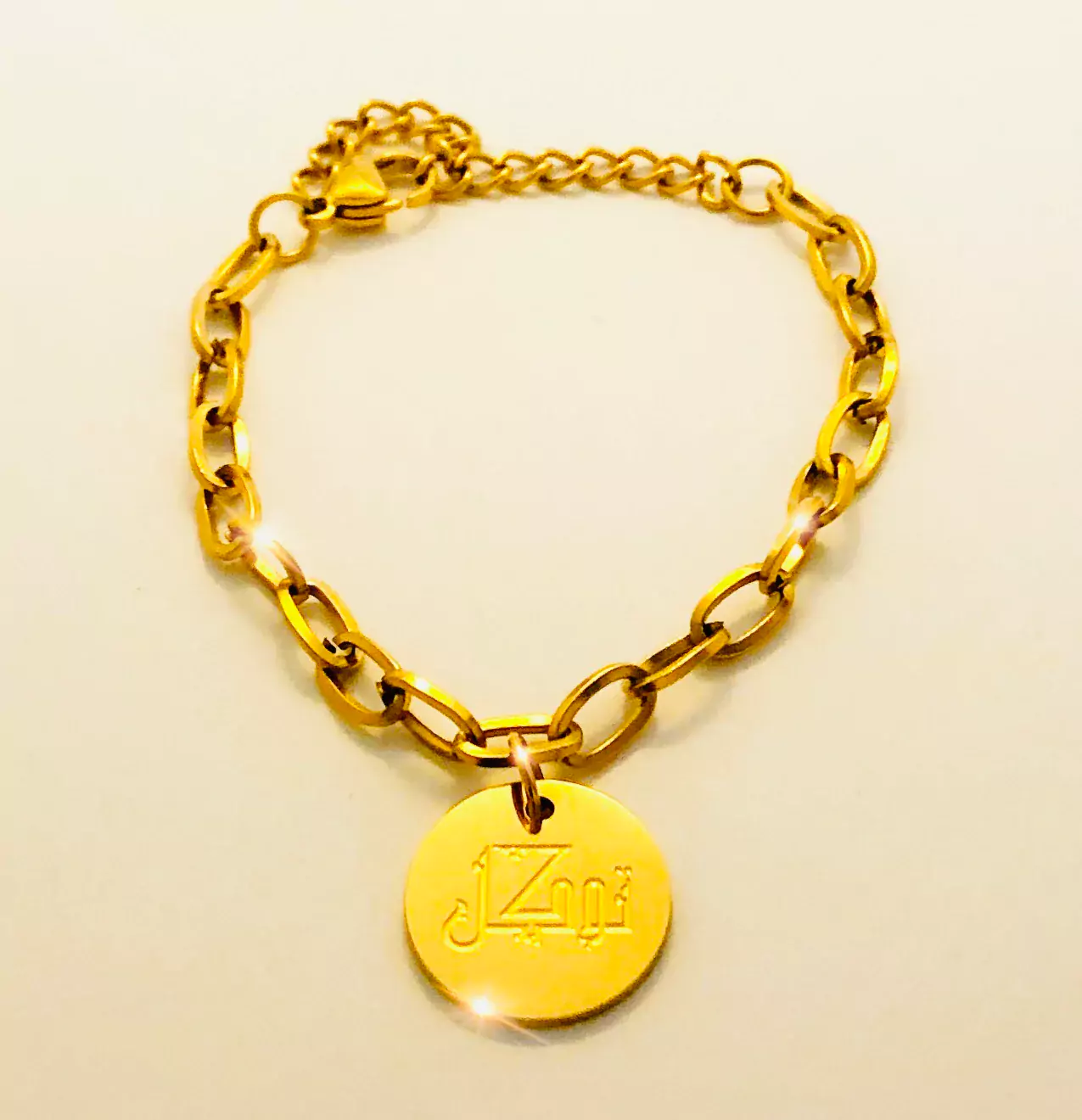 This stunning bracelet has a contemporary link chain design with a beautifully engraved charm dangling alluringly off the wrist. The charm has the Arabic word “Tawakkul” engraved on it in an artistic calligraphy design.