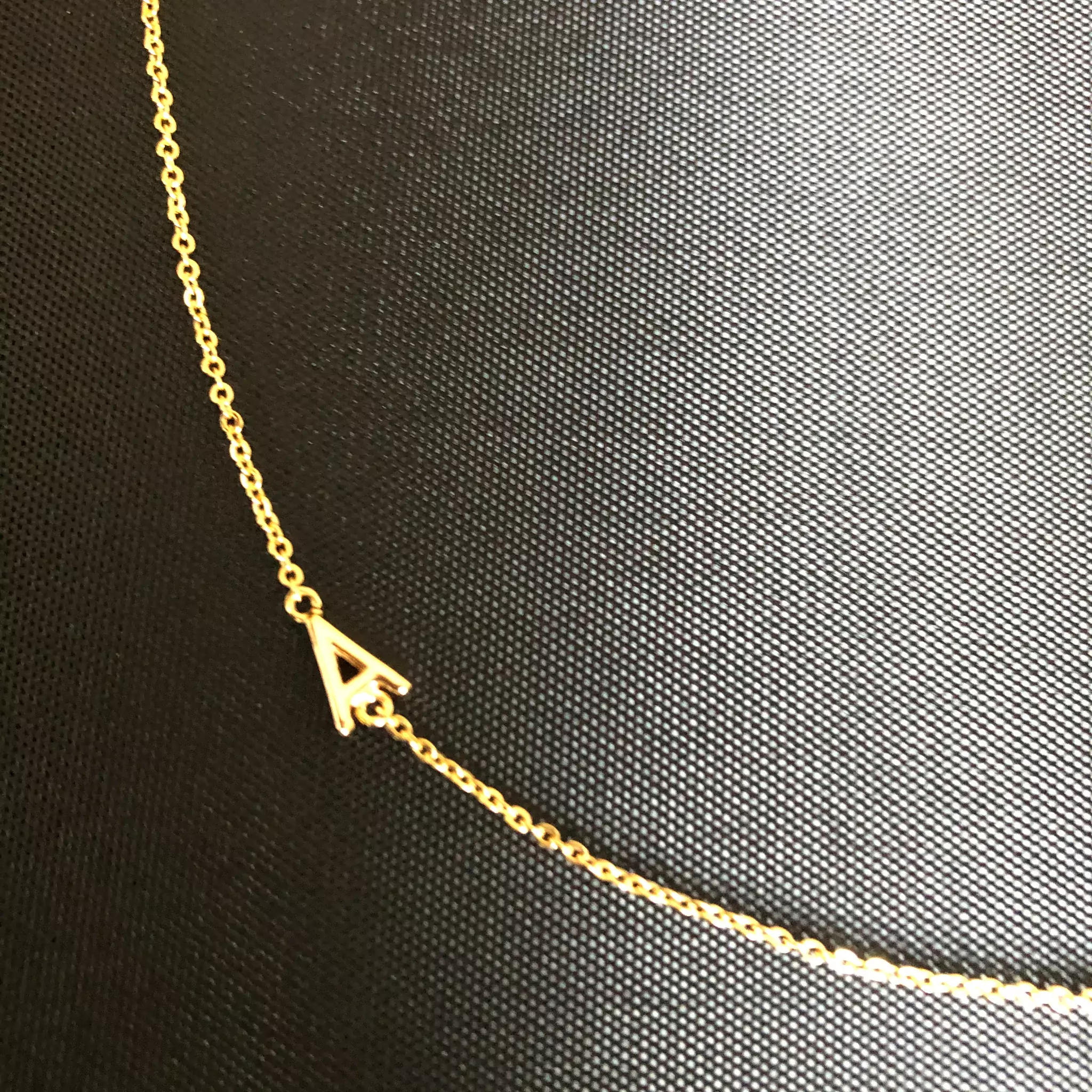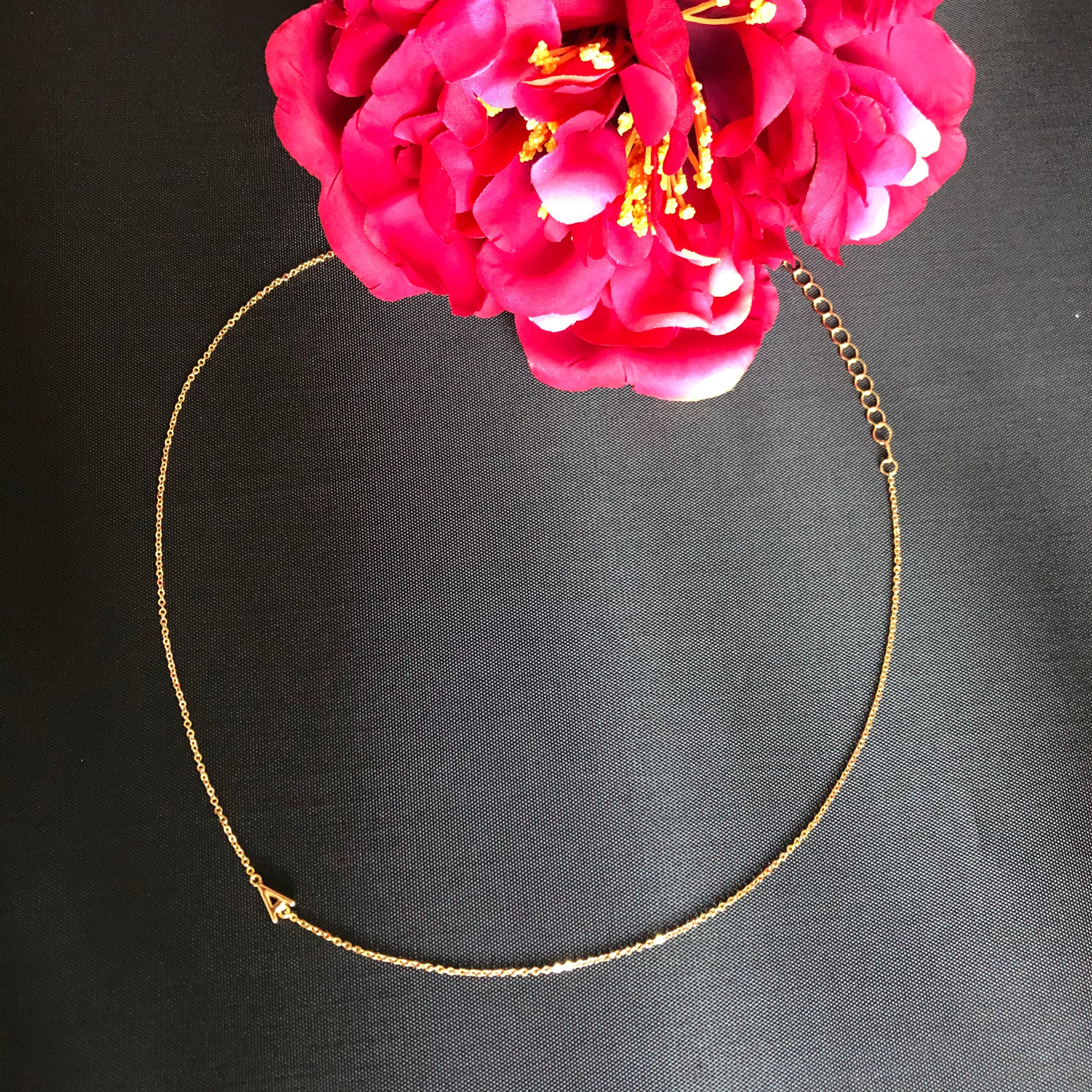 This is a delicate and luxurious little necklet. What makes it unique is that the initial hangs fashionably on the side rather than at the bottom and the initial can be worn either on the left or the right side of the neckline.
