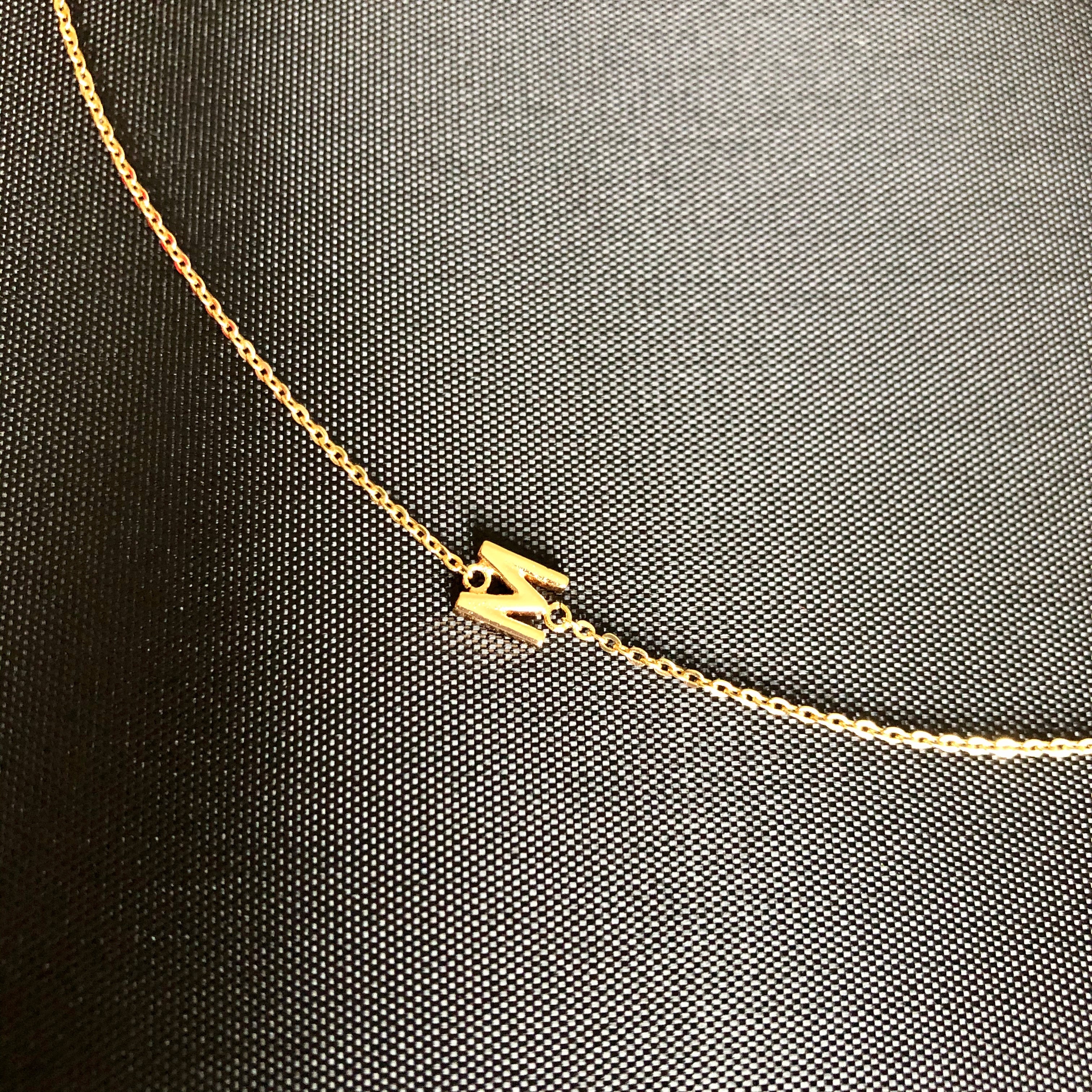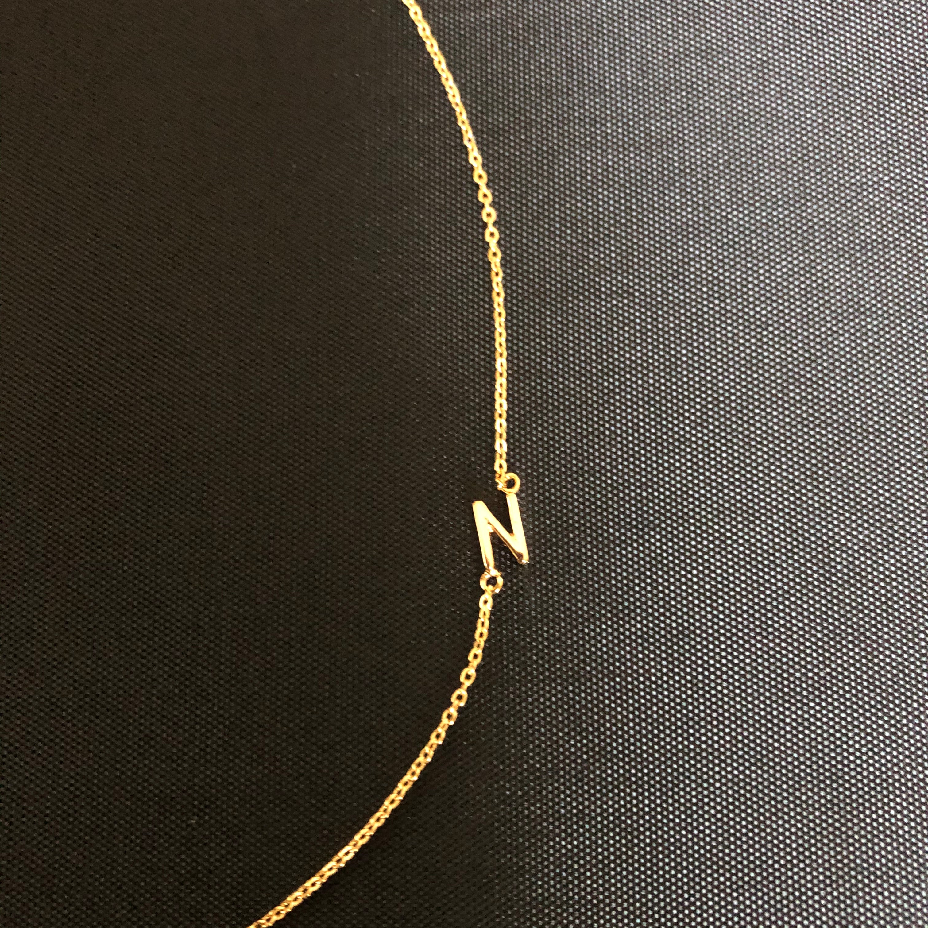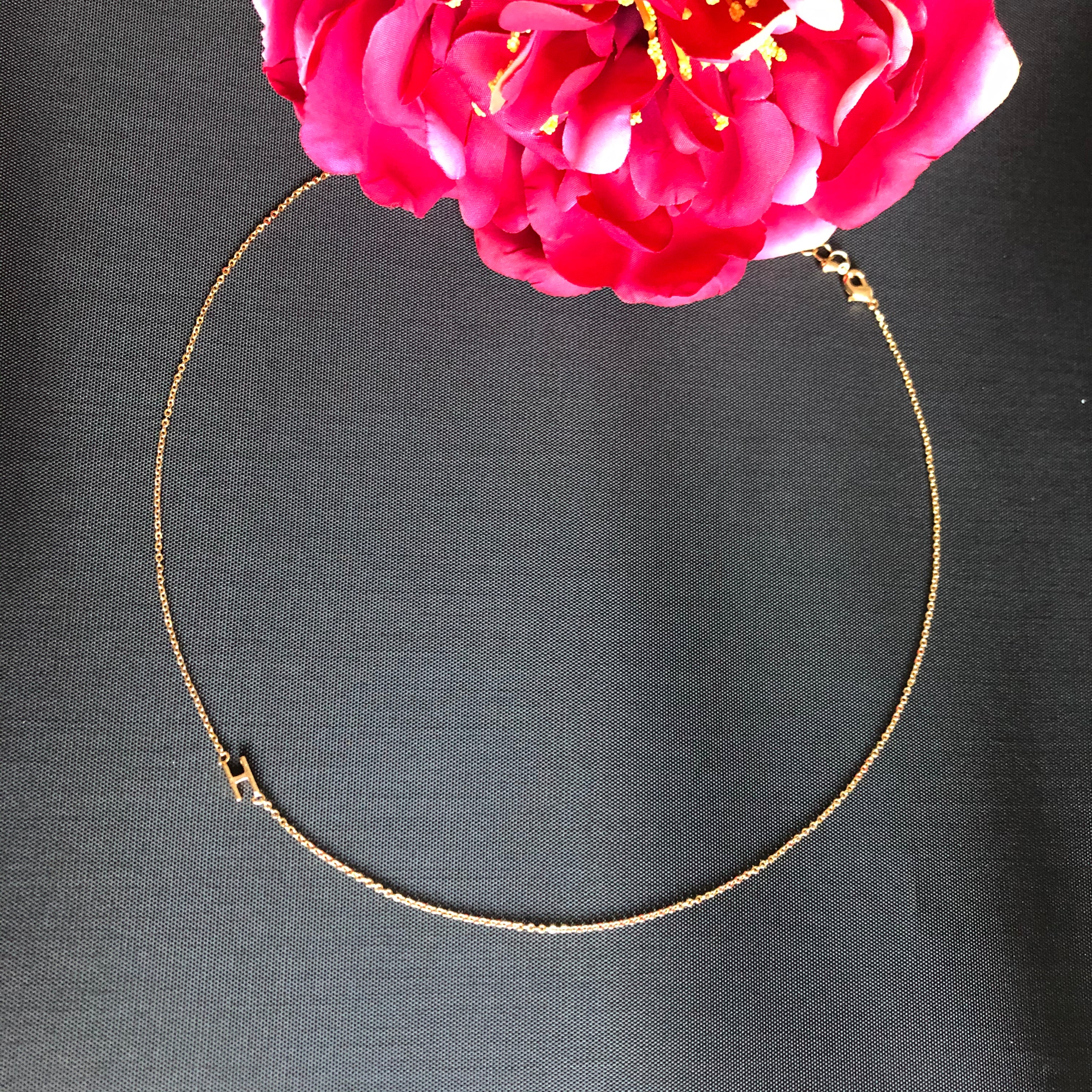 This is a delicate and luxurious little necklet made from 18K Rolled Gold. What makes it unique is that the initial hangs fashionably on the side rather than at the bottom and the initial can be worn either on the left or the right side of the neckline.