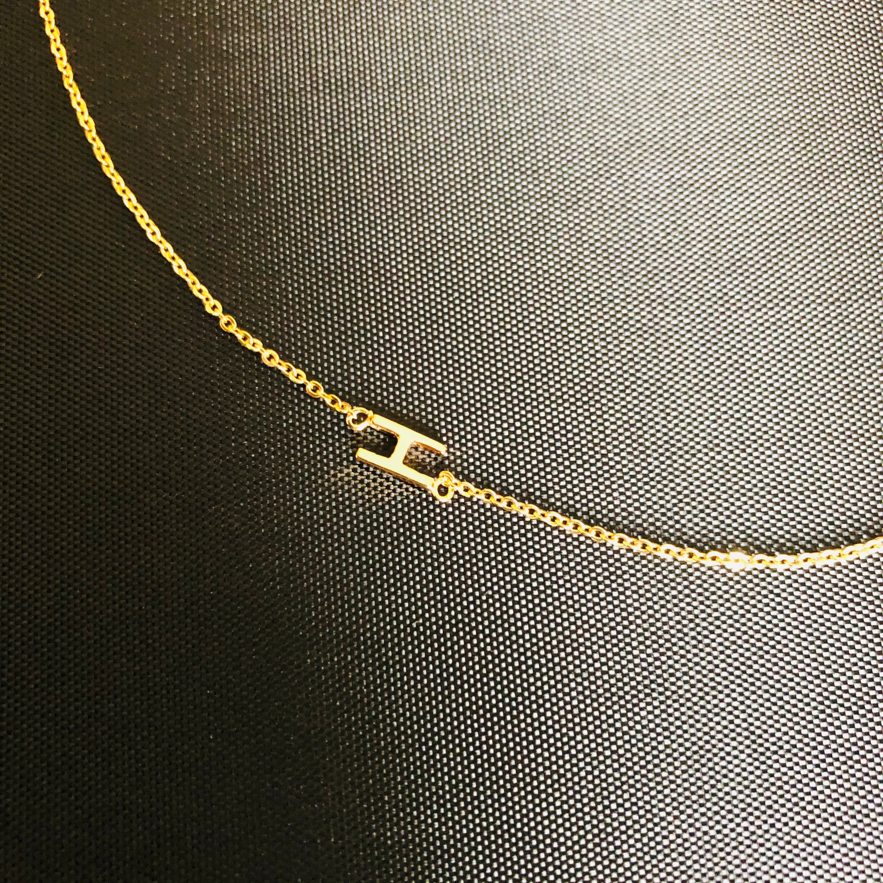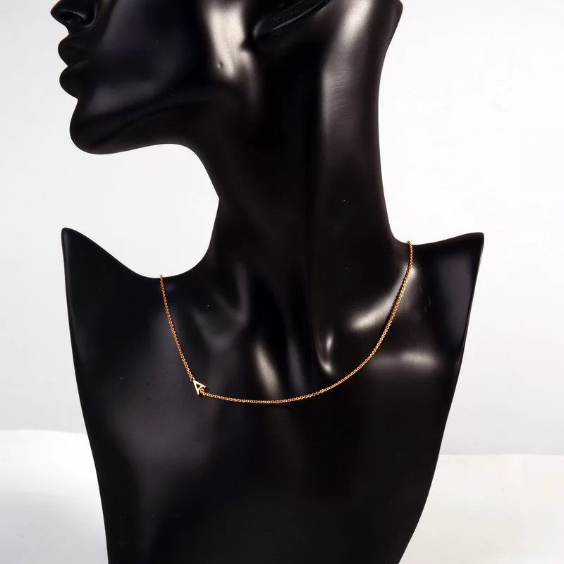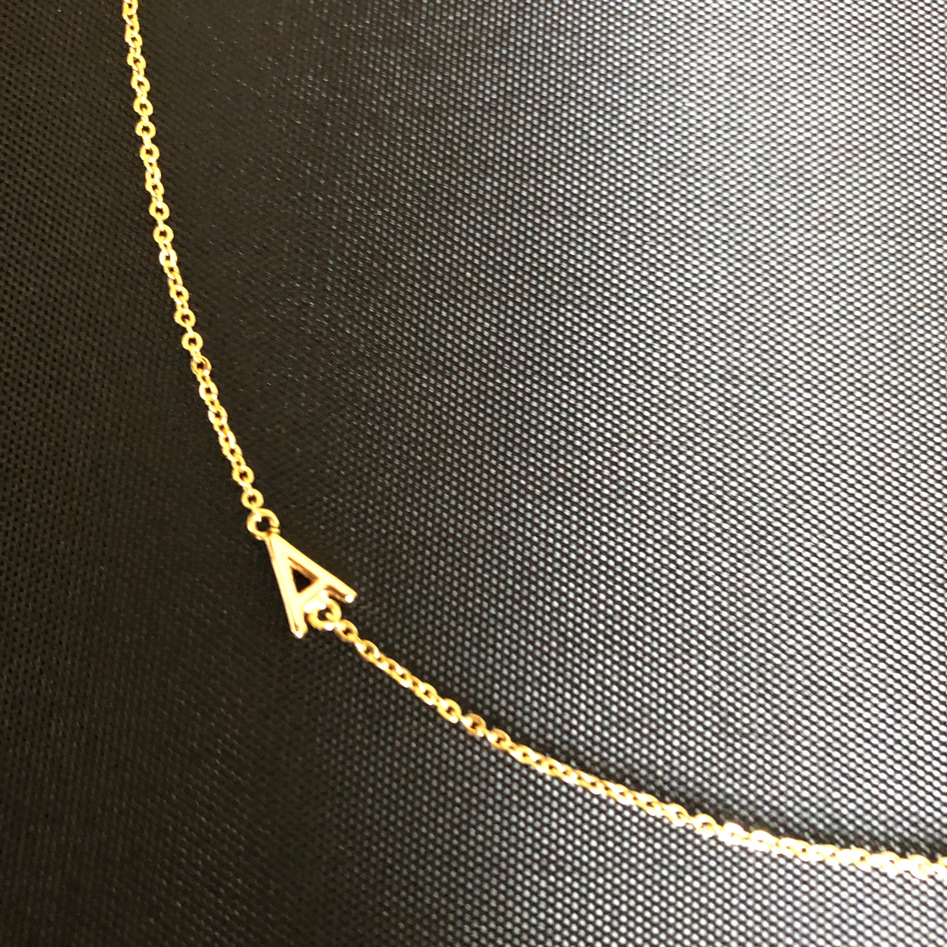 This is a delicate and luxurious little necklet made from 18K Rolled Gold. What makes it unique is that the initial hangs fashionably on the side rather than at the bottom and the initial can be worn either on the left or the right side of the neckline.
