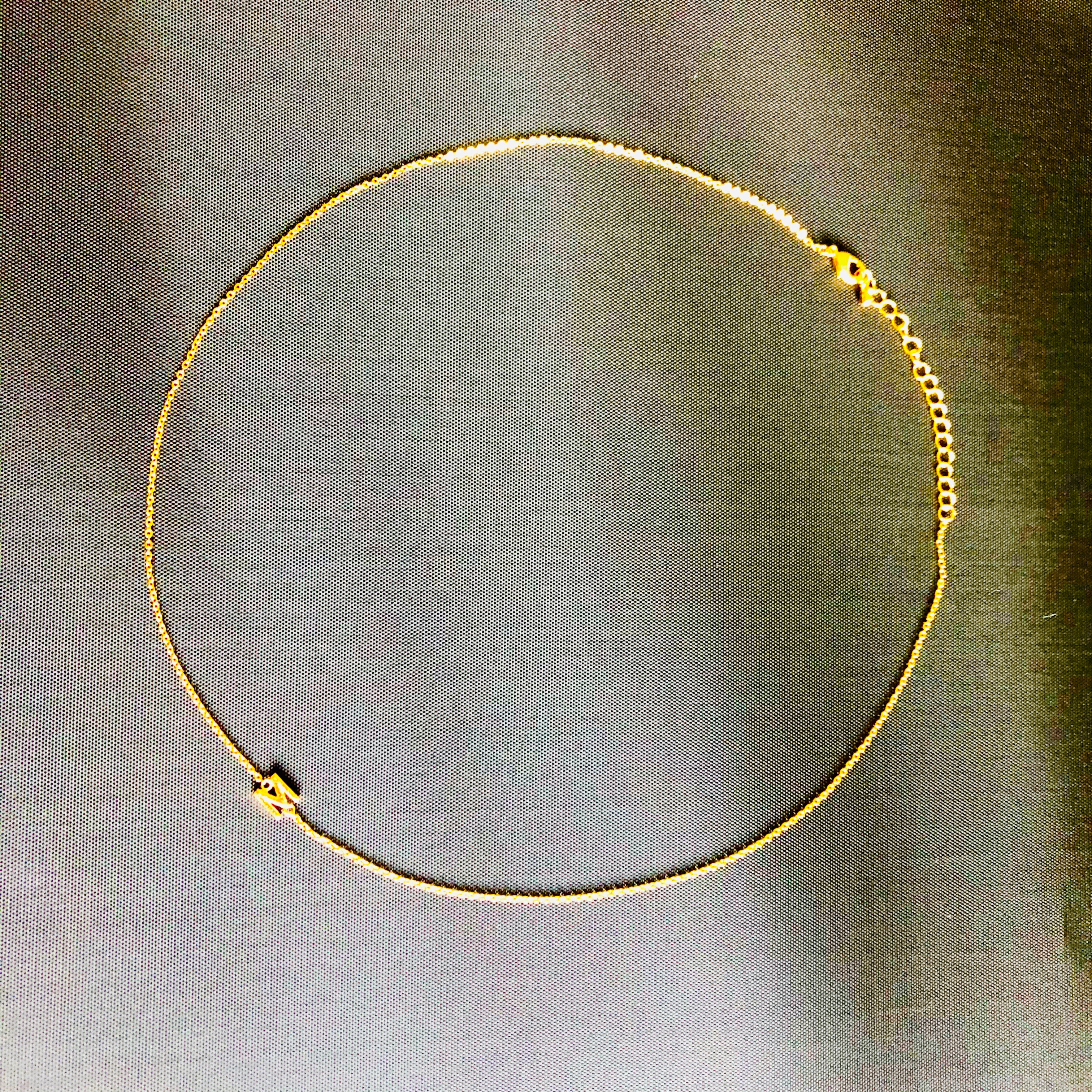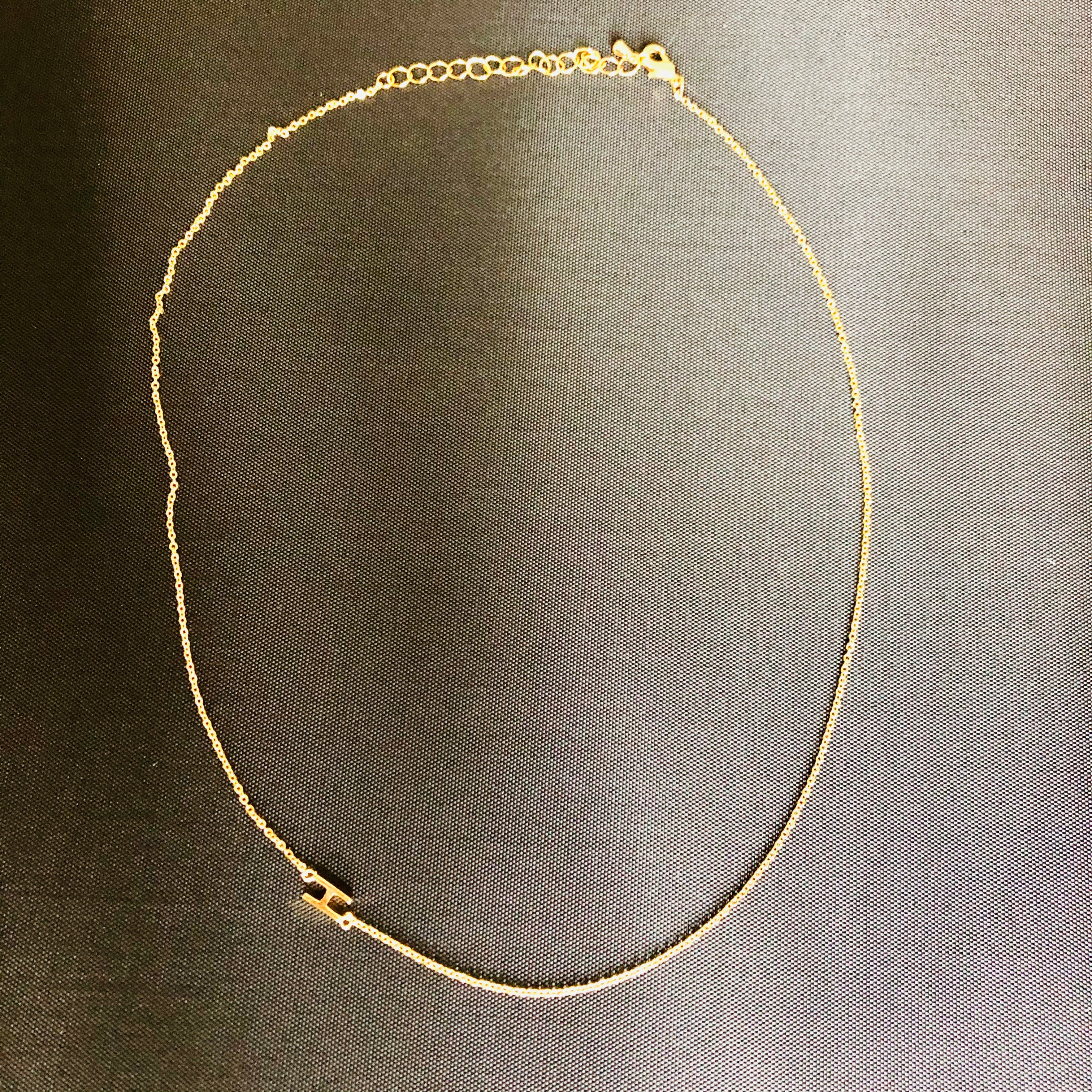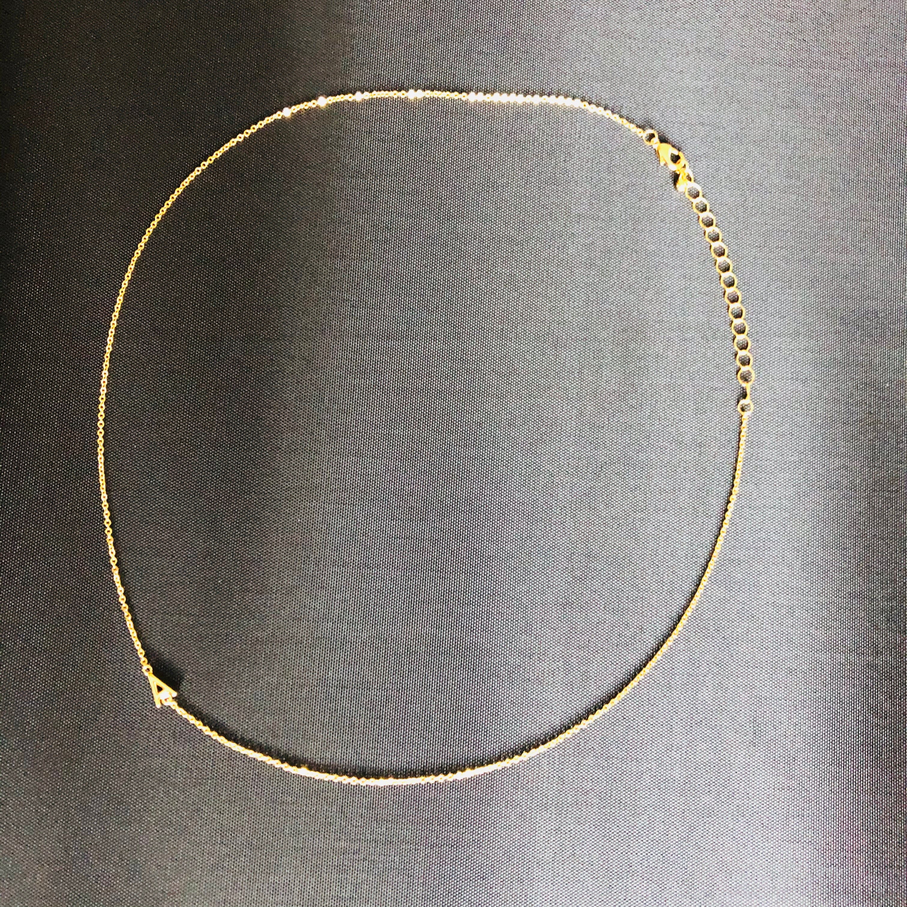 This is a delicate and luxurious little necklet. What makes it unique is that the initial hangs fashionably on the side rather than at the bottom and the initial can be worn either on the left or the right side of the neckline.