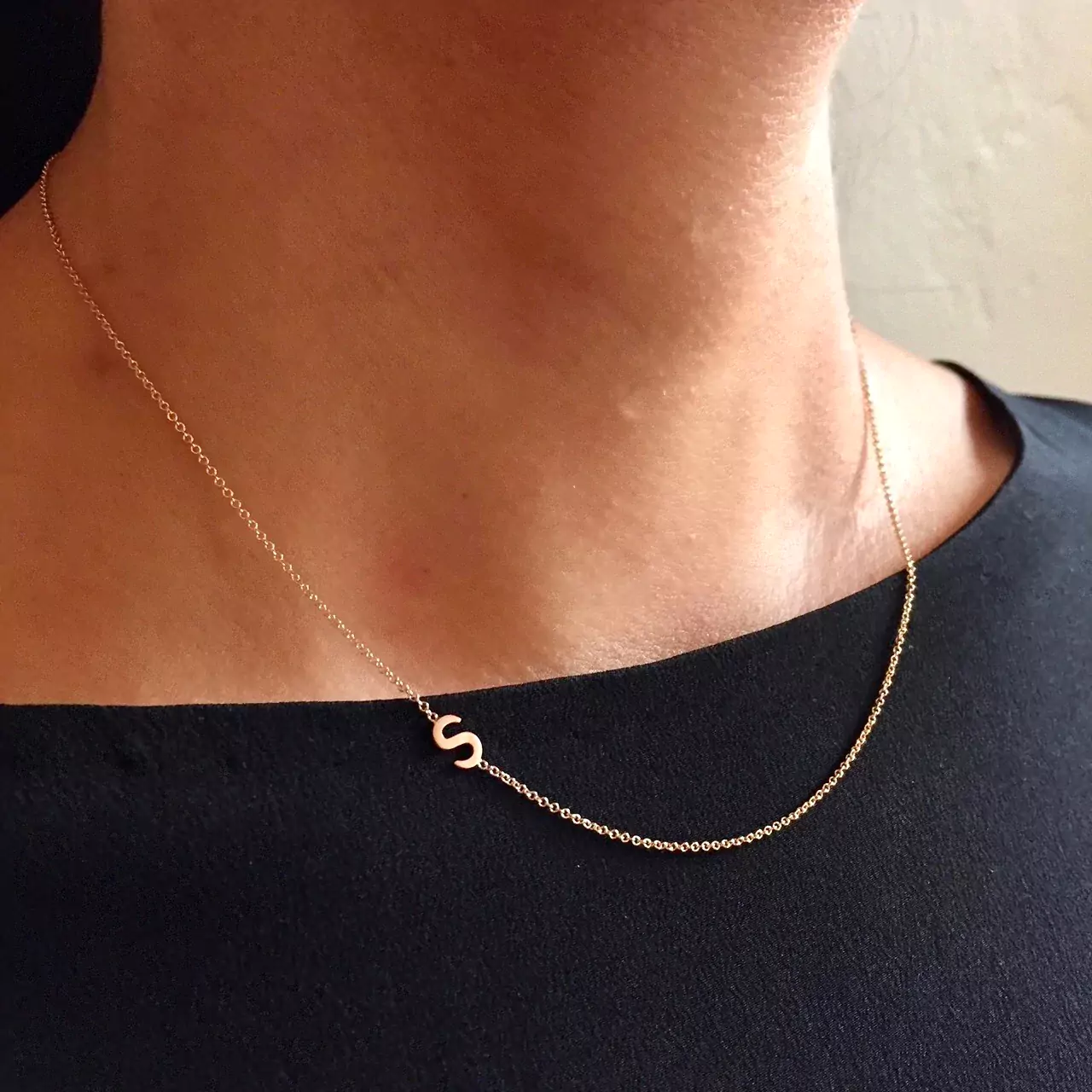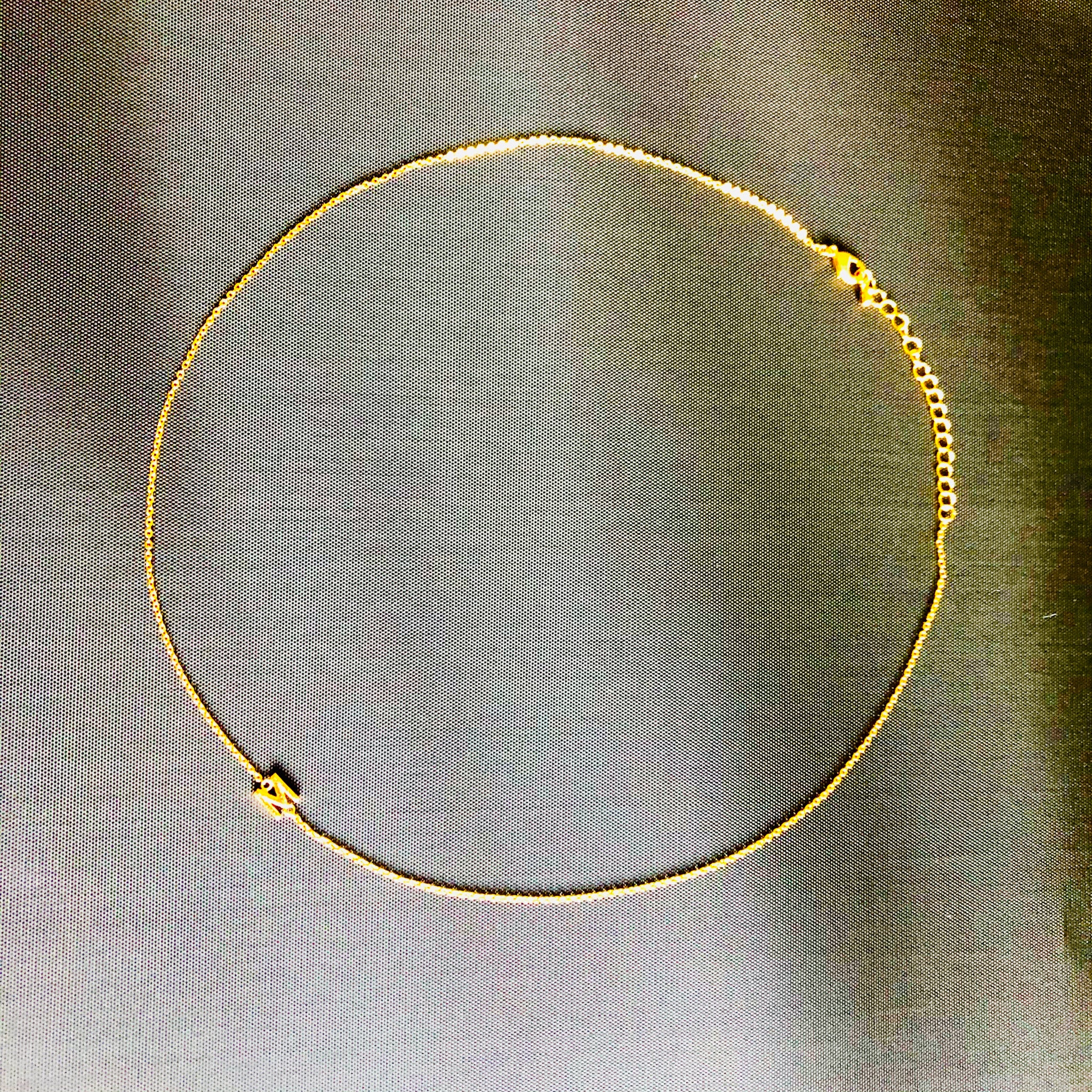 This is a delicate and luxurious little necklet. What makes it unique is that the initial hangs fashionably on the side rather than at the bottom and the initial can be worn either on the left or the right side of the neckline.